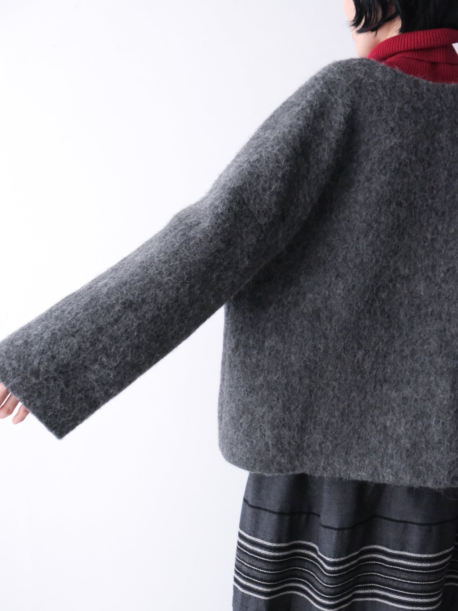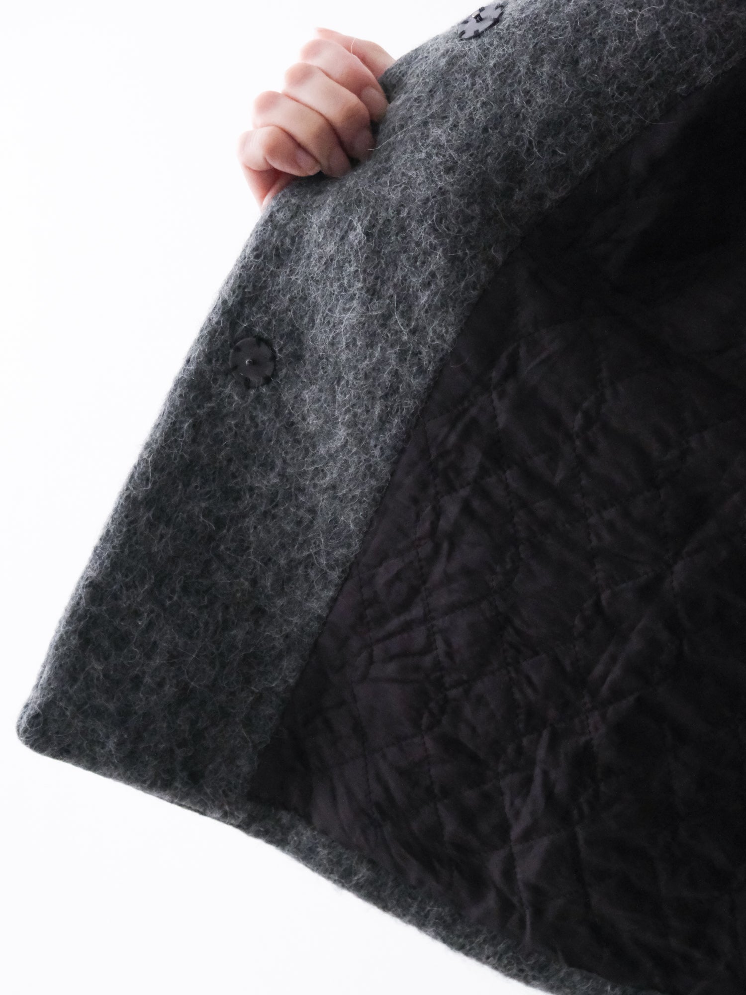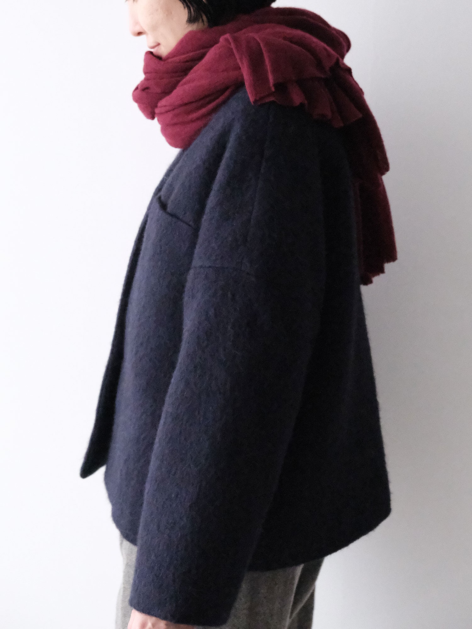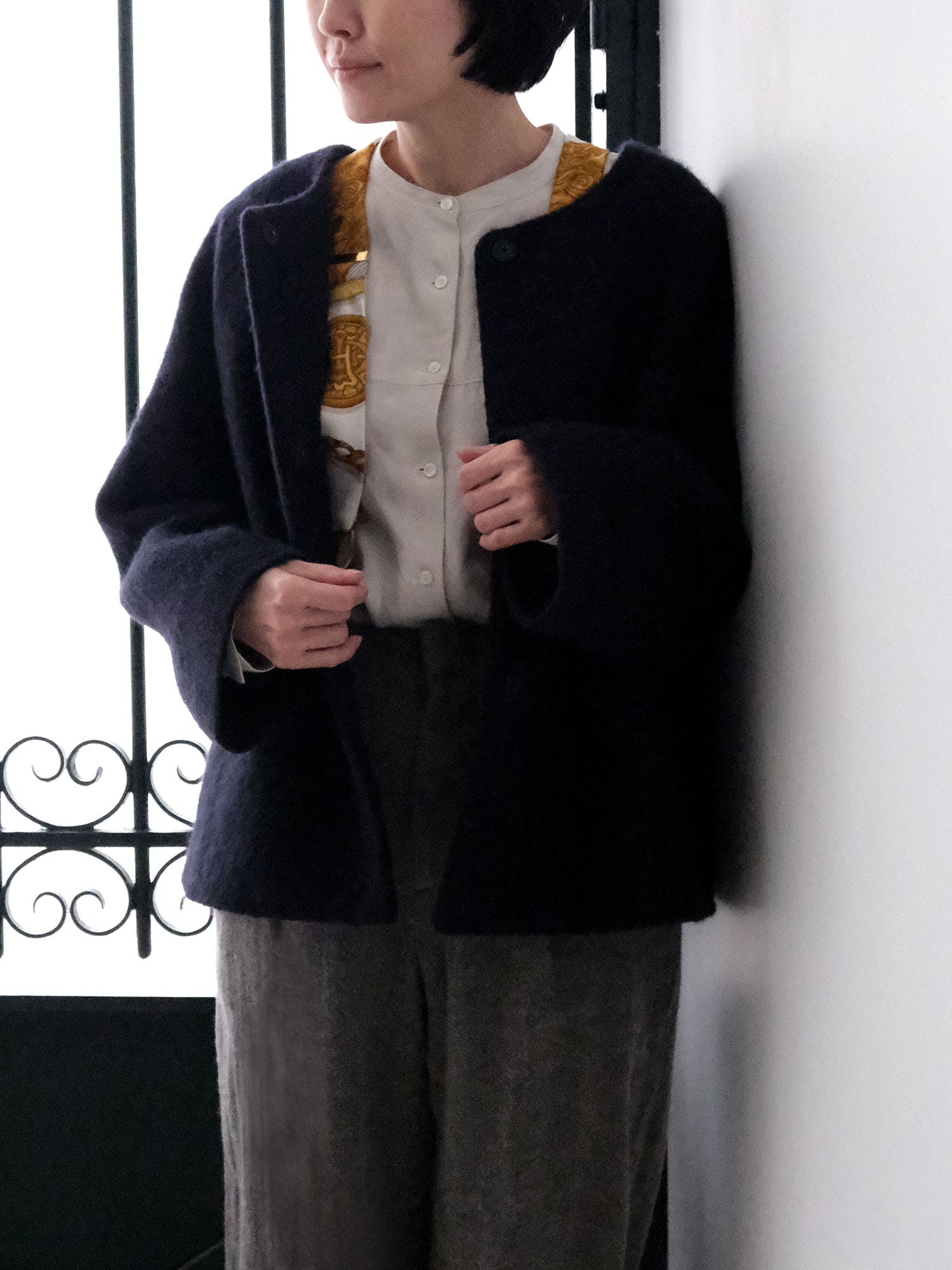 表情豊かな毛足が魅力のシャギーなウール地で仕立てた、ノーカラーのショートコート。薄い中綿入りキルトの裏地であたたかく、軽い着心地です。