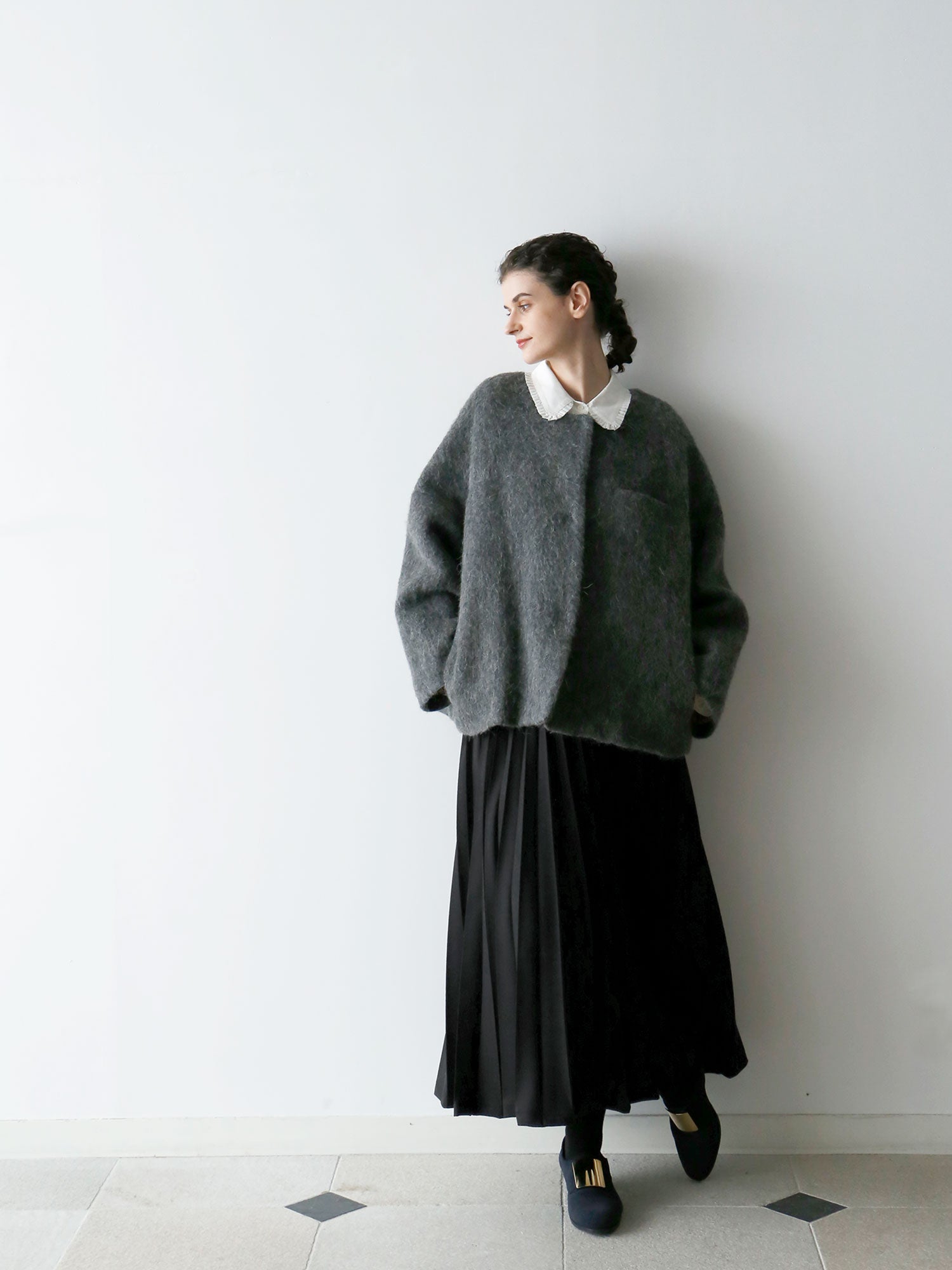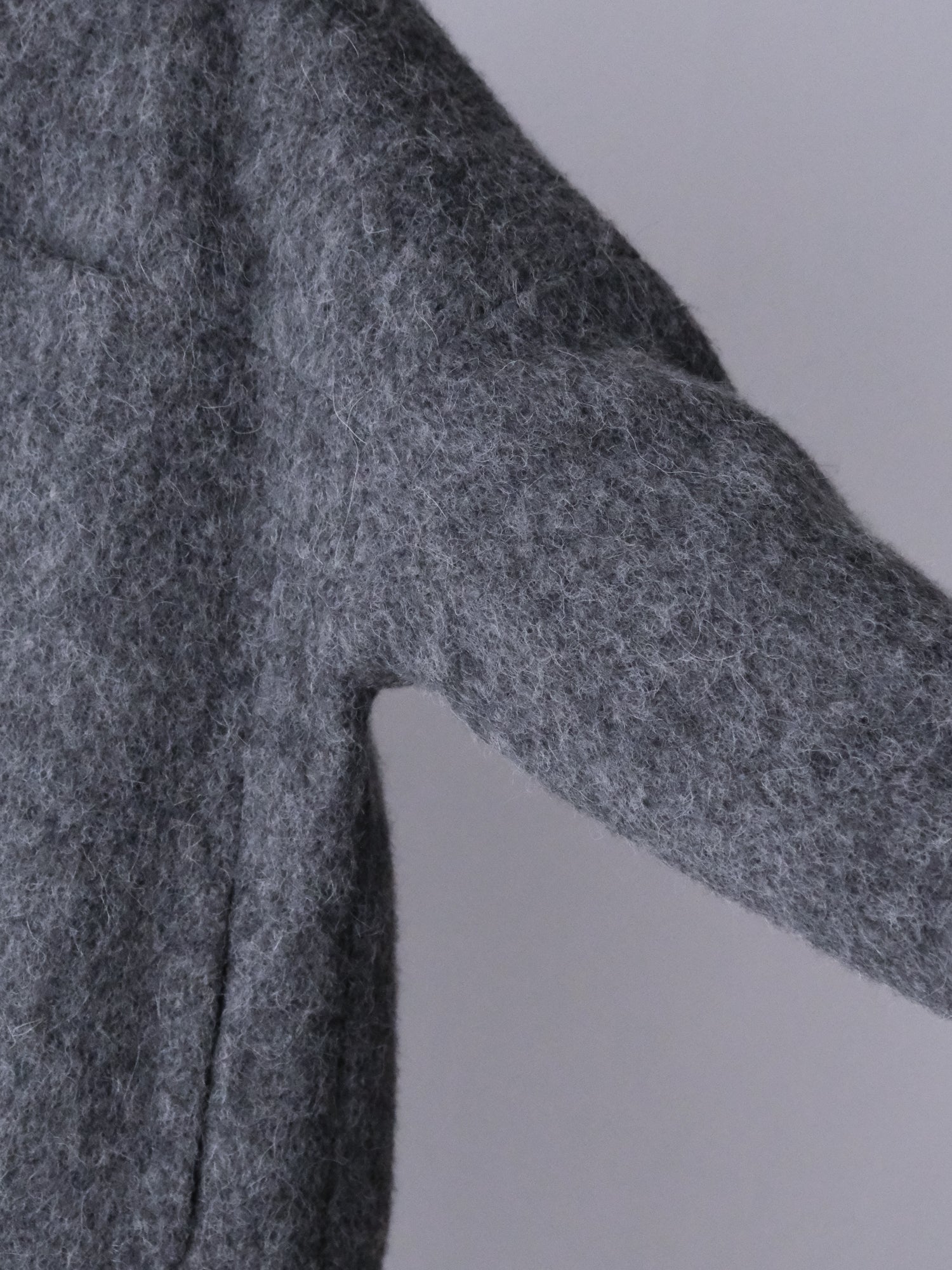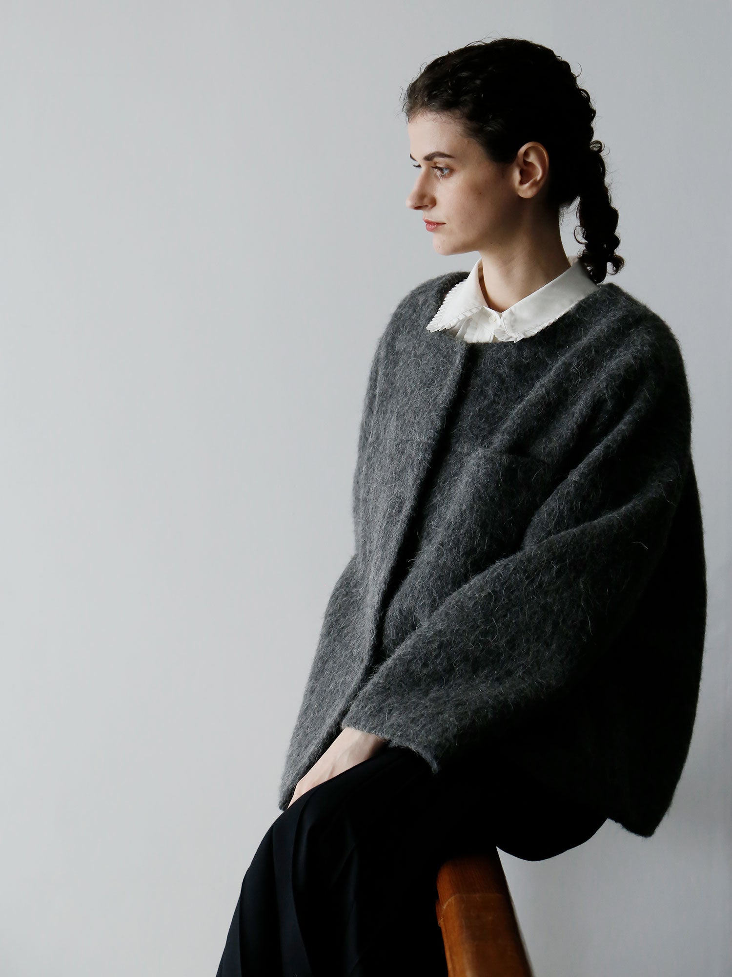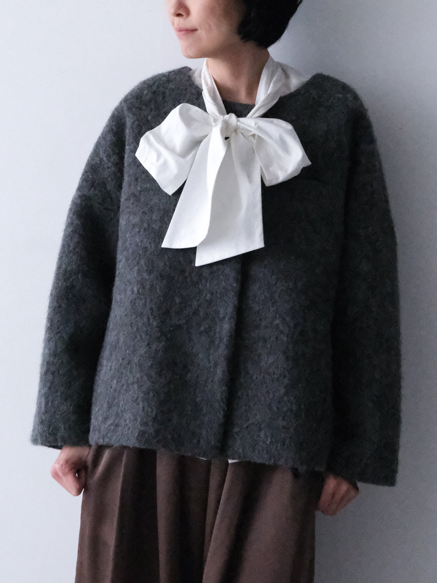表情豊かな毛足が魅力のシャギーなウール地で仕立てた、ノーカラーのショートコート。薄い中綿入りキルトの裏地であたたかく、軽い着心地です。