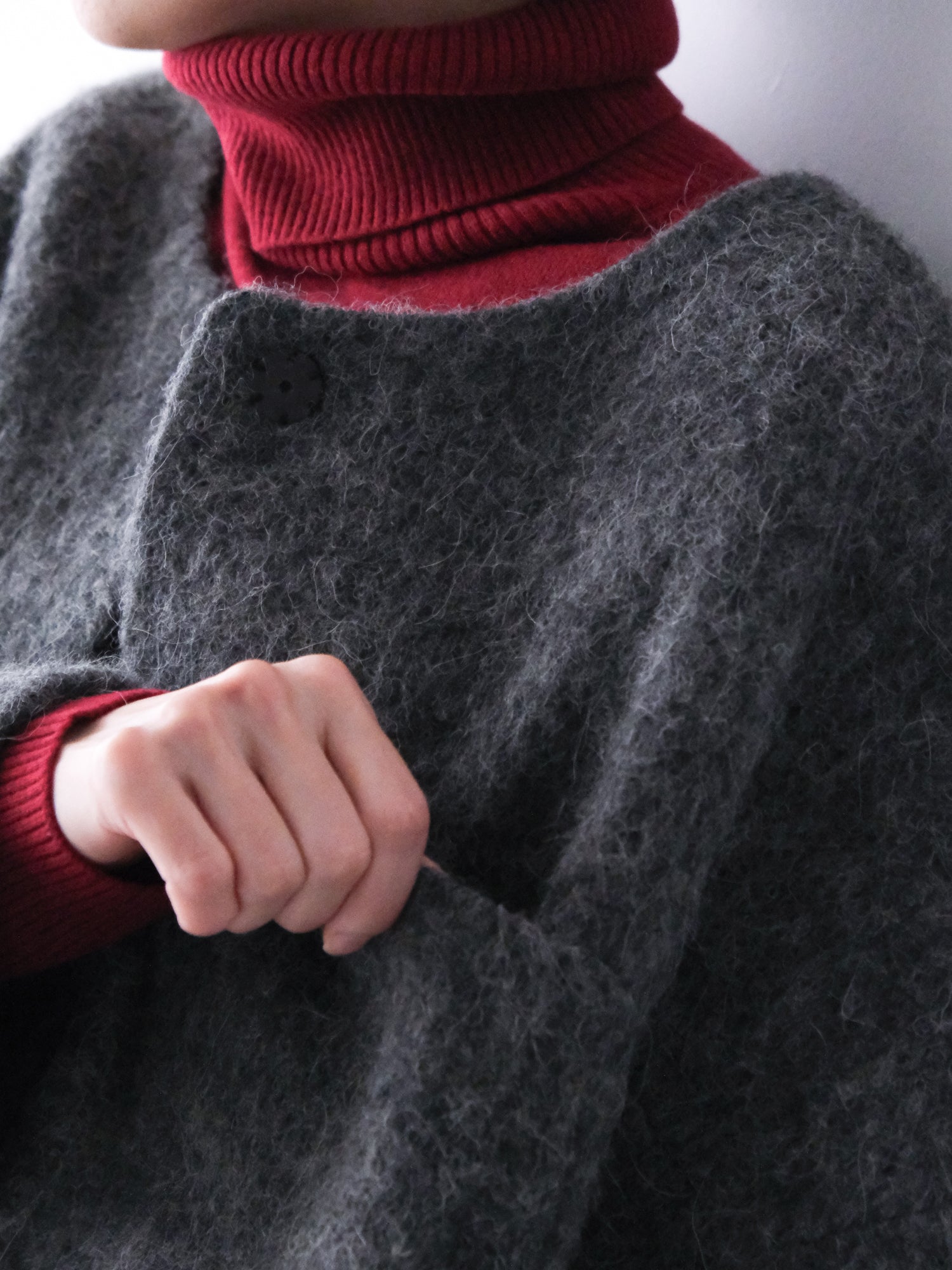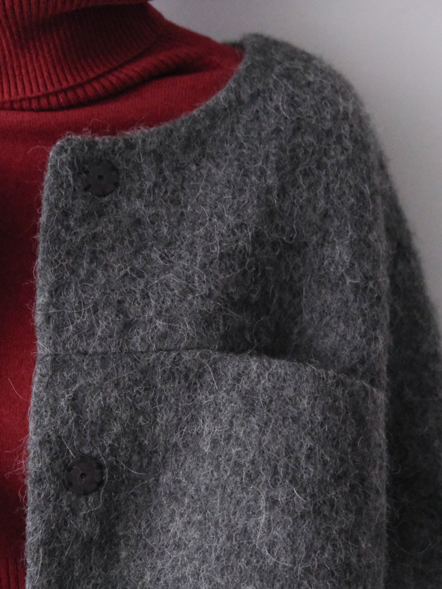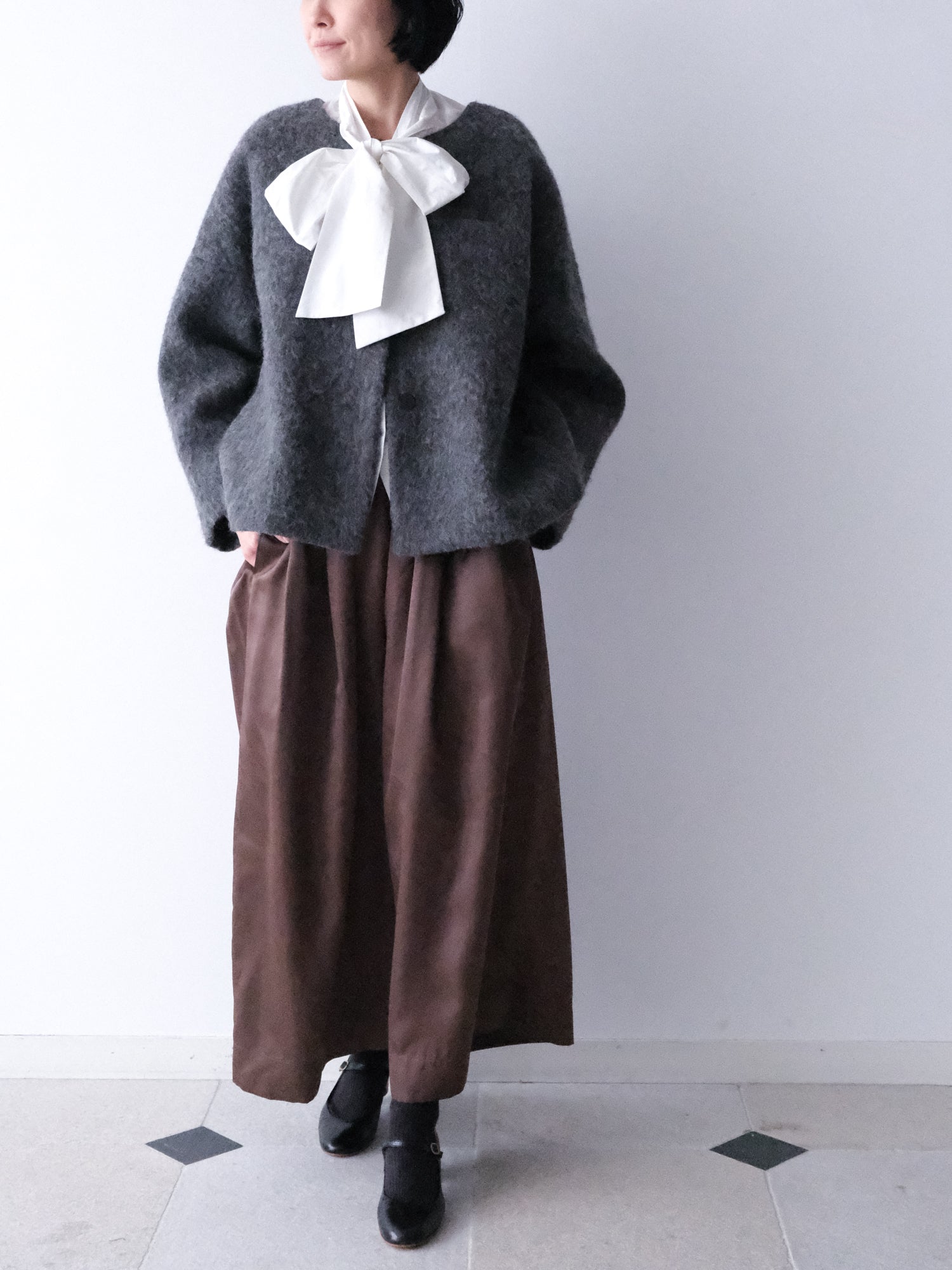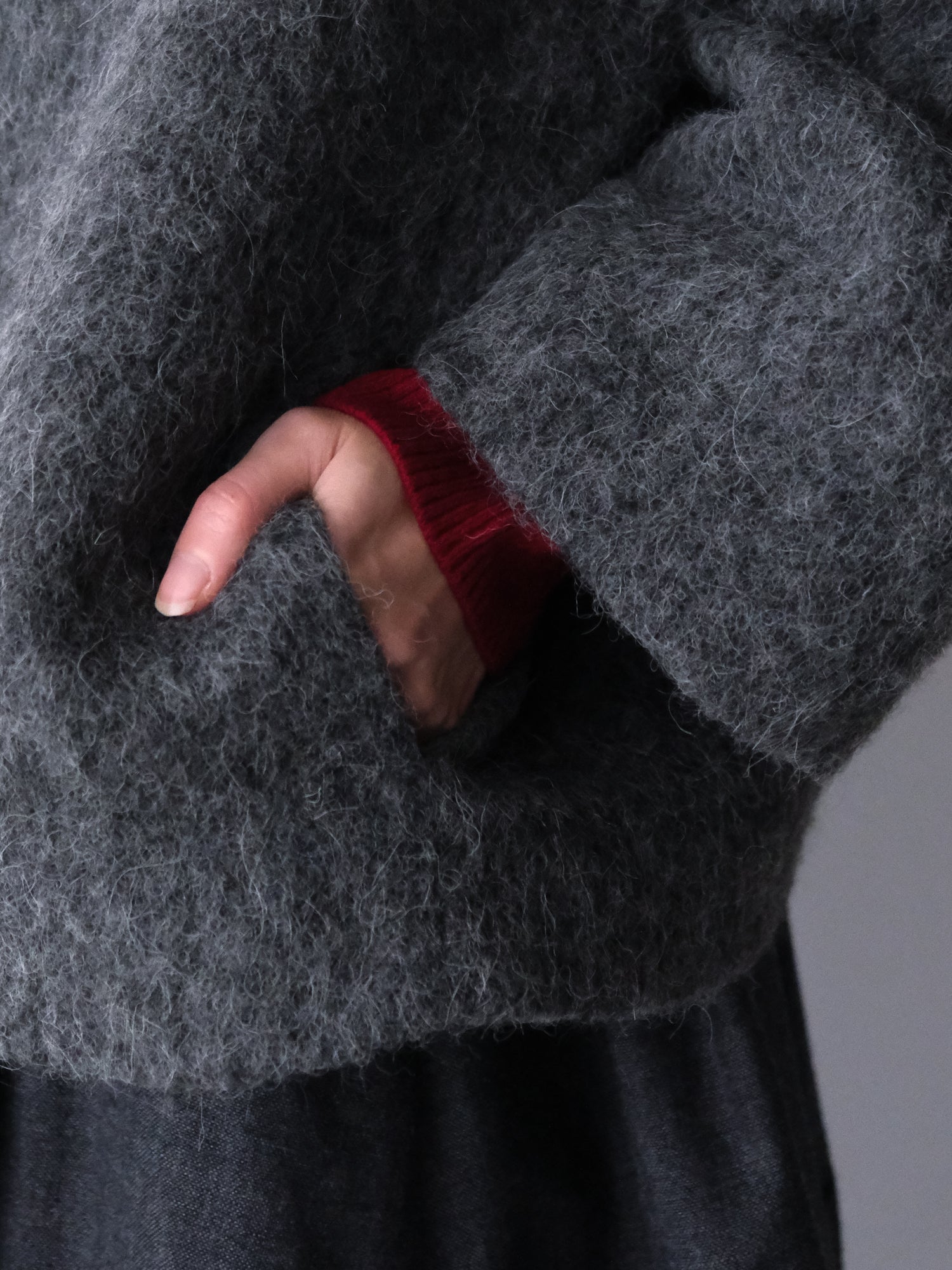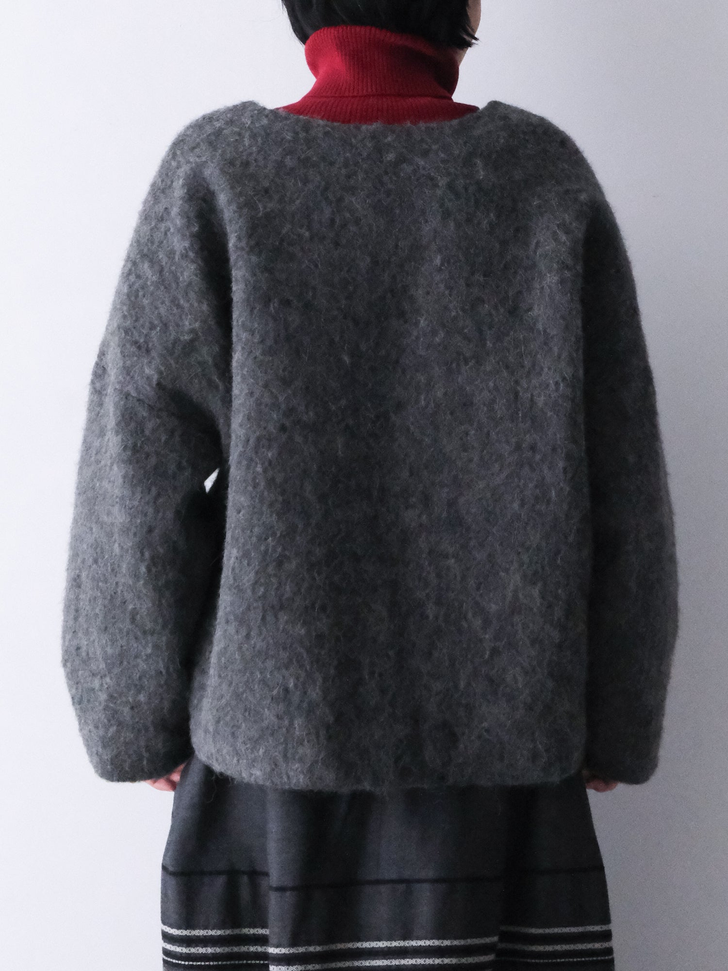 アルパカ混のシャギーなウール地は、その長い毛足が表情豊かです。シャルボヌーとマランの2色をご用意しました。