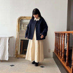 トップスのおしゃれを楽しめる、軽くてシンプルなノーカラーのショートコート。スカート、パンツ、ワンピース、それぞれのバランスをご紹介します。