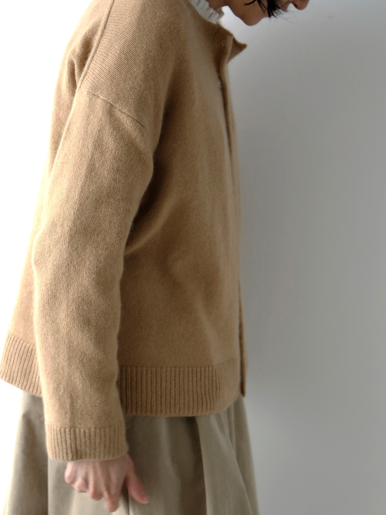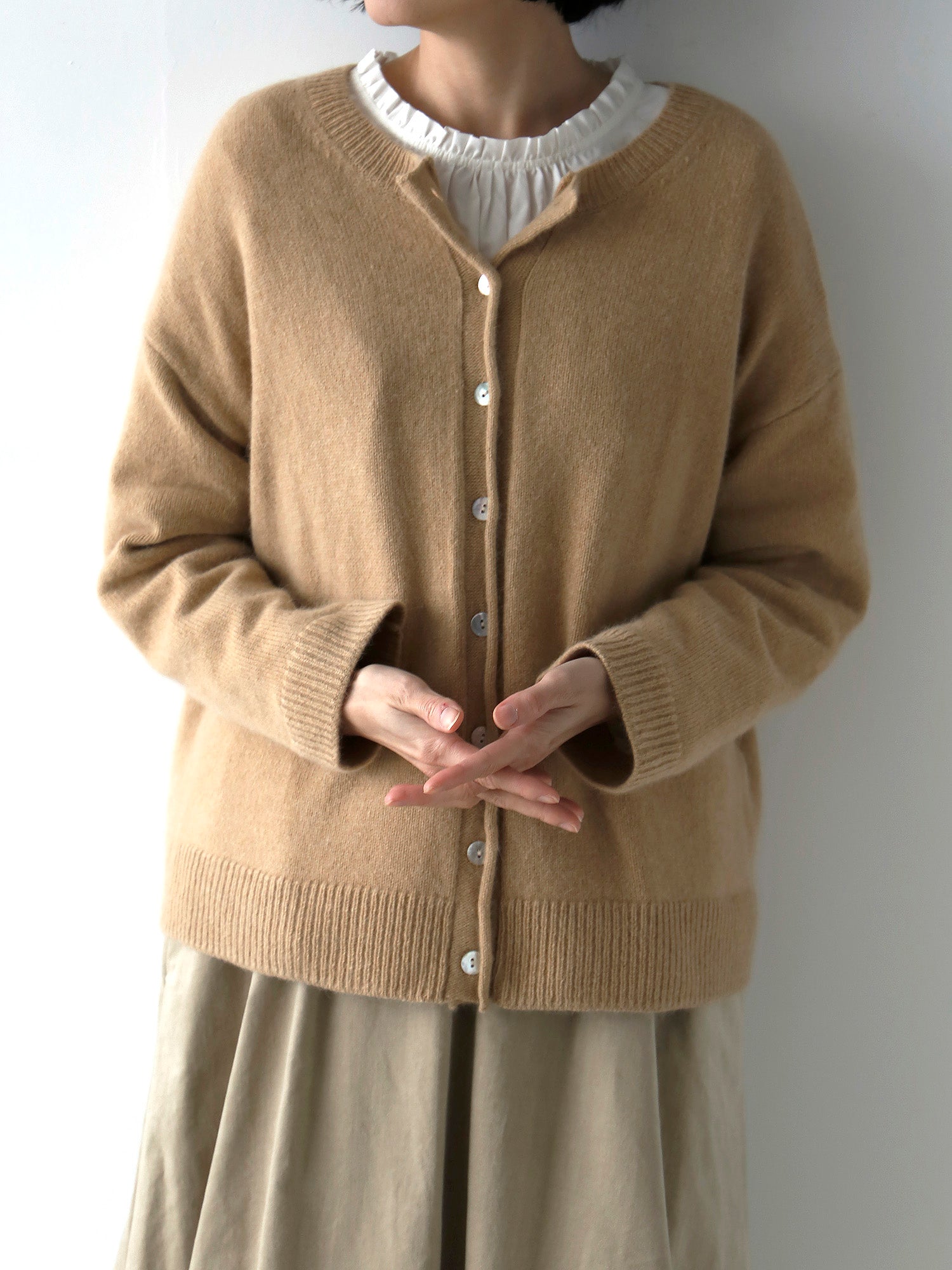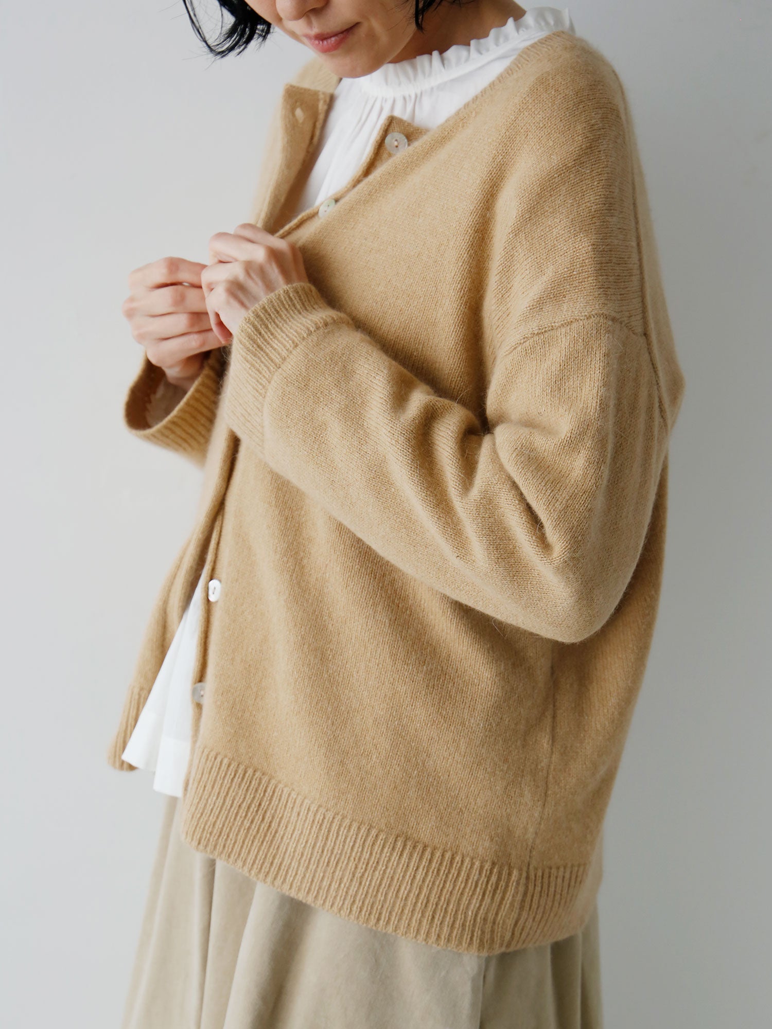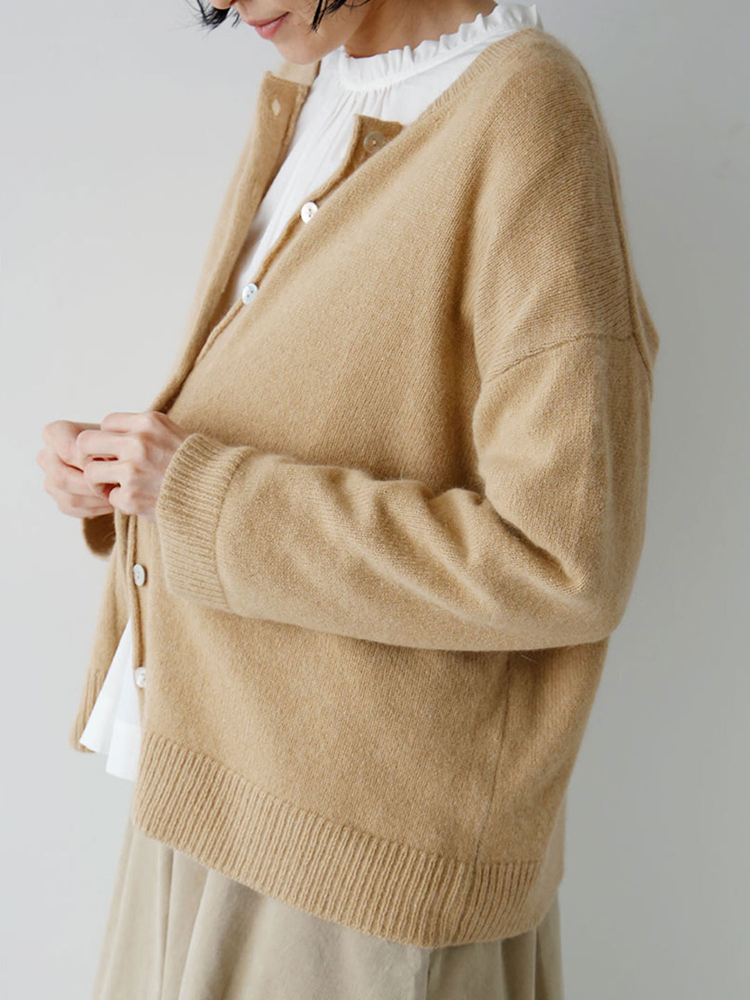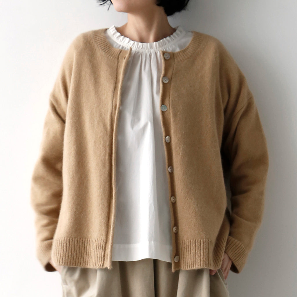 やわらかな肌触りのアンゴラウールで、カーディガンをつくりました。ゆったりしていて、軽く、着心地のよい仕上がりです。あたたかみある4カラーをご用意しました。