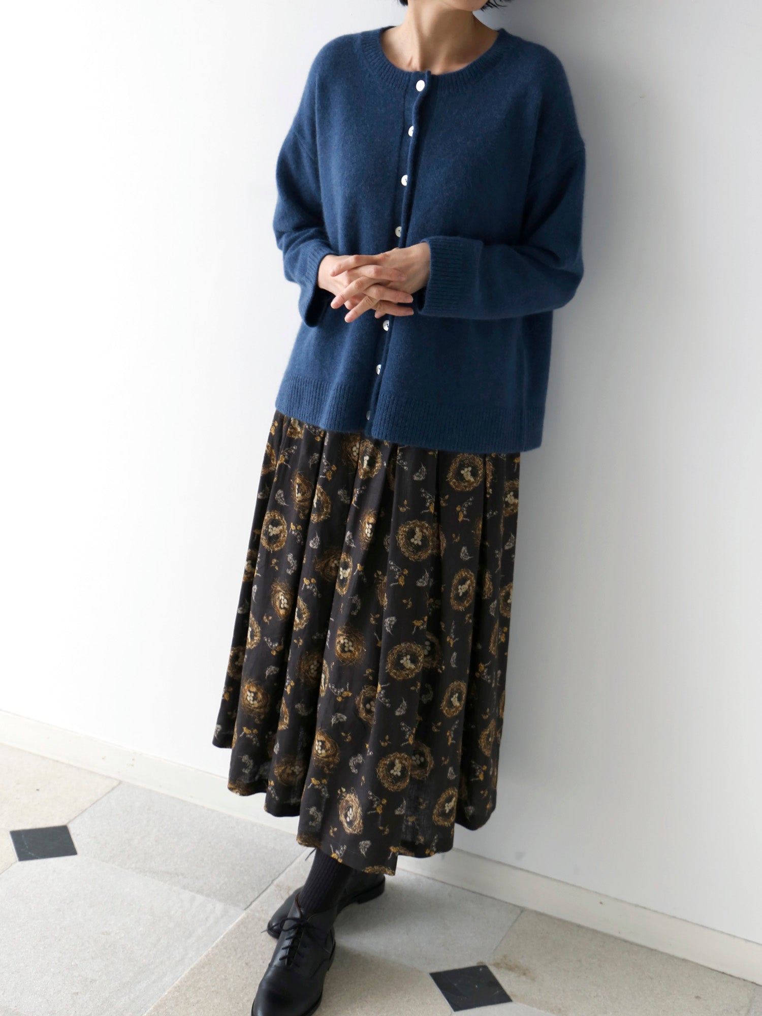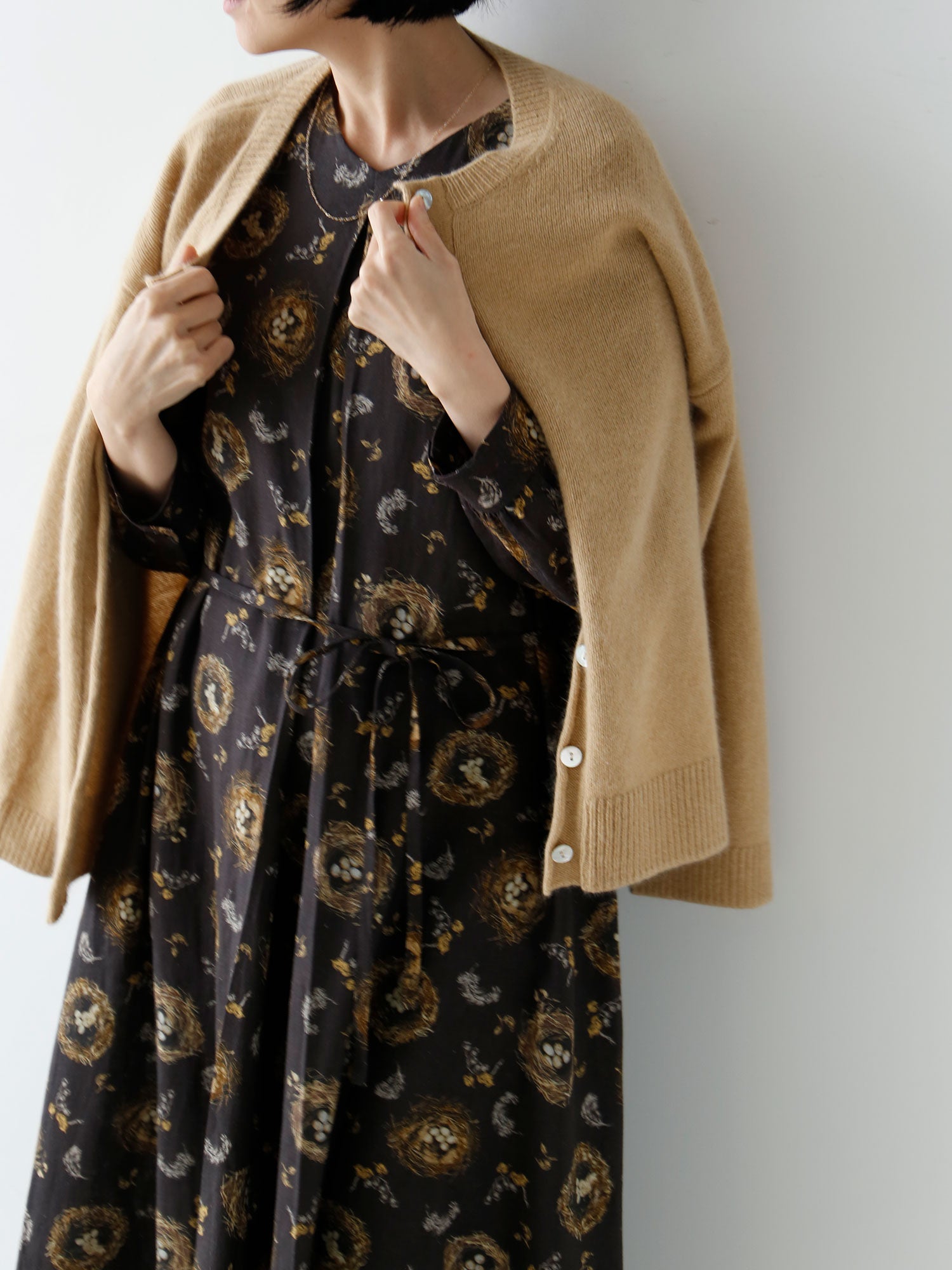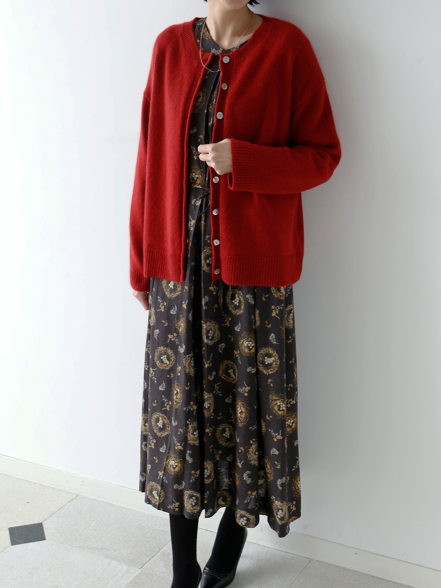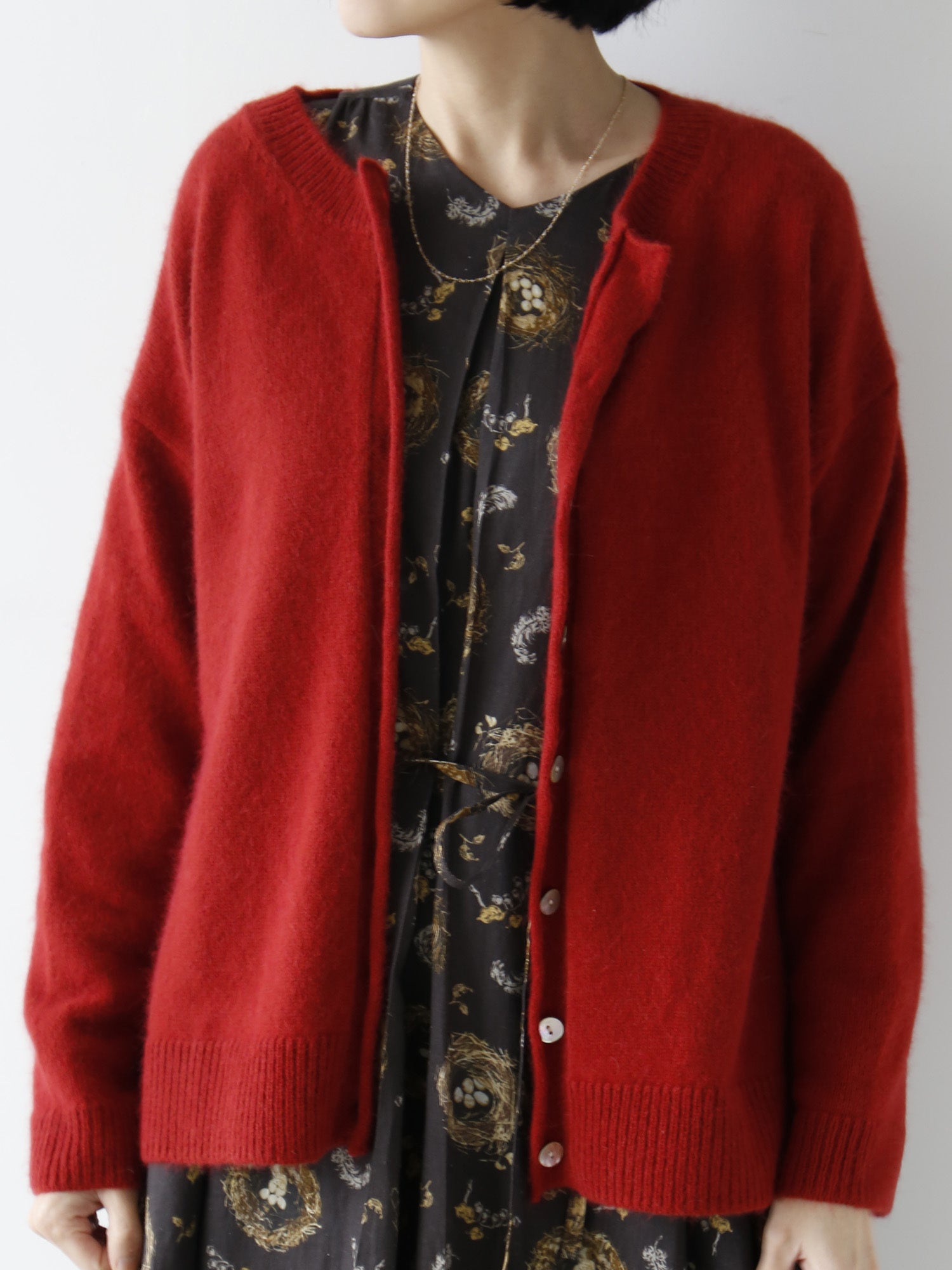 温度調節できるニットカーディガンは秋冬の必需品。カットソーと重ねてトップスとして着たり、柄物ワンピースに羽織ったり、肩掛けスタイルも。さまざまなコーディネートをお楽しみください。
