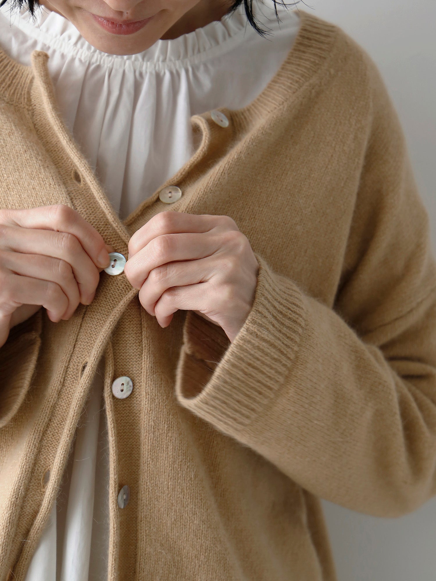 フロントの貝ボタンがアクセント。