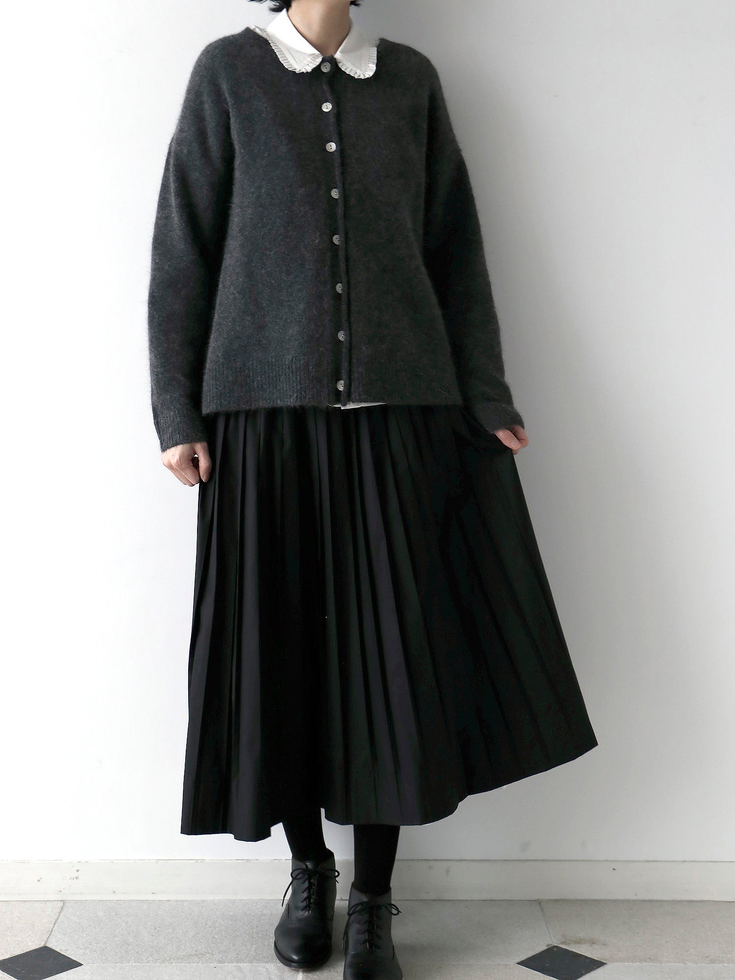 デザイン性のある襟を合わせてブラウスを主役に。白×黒×グレーのシックな大人コーデ。