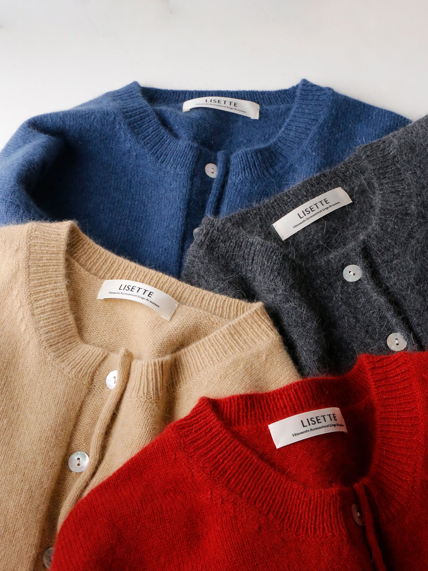 リゼッタがこの冬のためにつくったカーディガン「レティシア・bis」。ウールにアンゴラが混ざったふわふわとした肌触り。やわらかなアンゴラの毛足がやさしい雰囲気をつくります。