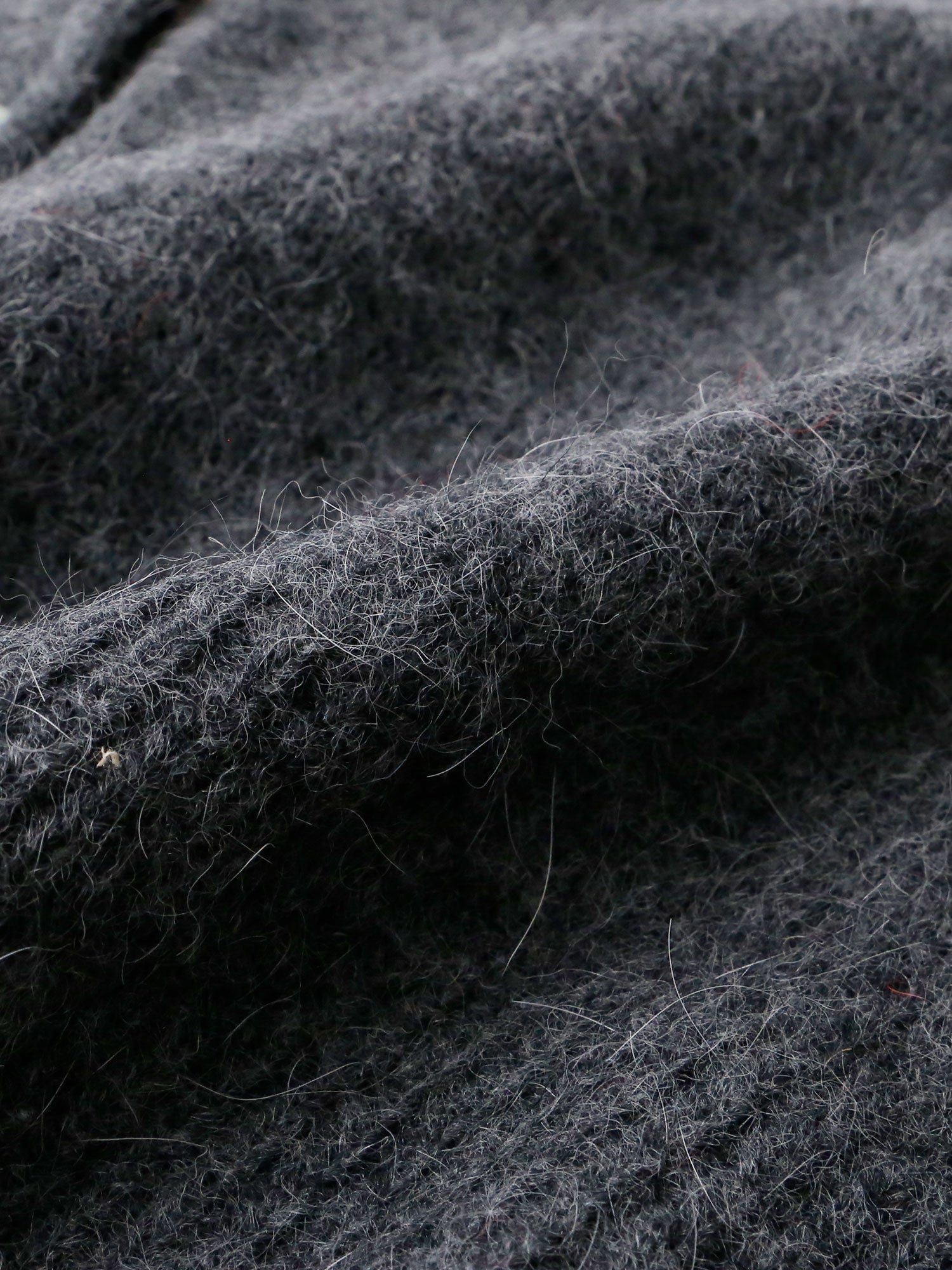 ふわふわとした柔らかな白い毛が混ざった濃い目のグレー。上品で合わせやすい大人カラー。