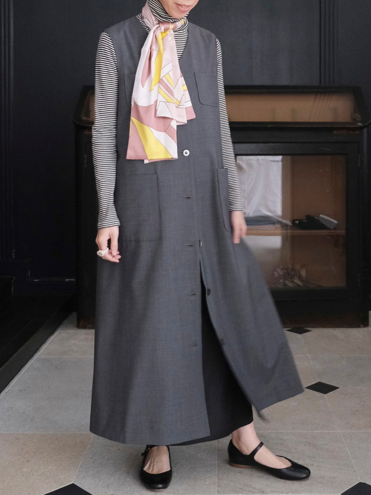 タートルネックとスカートのコーデに、ケイシーをロングジレとして。きちんと感あるアイテムだからジレとしてラフに着ても大人っぽくまとまります。▲身長157cm、着用サイズ:36(トップス・スカーフ:私物)