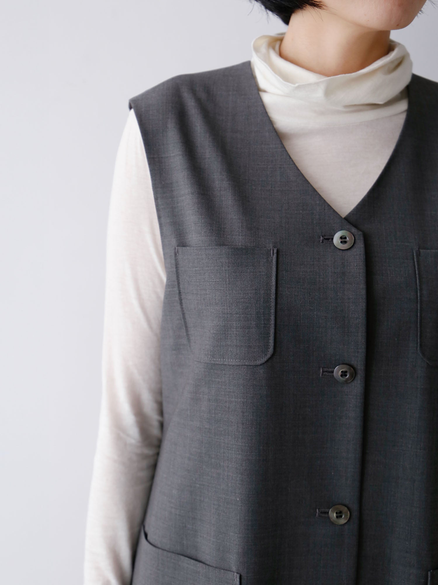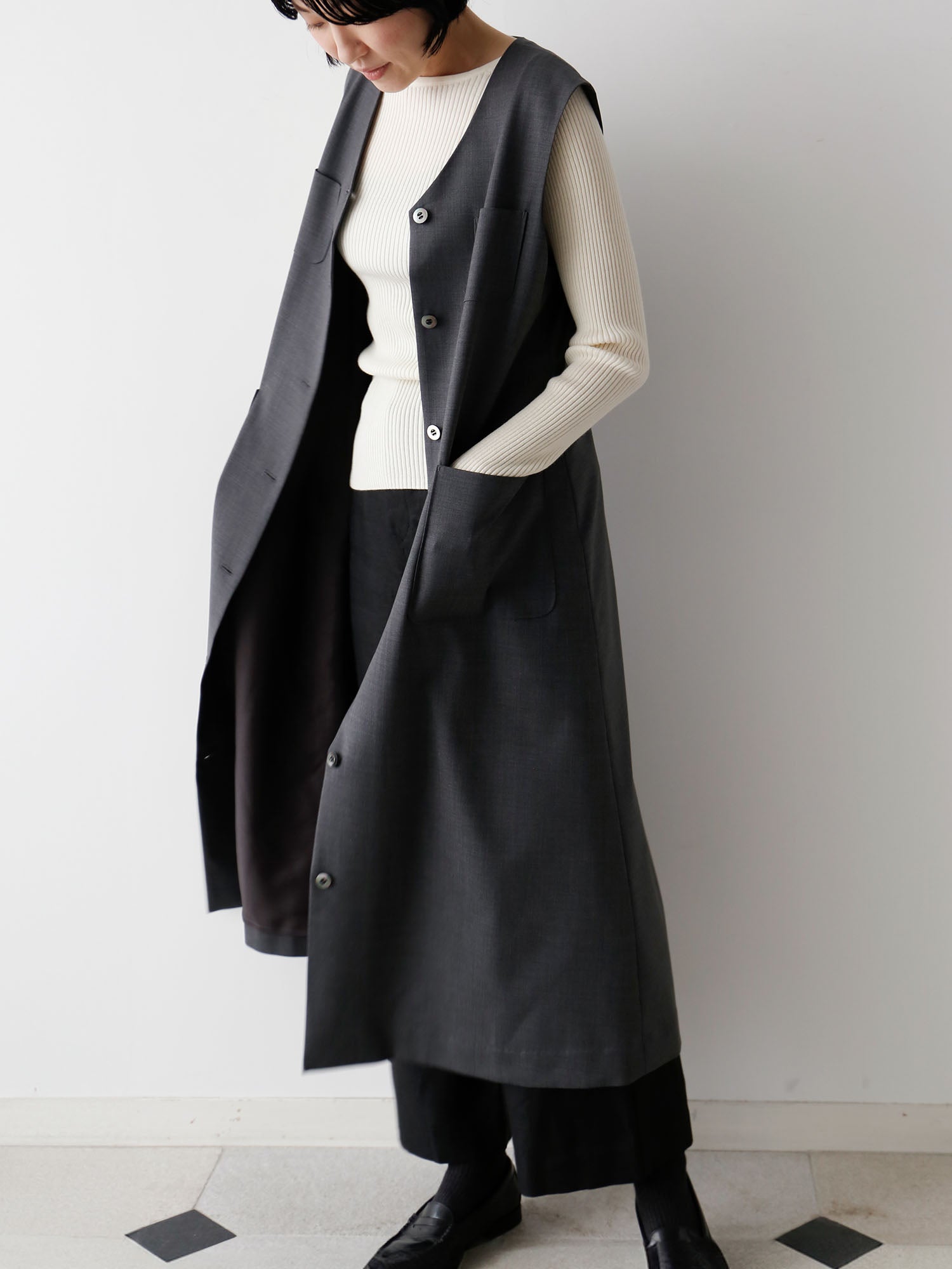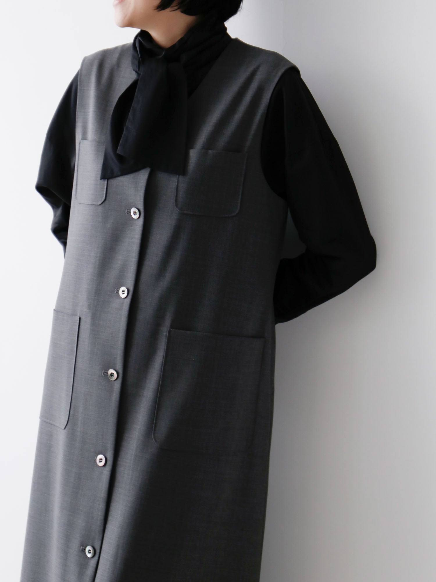 メンズライクな梳毛のサマーウールで仕立てた、端正な表情のワンピース。ロングジレとしても着られるので着回し力が抜群。