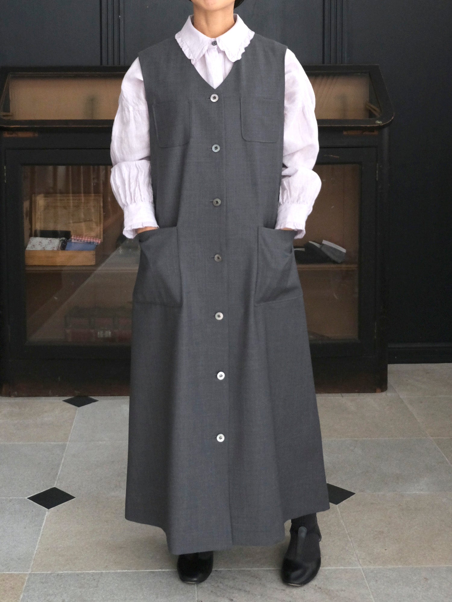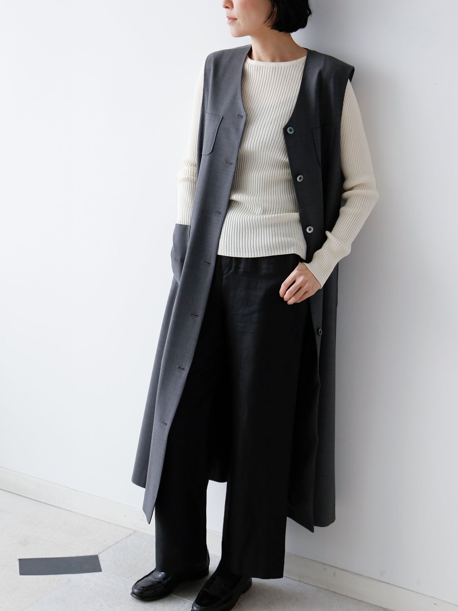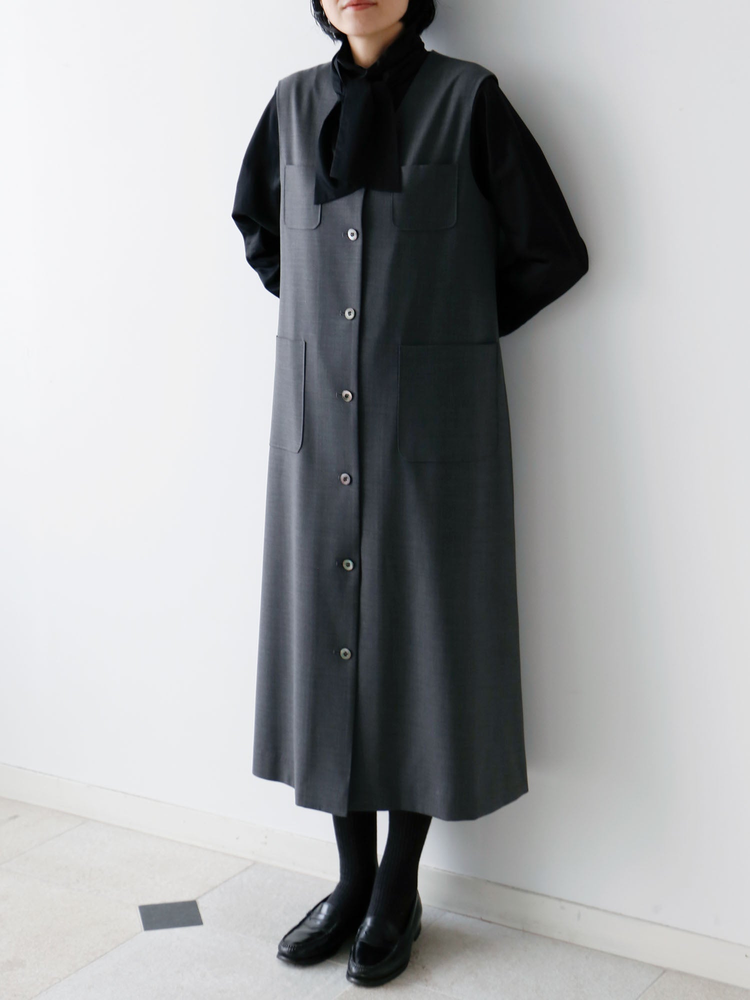 メンズライクな梳毛のサマーウールで仕立てた、端正な表情のワンピース。ロングジレとしても着られるので着回し力が抜群。