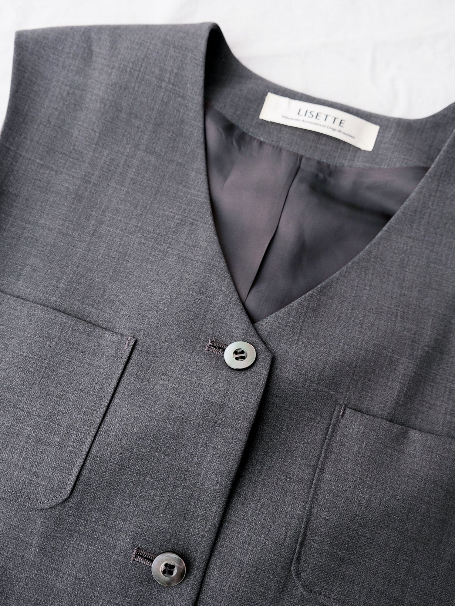 裏地付きで滑りが良く、ボトムスを重ねたときも足さばきは軽やか。ボタンは天然の貝を加工した黒蝶貝。ひとつひとつ輝きの異なる表情豊かなボタンです。