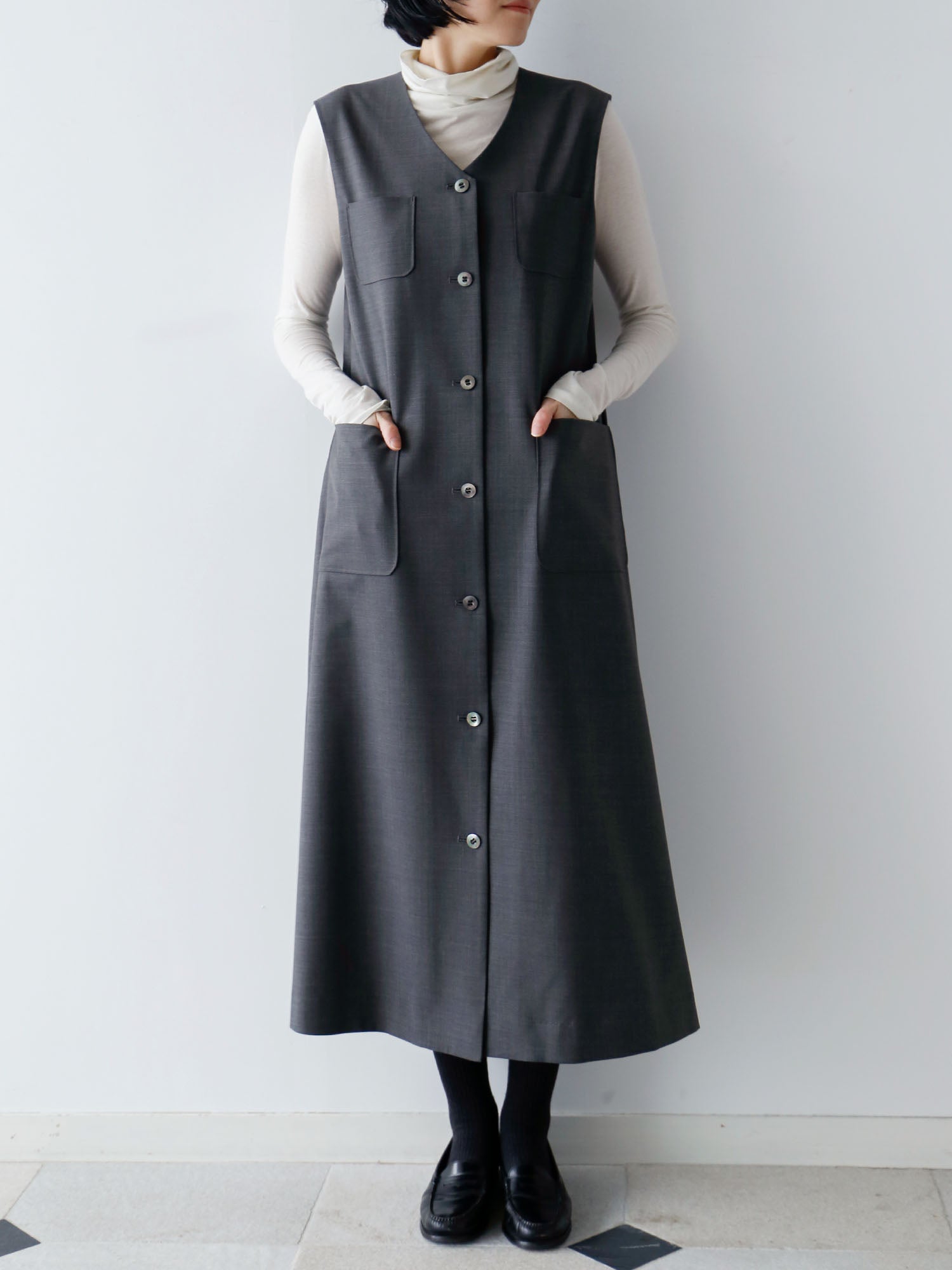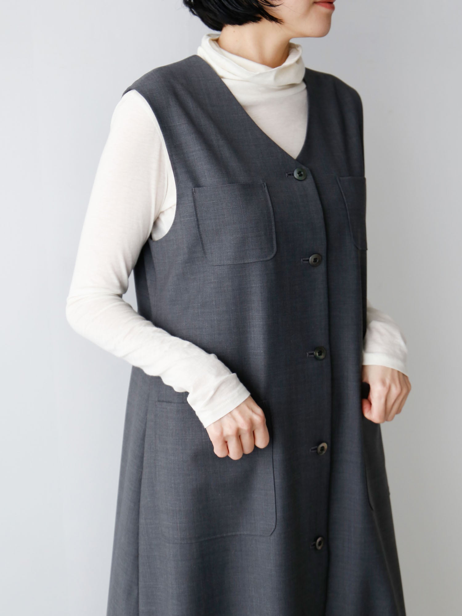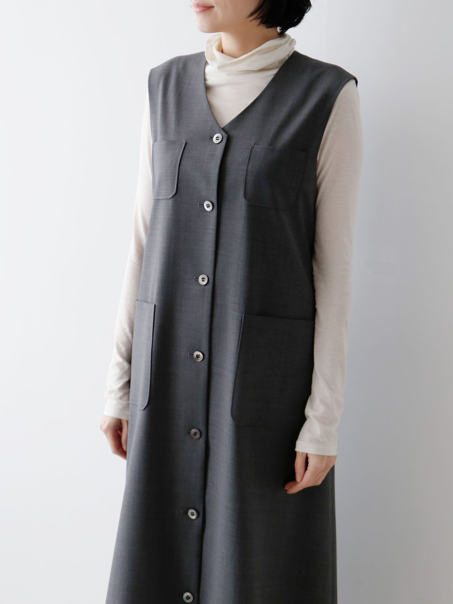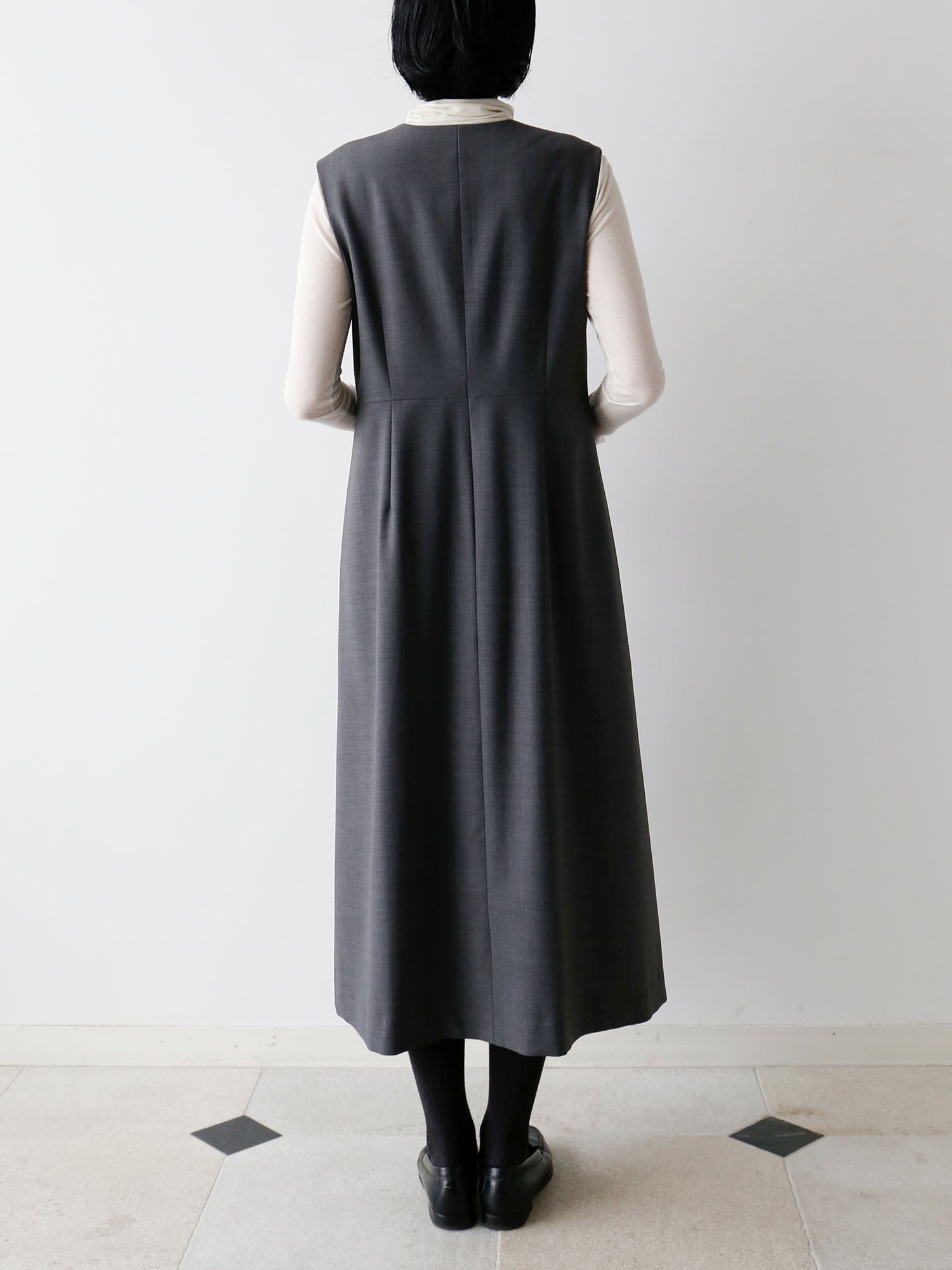 サマーウールで仕立てたワンピースが登場。すっきりとした「ワンピース」としても、着こなしのアクセントになる「ジレ」としても着られる便利なアイテム。