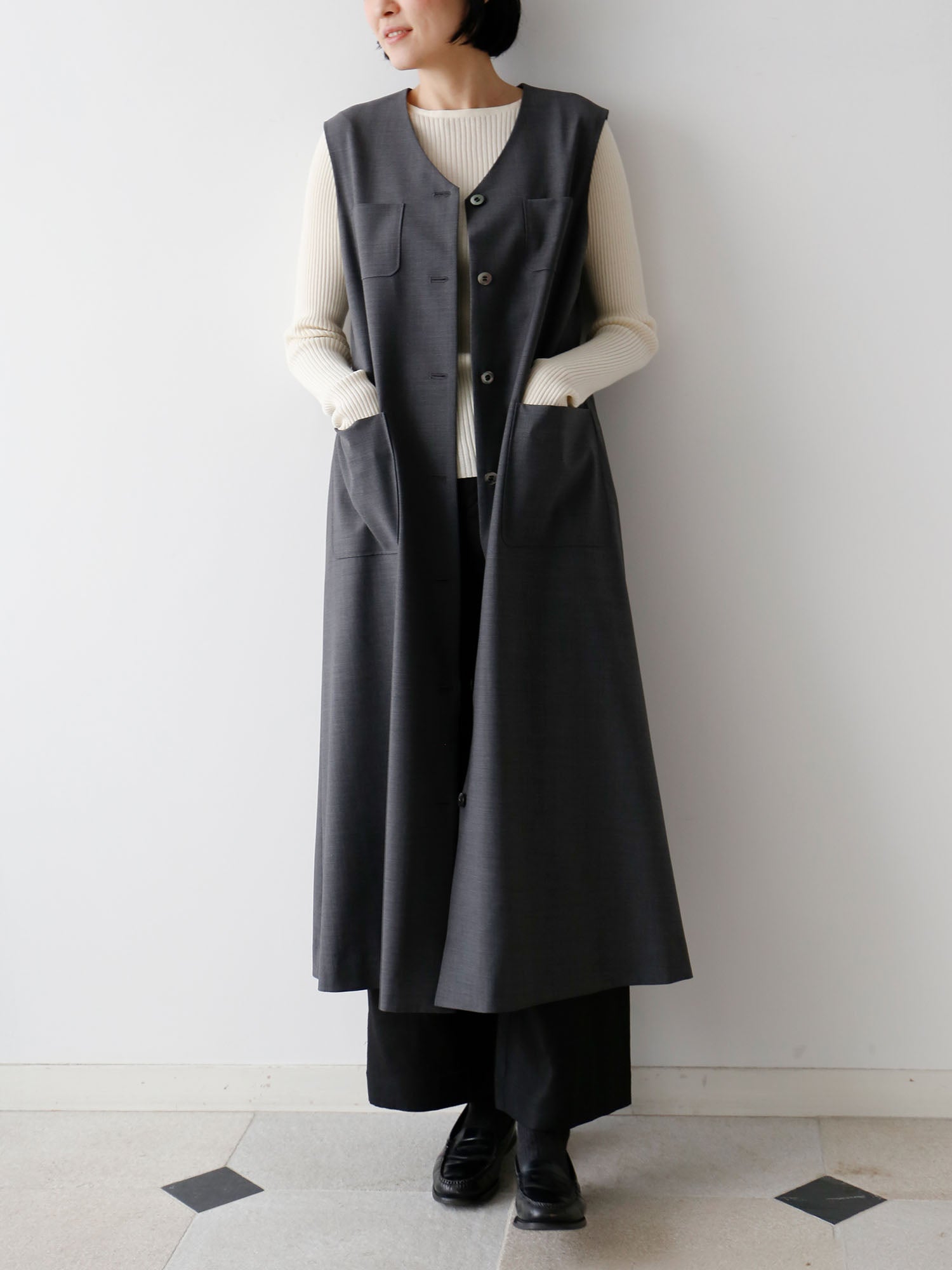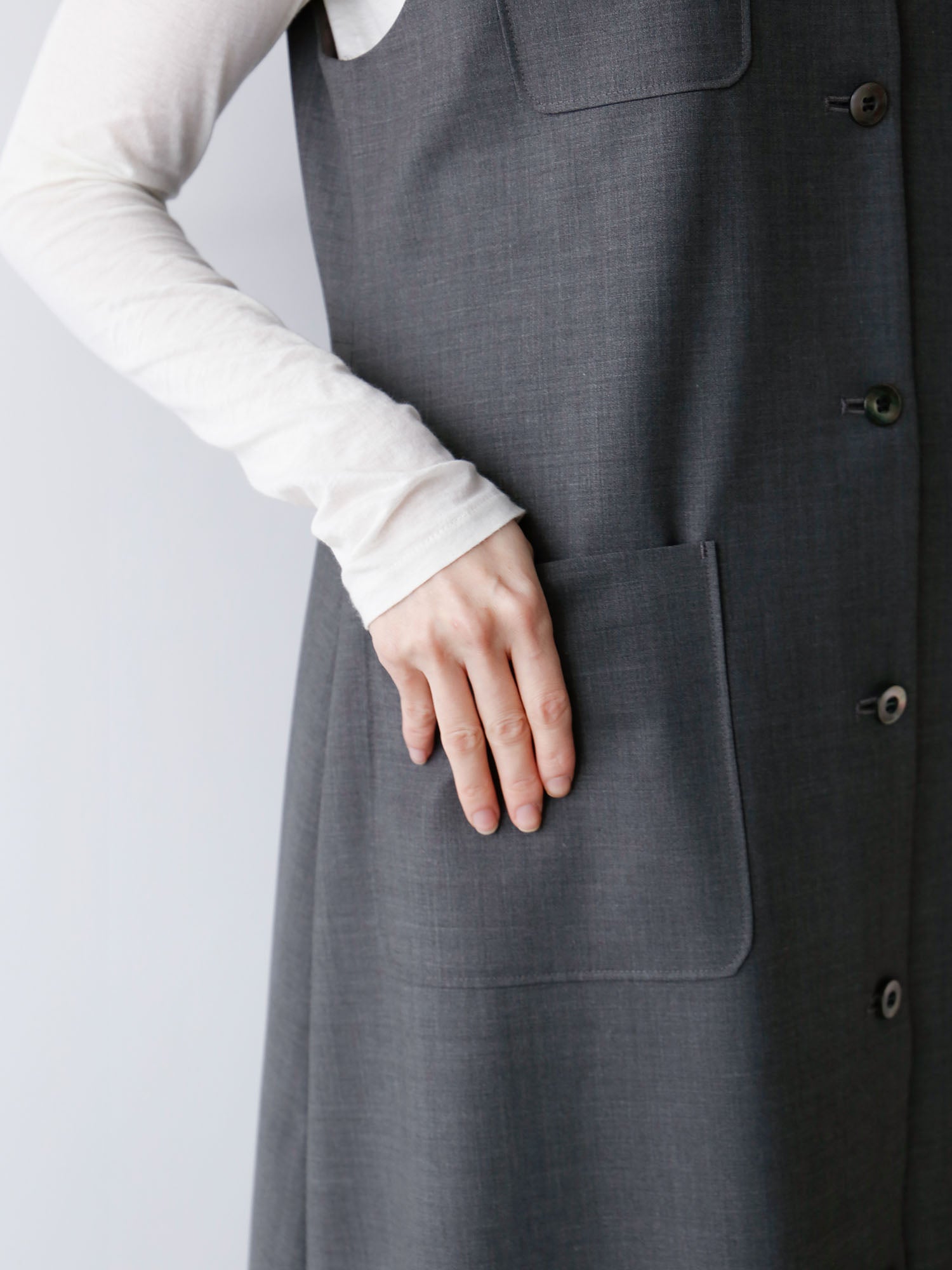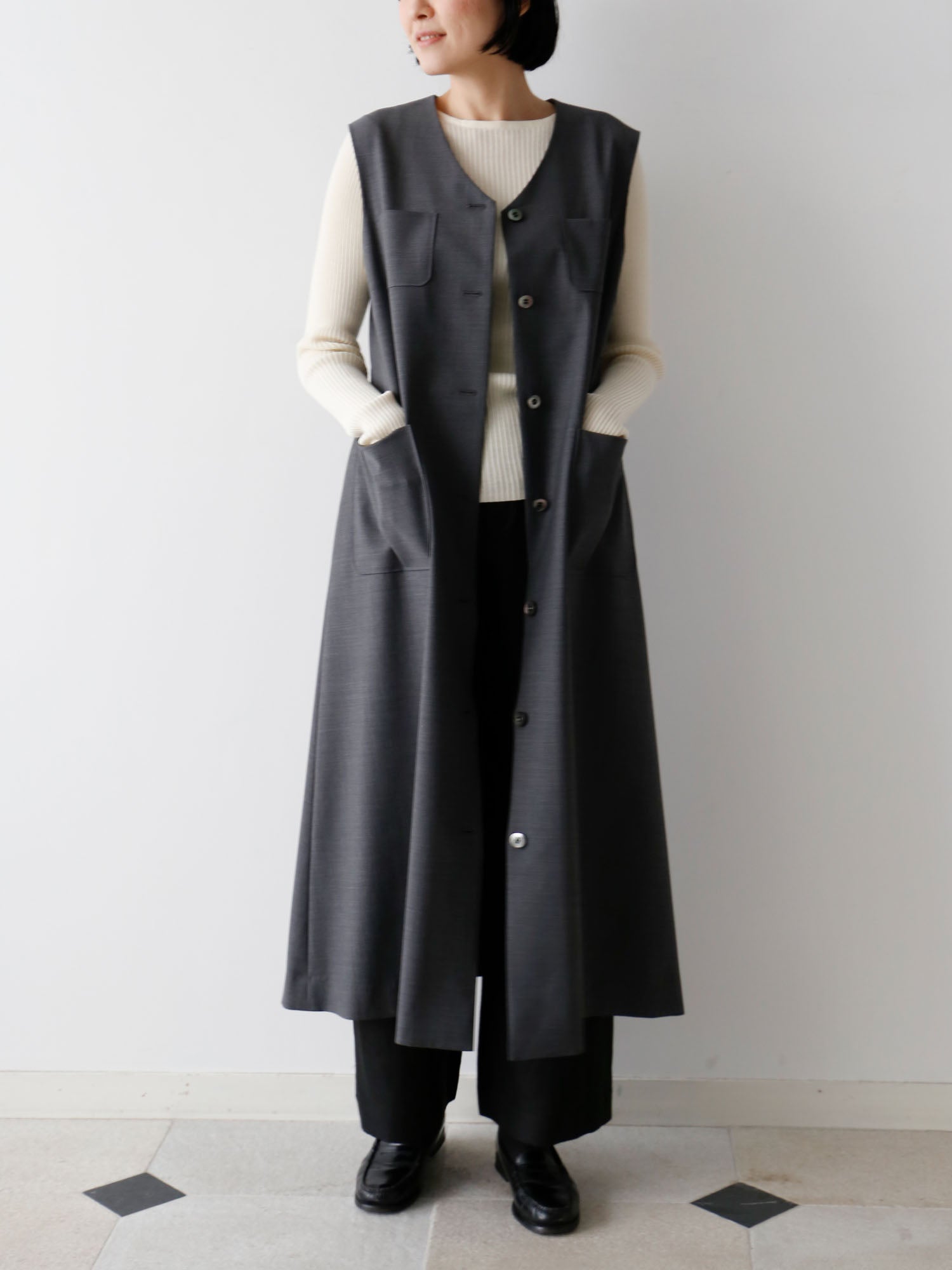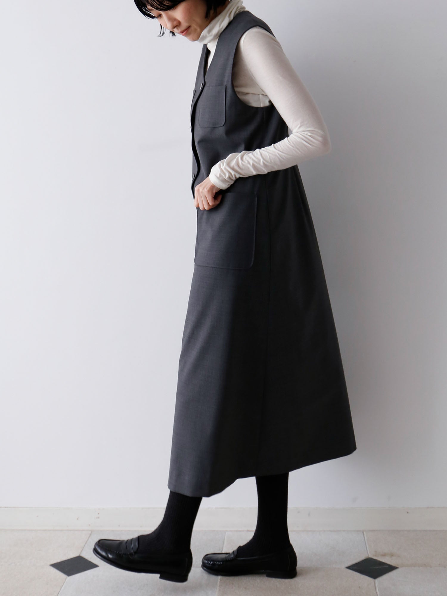 サマーウールで仕立てたワンピースが登場。すっきりとした「ワンピース」としても、着こなしのアクセントになる「ジレ」としても着られる便利なアイテム。