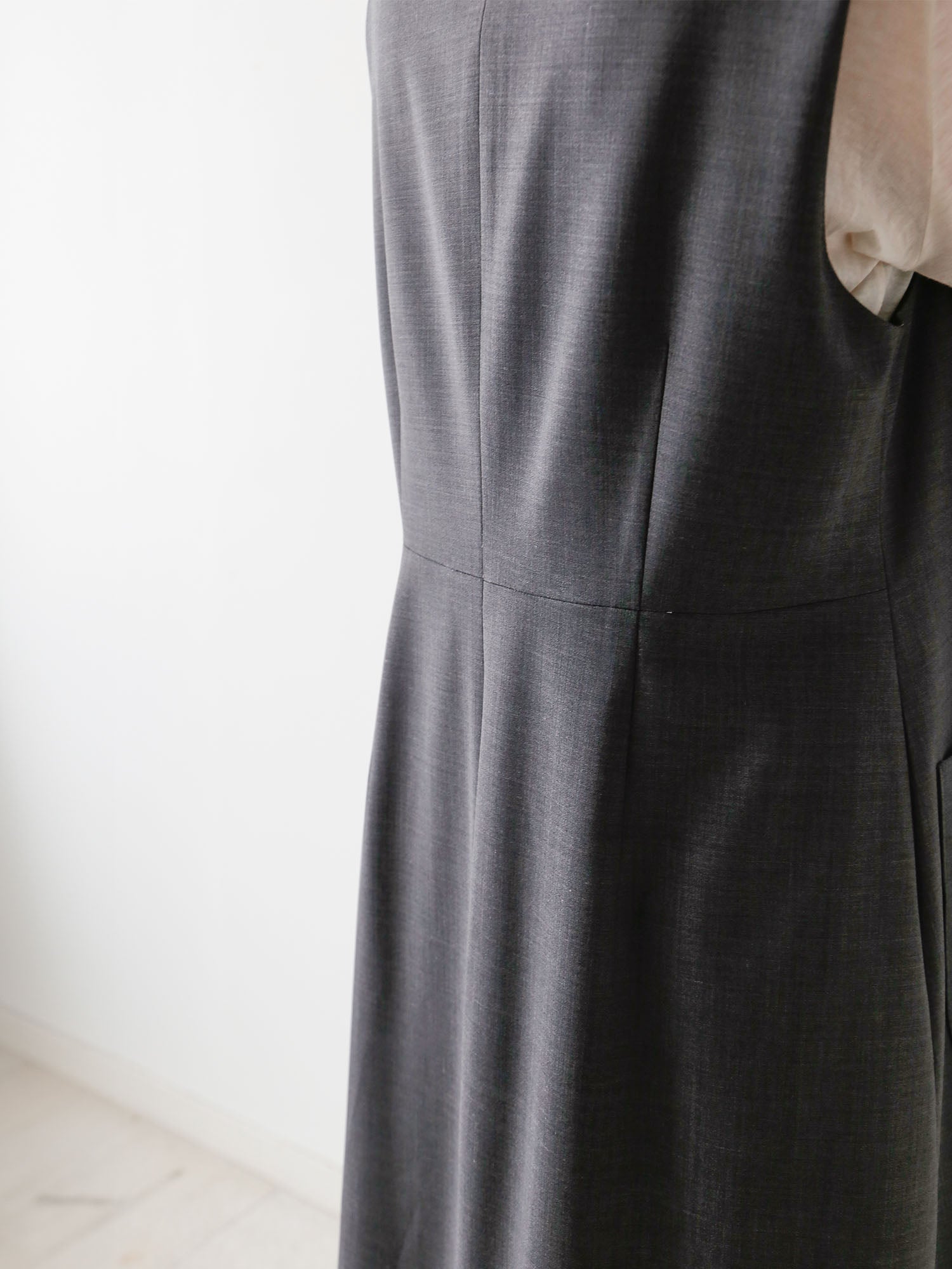 後ろに入れたウエストよりやや高い切り替えでスタイルアップしつつ、上下に取ったダーツで女性らしい美しいシルエットを生み出しています。