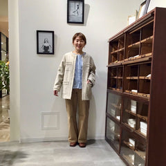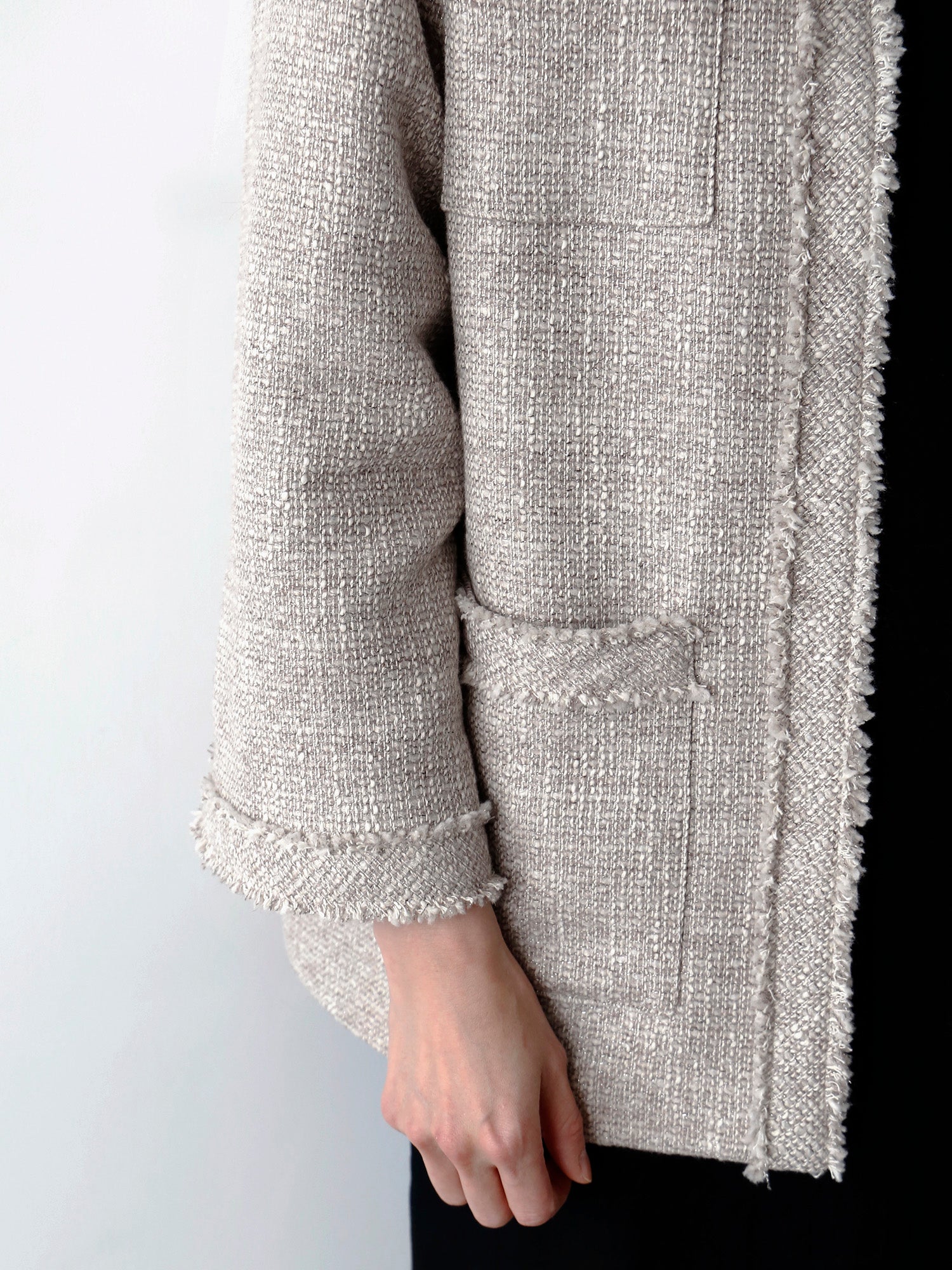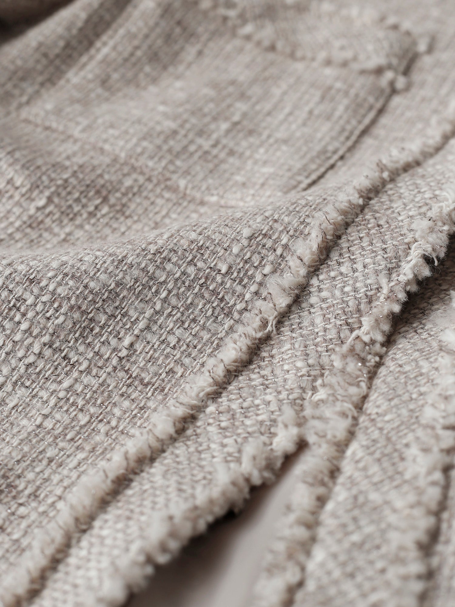 前立て、袖口、ポケット口には共布のフリンジを飾りました。いくつもの糸が丹念に織り込まれた立体的で表情豊かな生地感を存分に楽しめるデザインです。