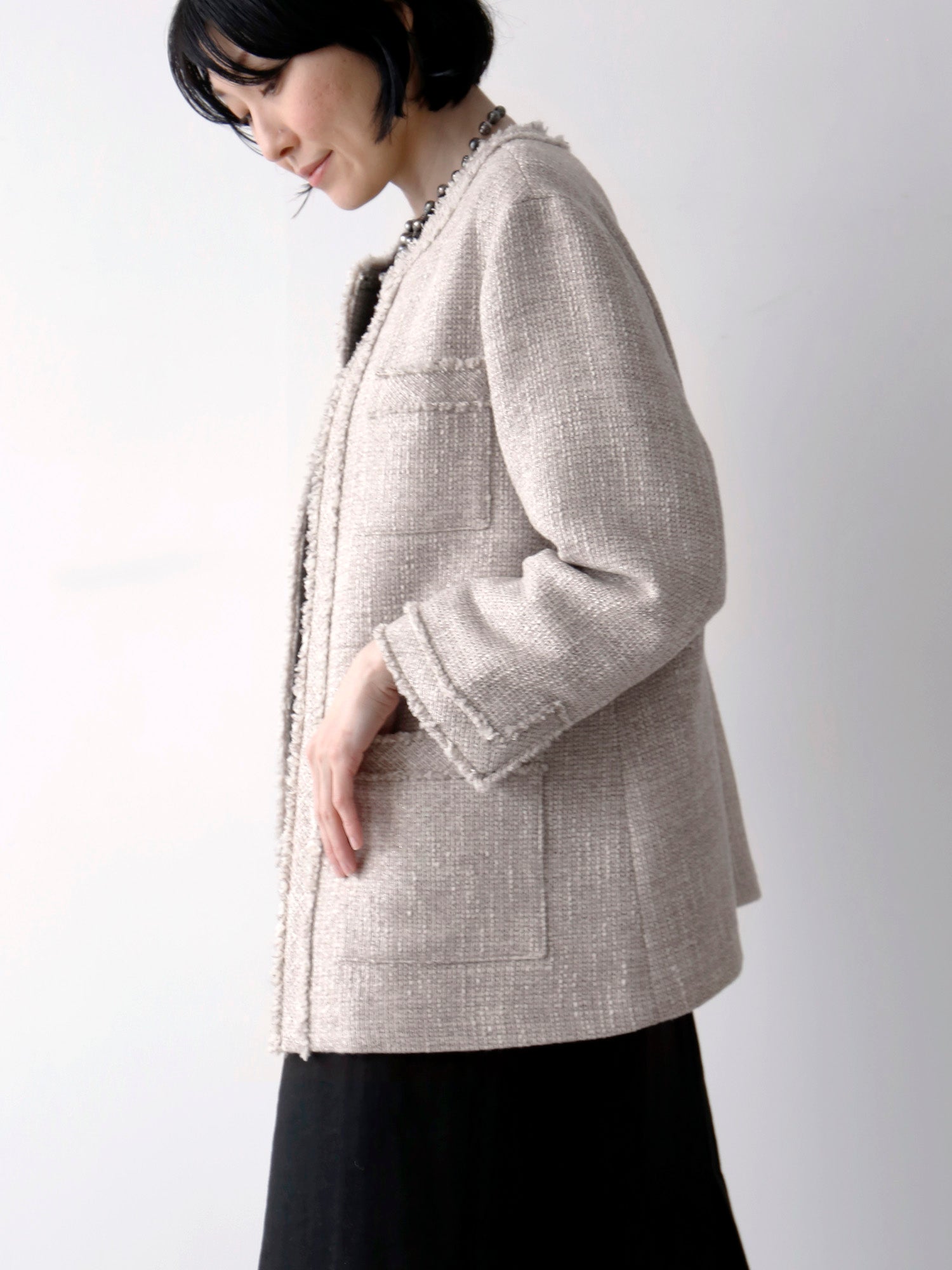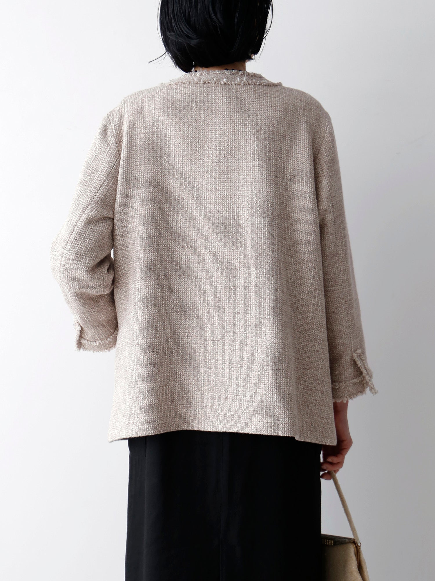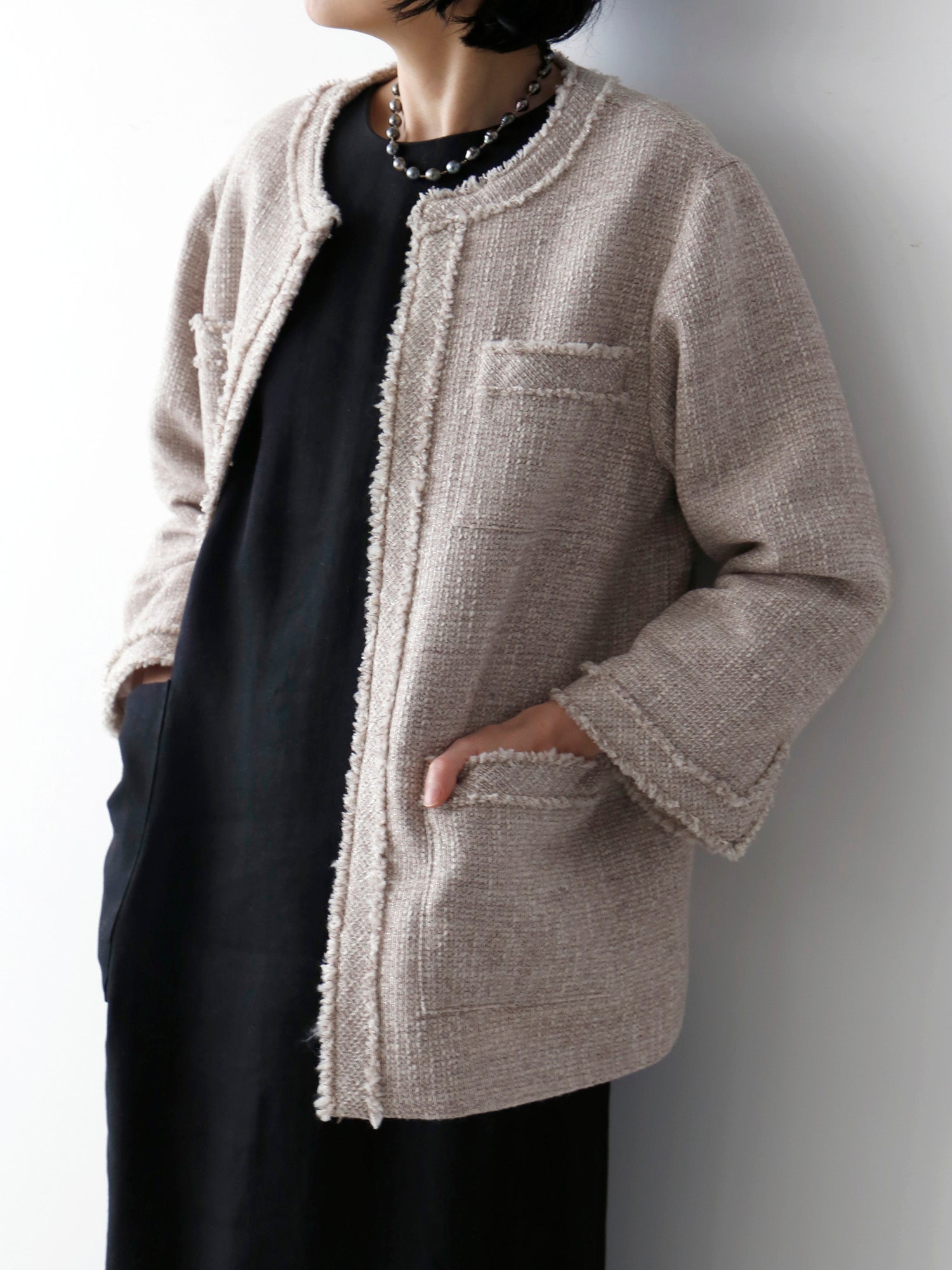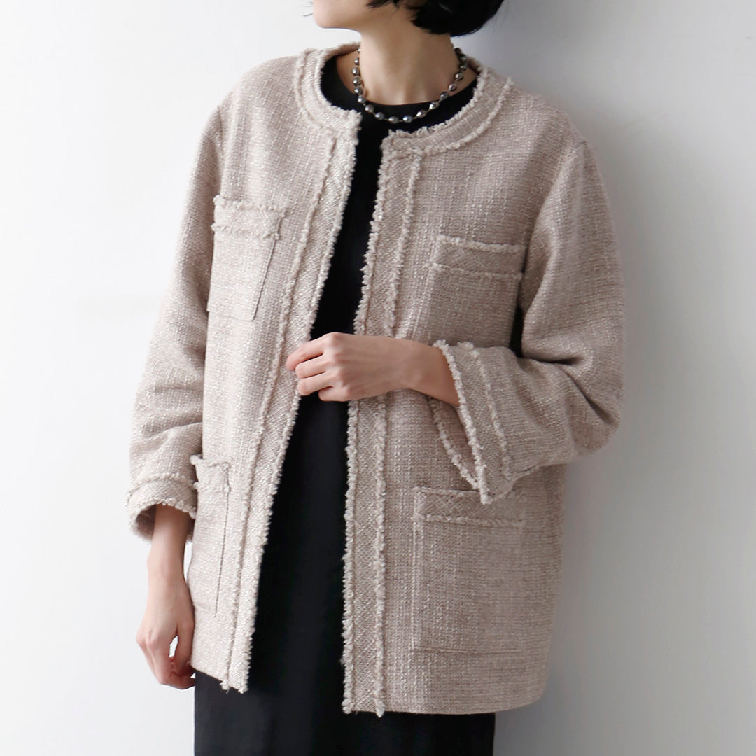 紡毛糸にラメ糸を織り込んだファンシーツイードで仕立てたジャケット《イザベラ》。ウール地の「ベージュローズ」とコットン地「ベージュ」、素材の異なる2色をご用意しました。