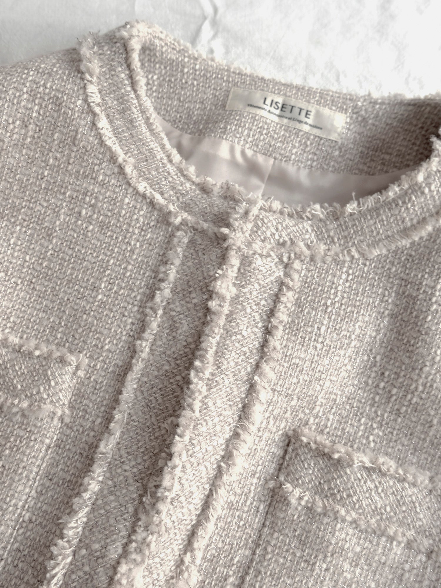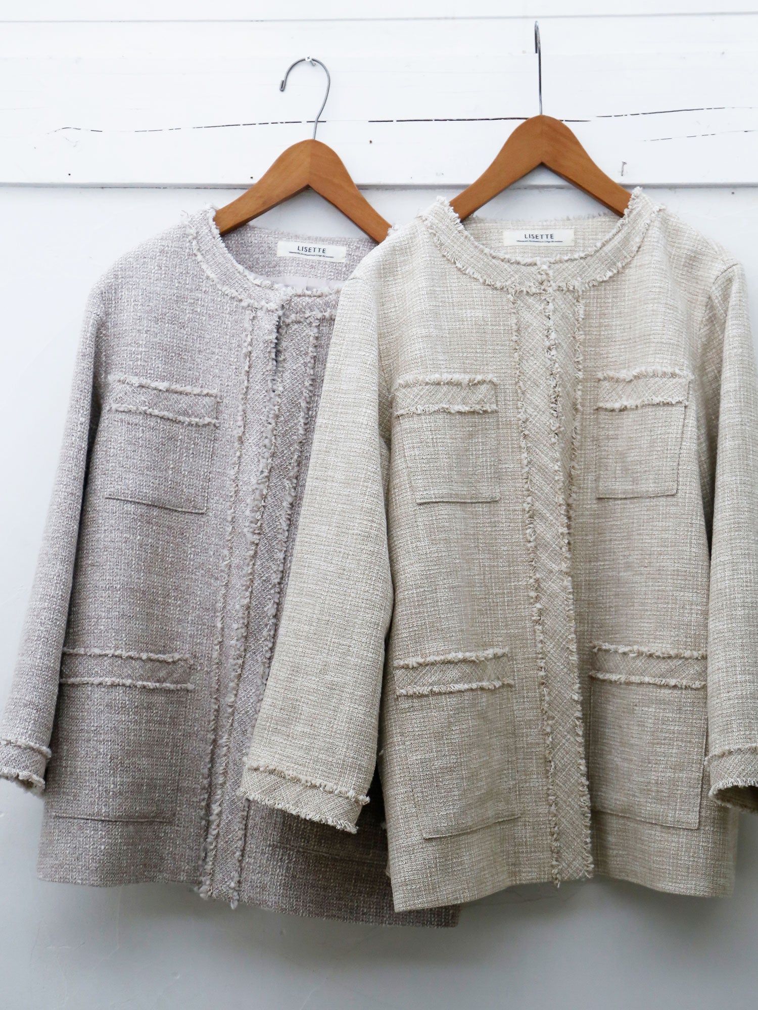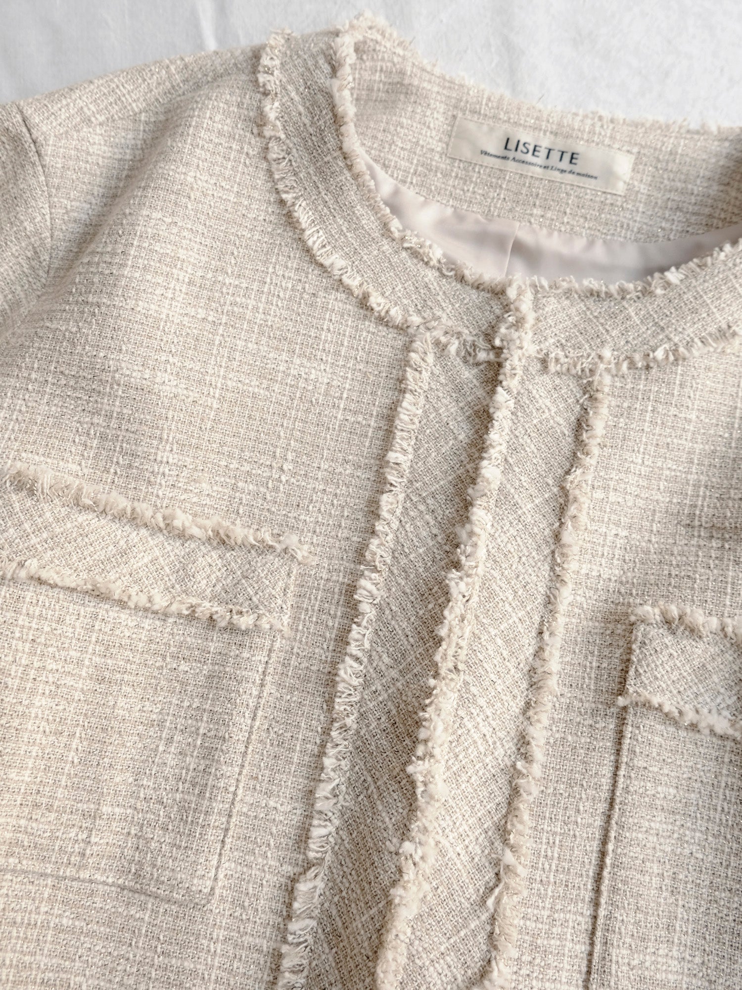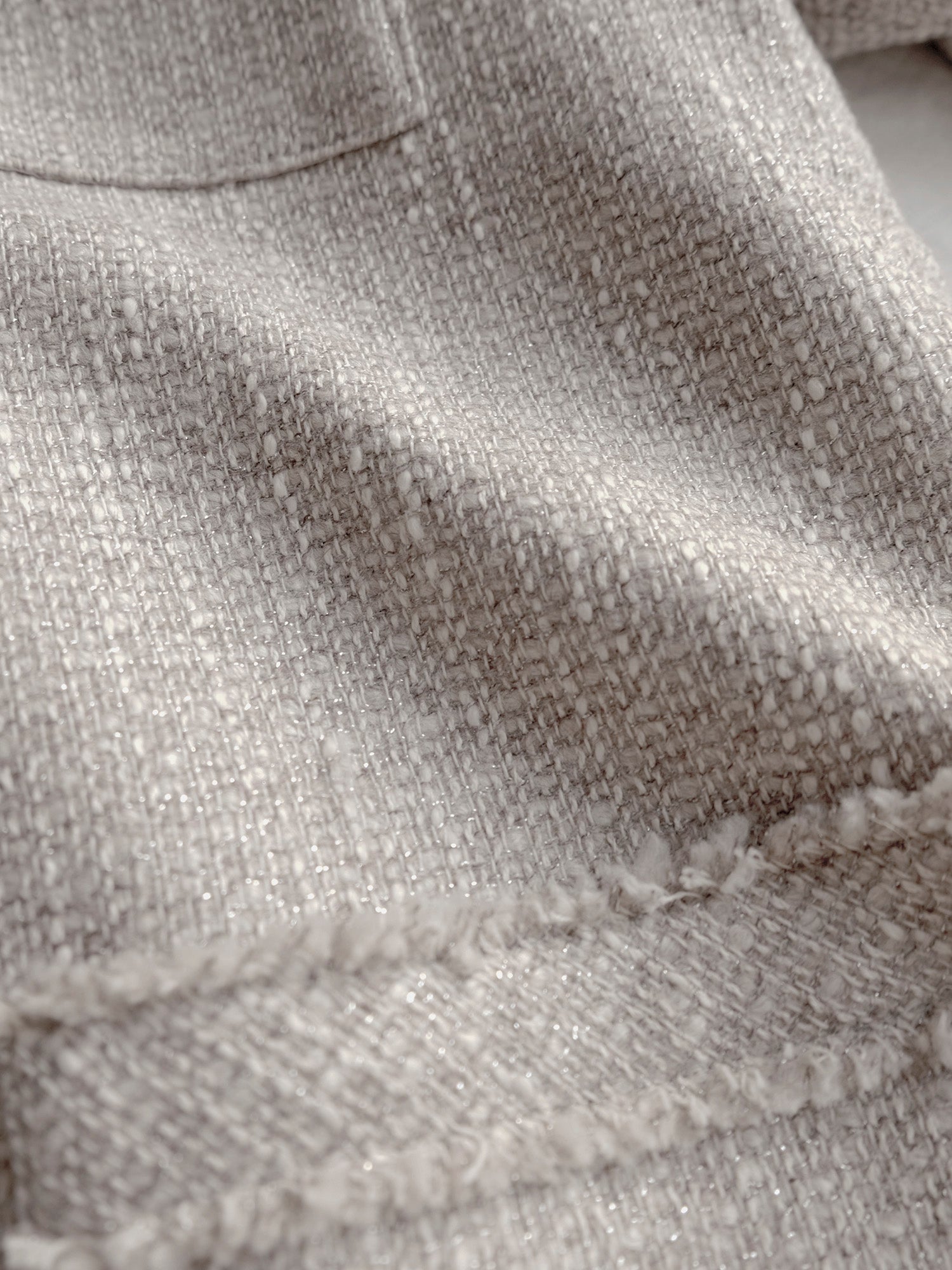 紡毛糸にラメ糸を織り込んだファンシーツイードで仕立てたジャケット《イザベラ》。ウール地の「ベージュローズ」とコットン地「ベージュ」、素材の異なる2色をご用意しました。