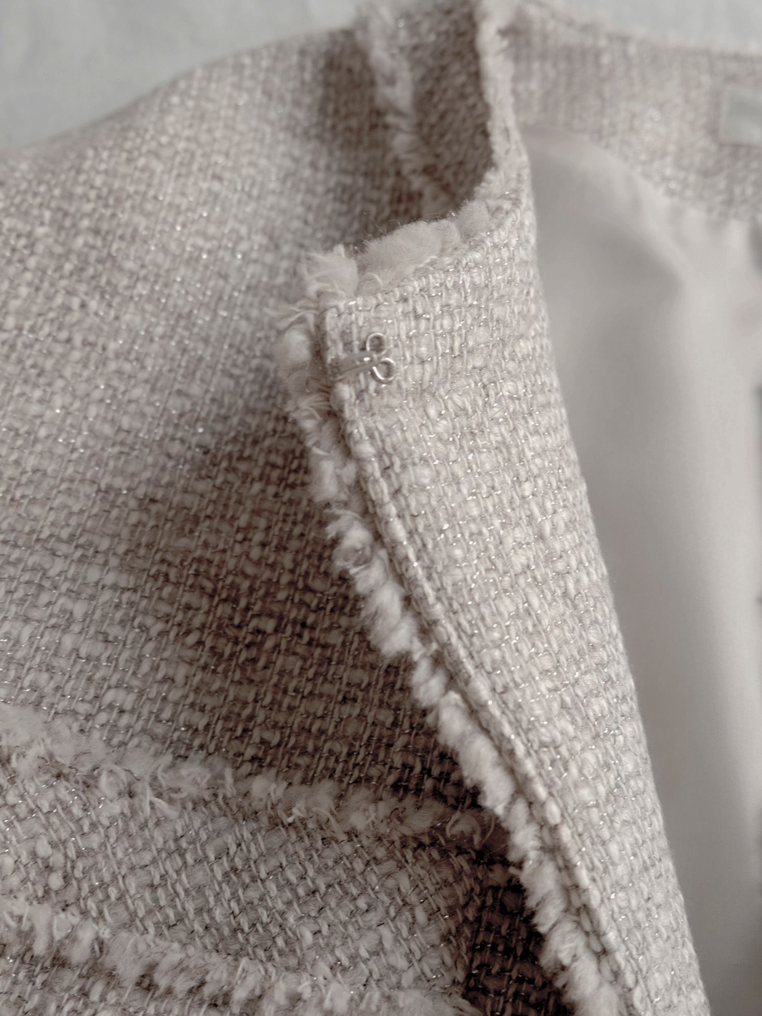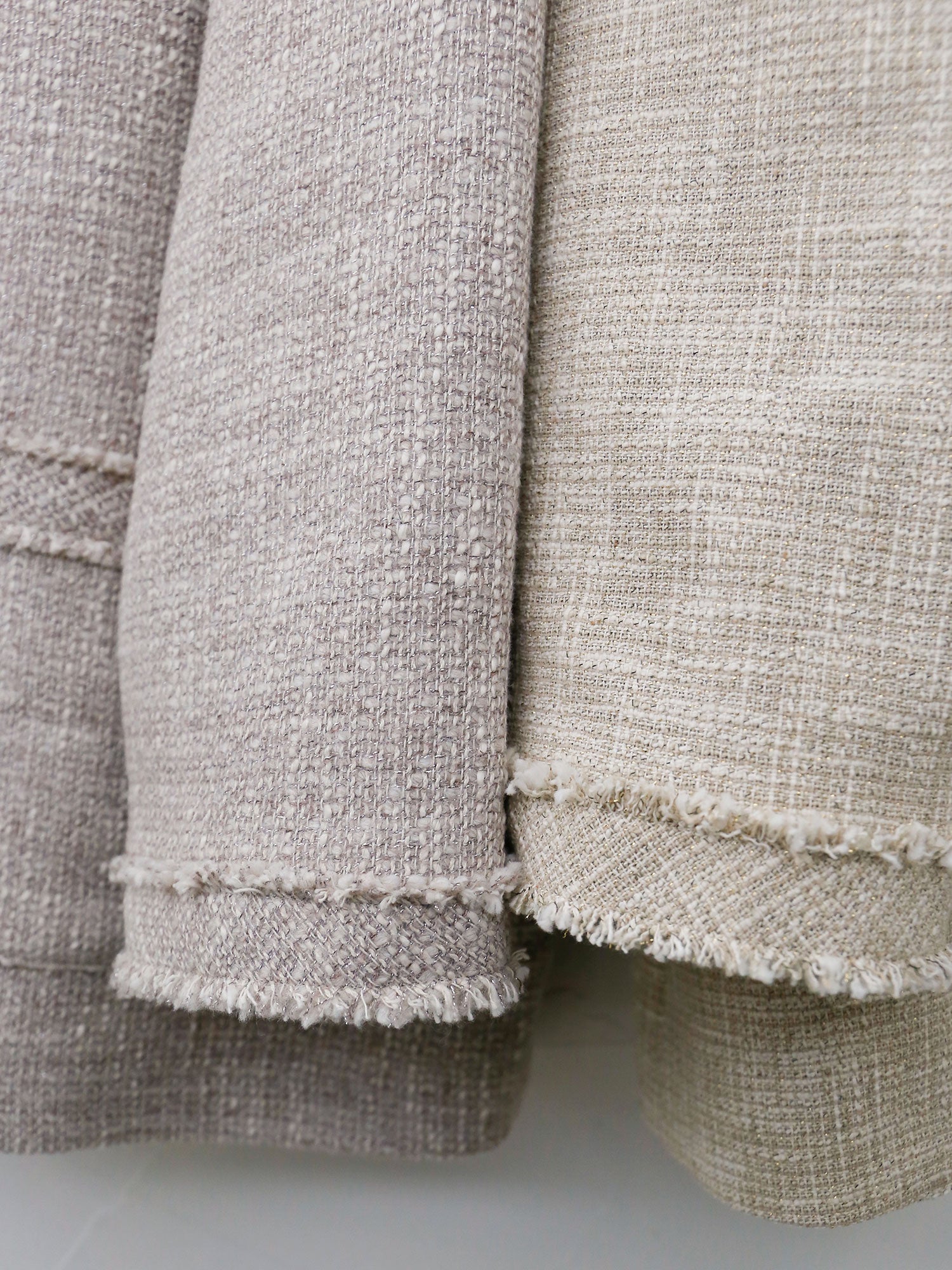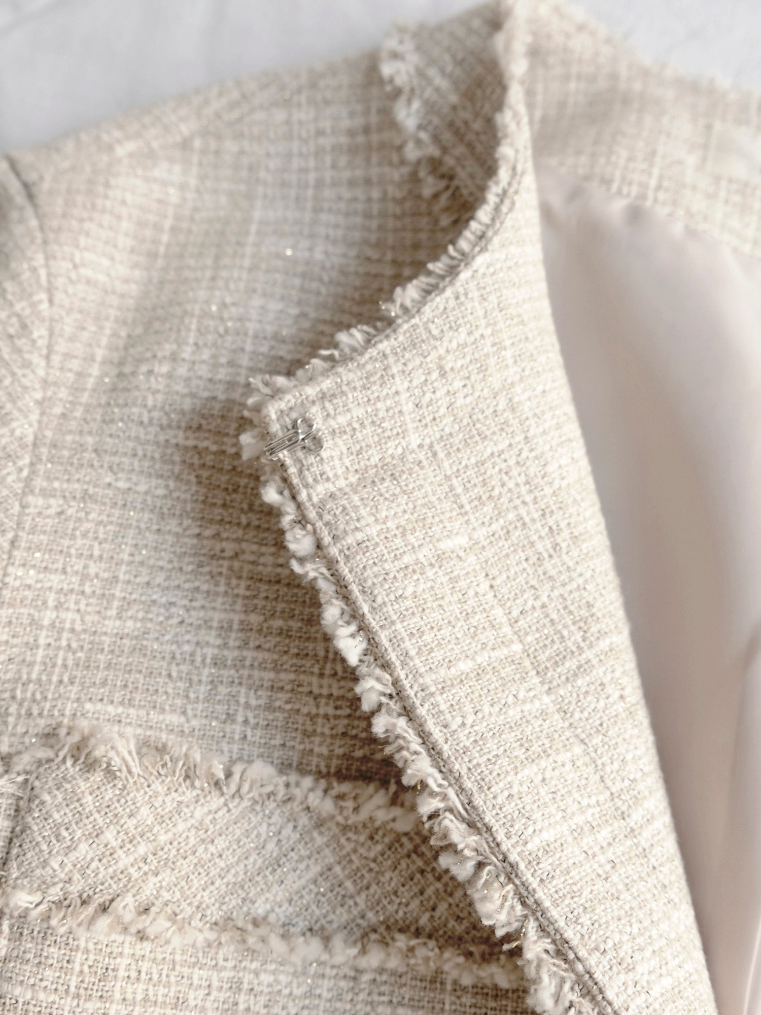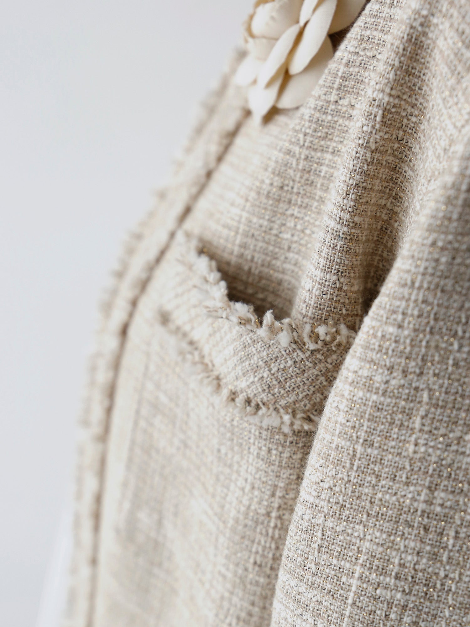 紡毛糸にラメ糸を織り込んだファンシーツイードで仕立てたジャケット《イザベラ》。ウール地の「ベージュローズ」とコットン地「ベージュ」、素材の異なる2色をご用意しました。