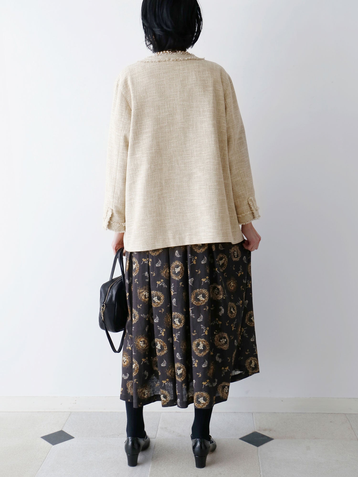 オリジナルプリントのスカート「ククー」と合わせて。総柄のスカートも同系色でまとめると落ち着いた印象で着られます。