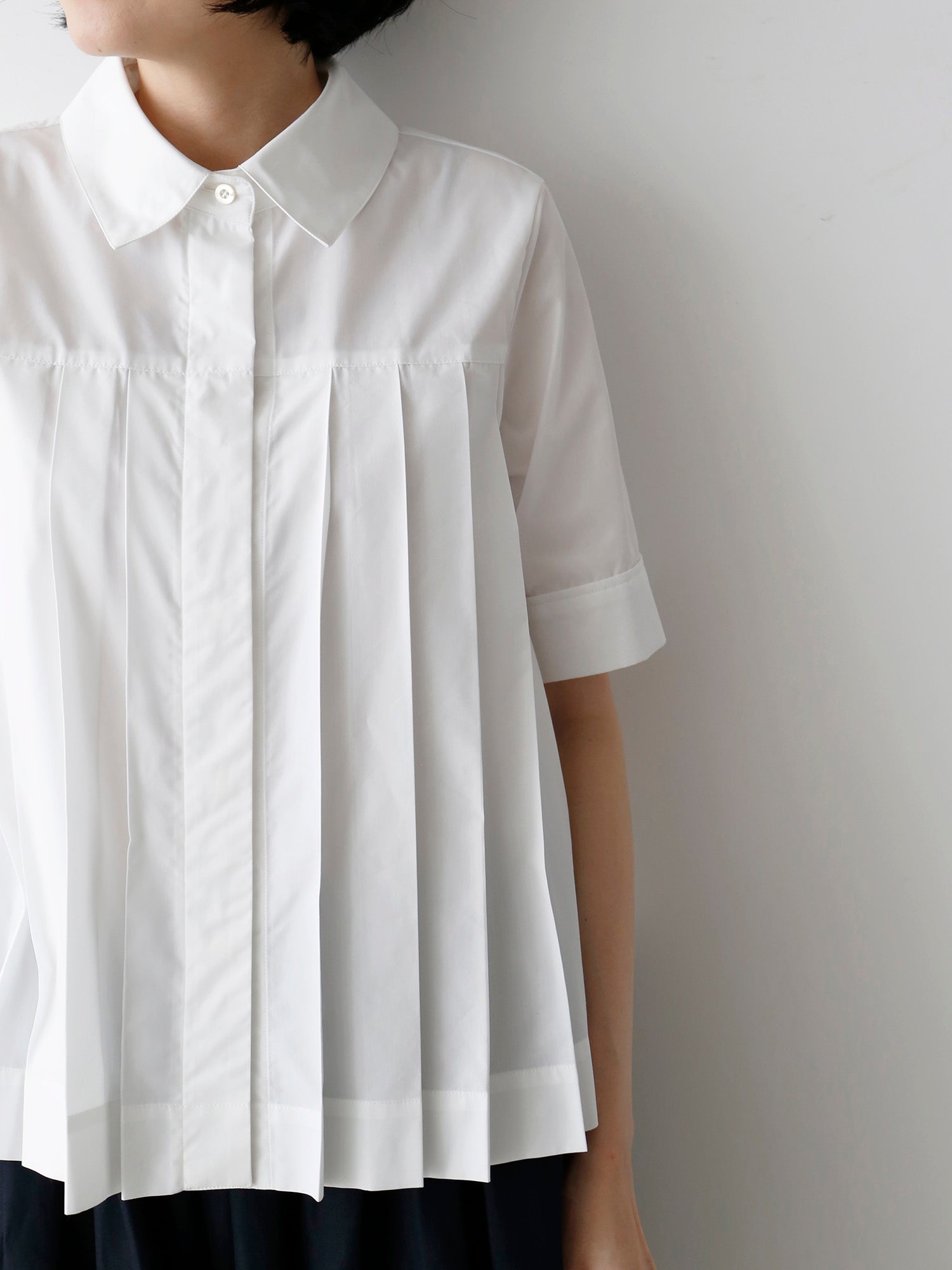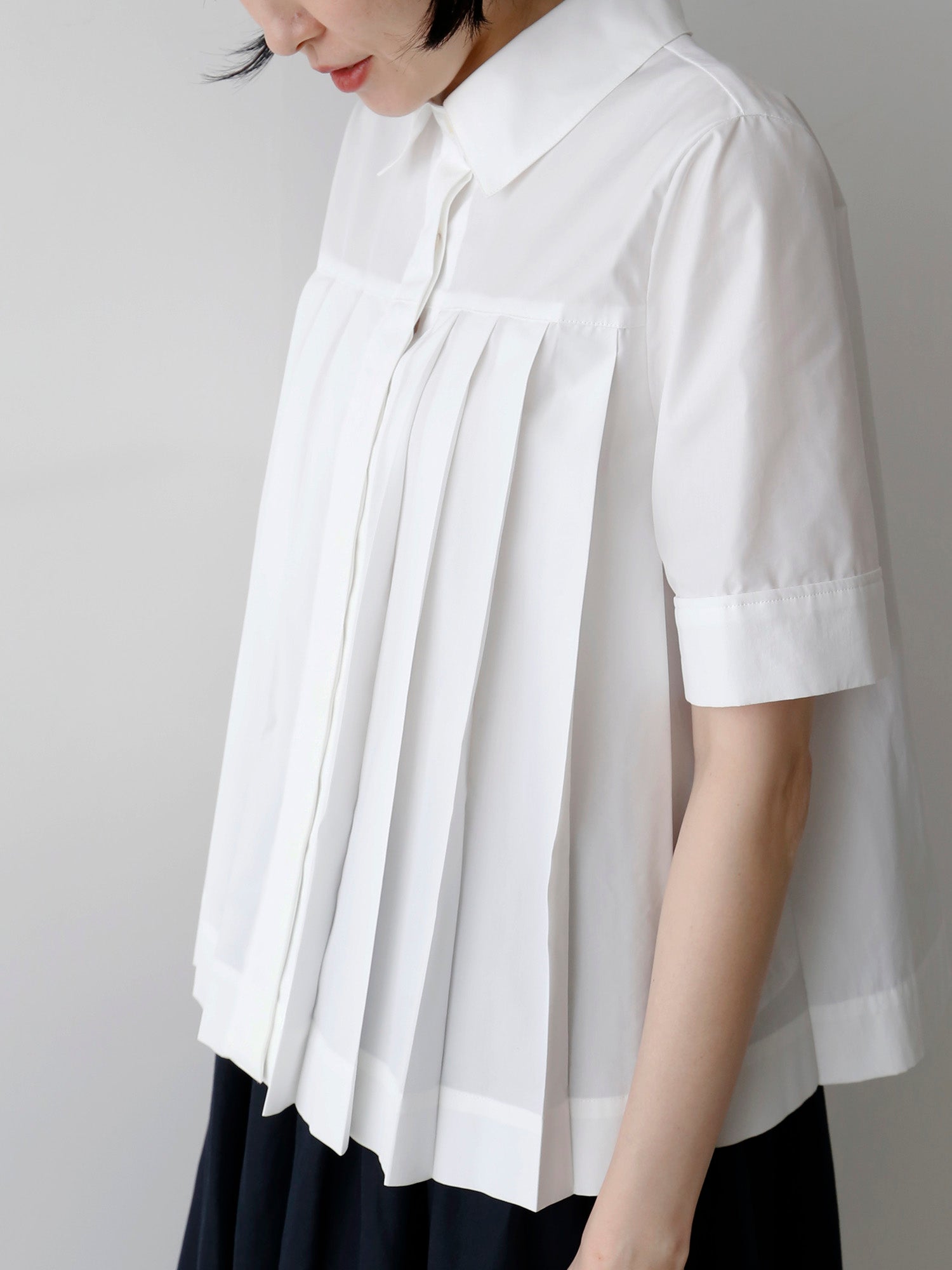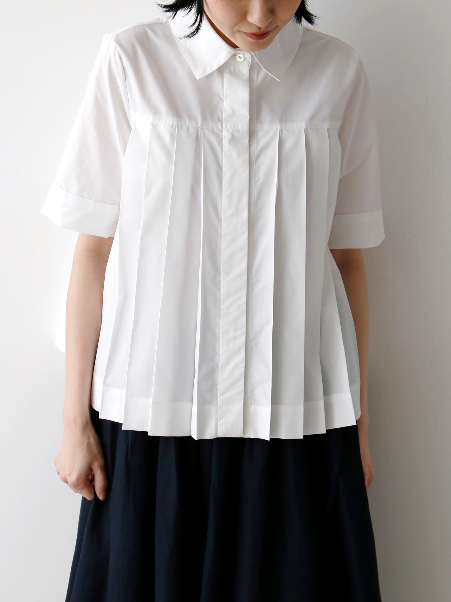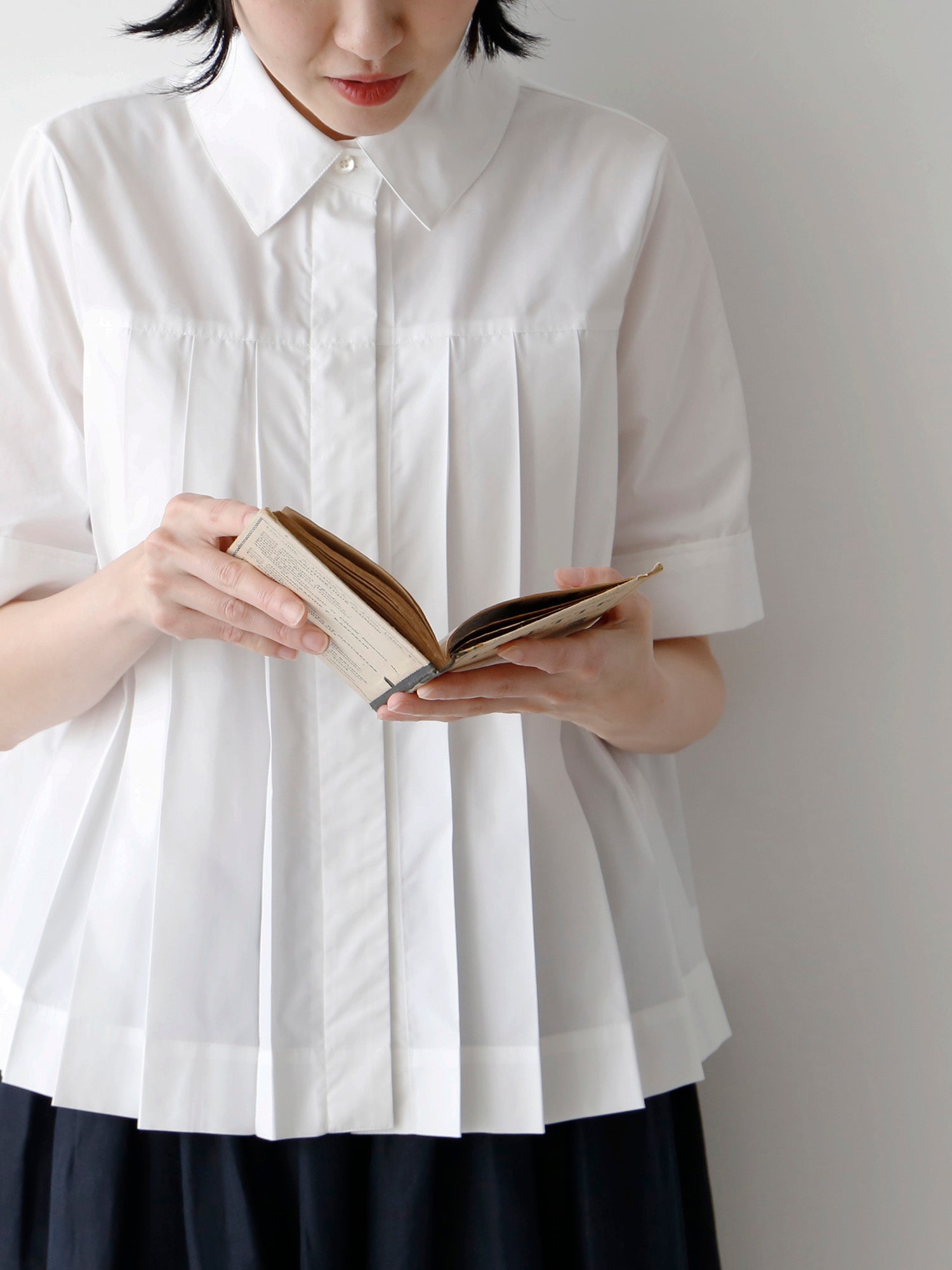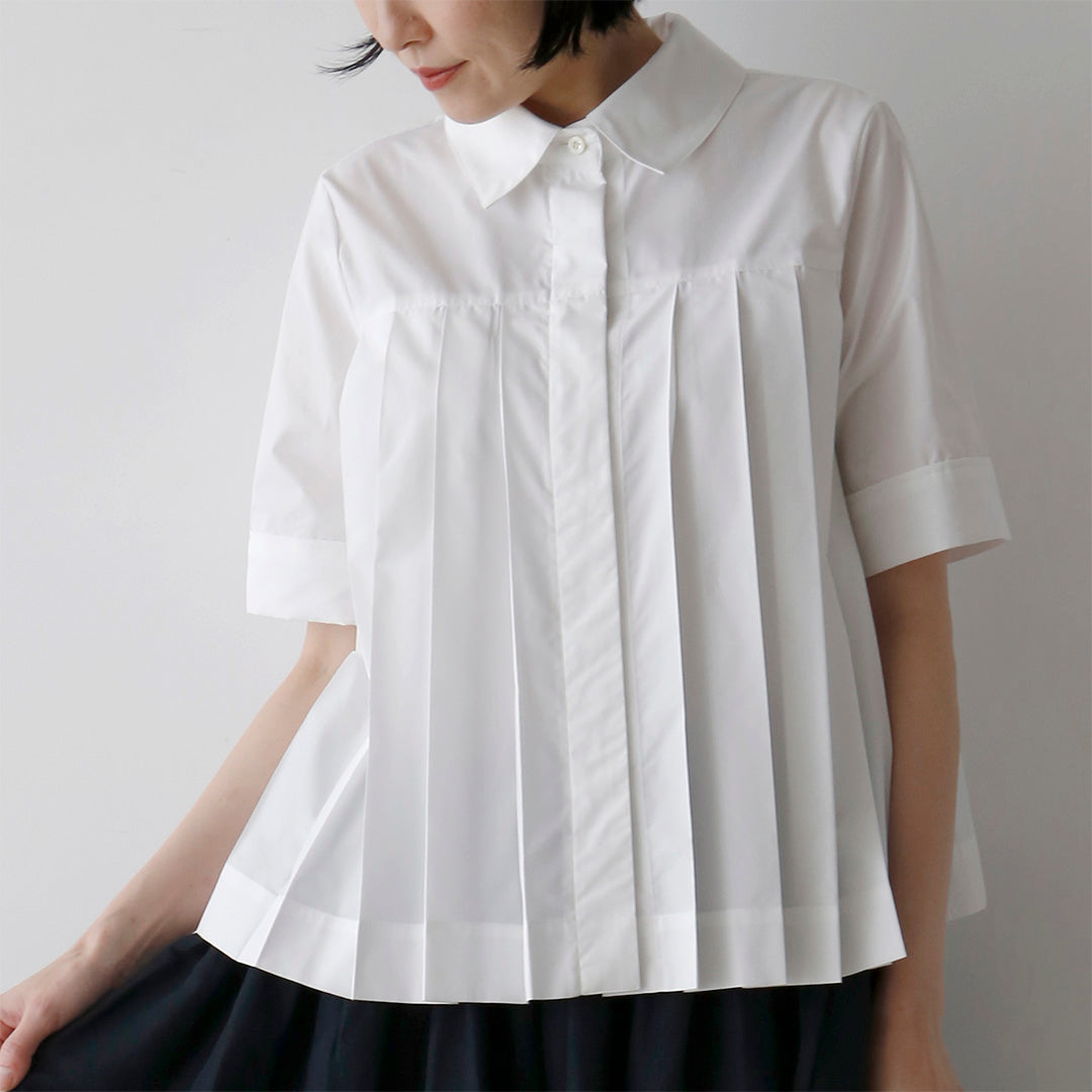 イタリア製コットンで仕立てた、フロントのプリーツデザインが目を引く新作ブラウスが登場。襟付きの端正なデザインと五分袖が、上品さを際立たせ、大人の洗練された印象を演出します。