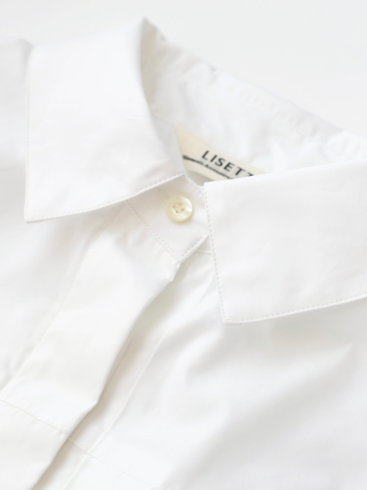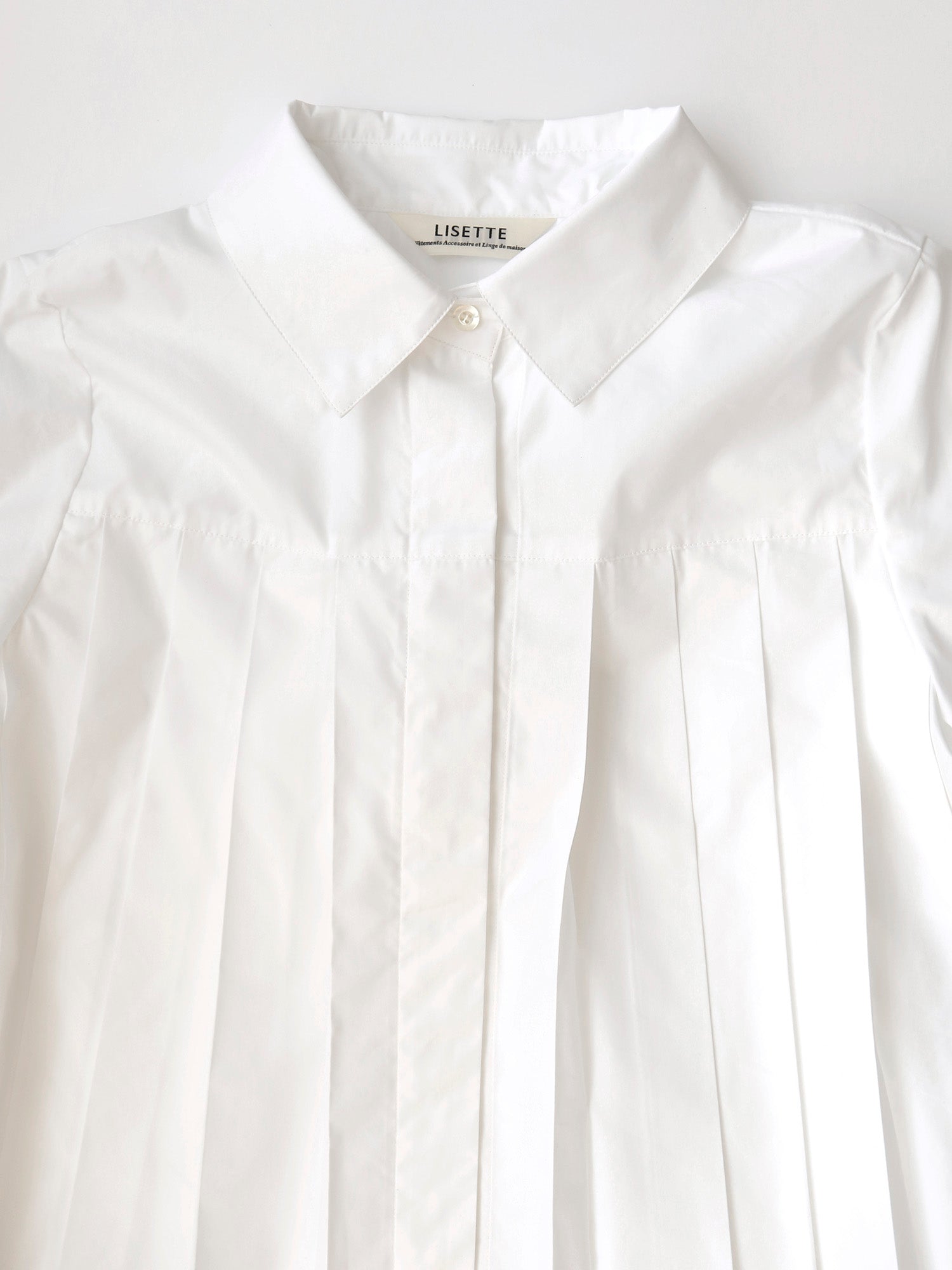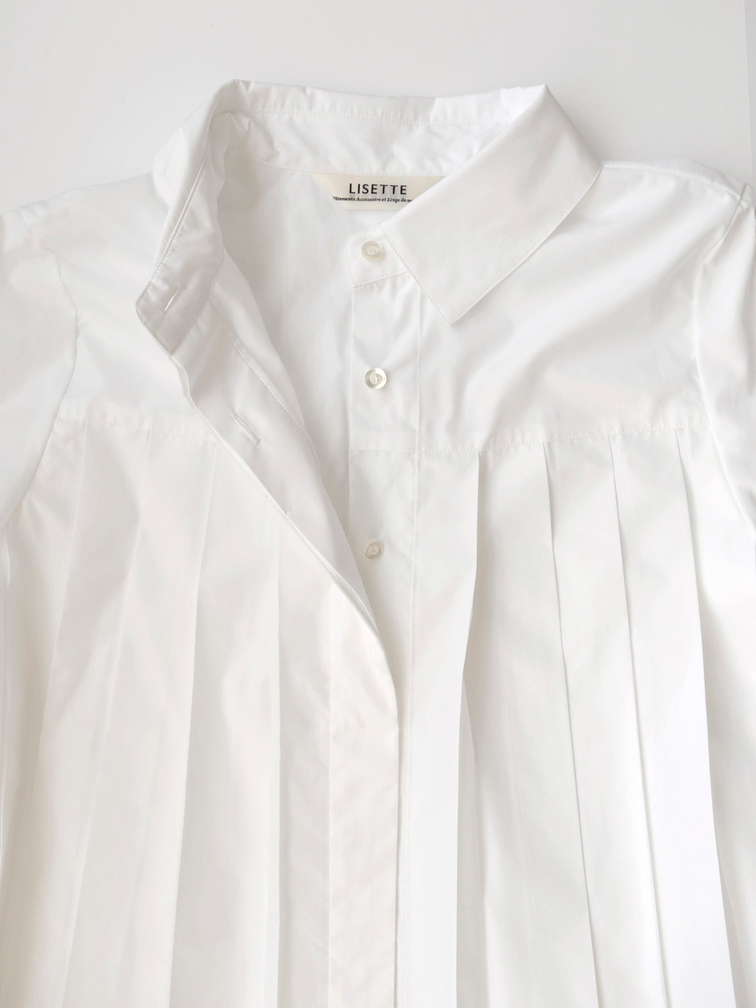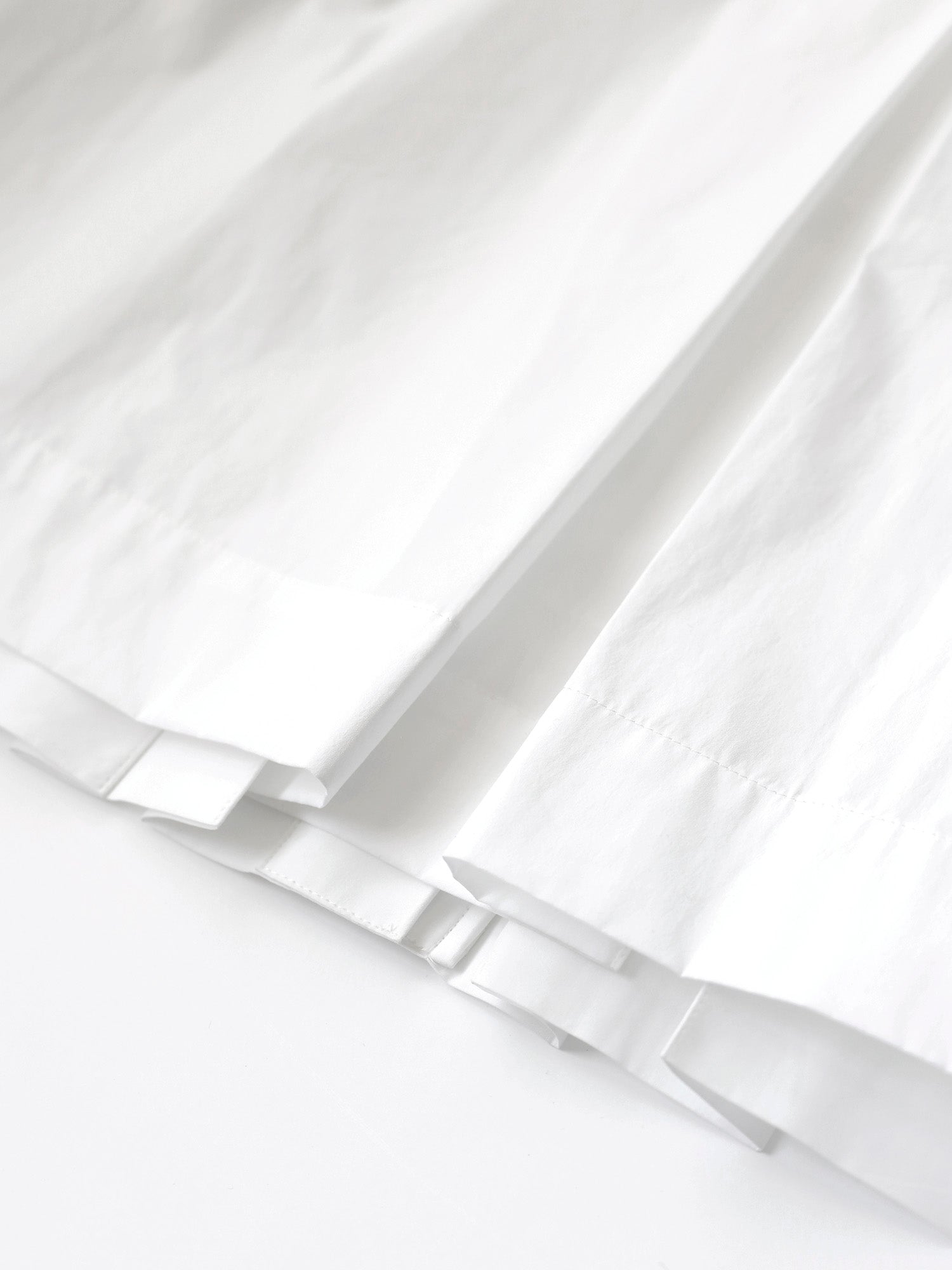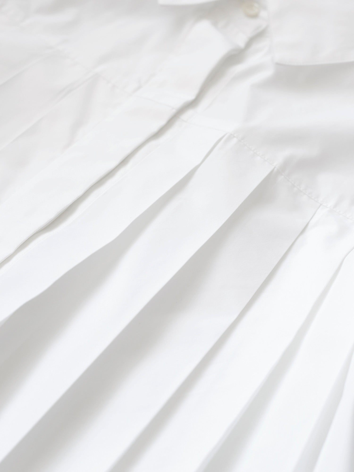 無駄のないミニマルなデザインと、陽の光を受けて穏やかに輝くコットンの質感。白プリーツが軽やかさと気品を纏う「アーリン」。