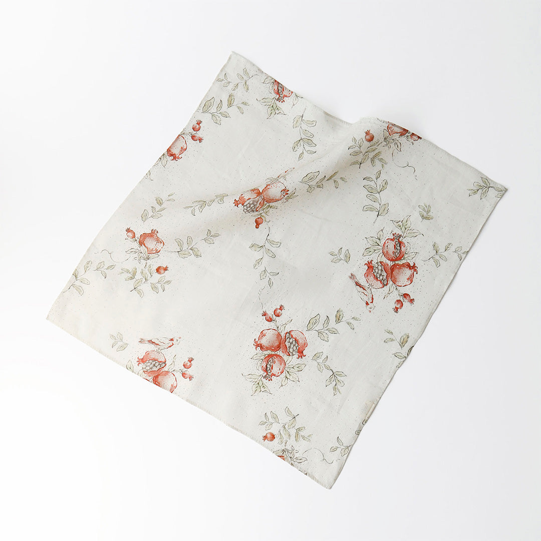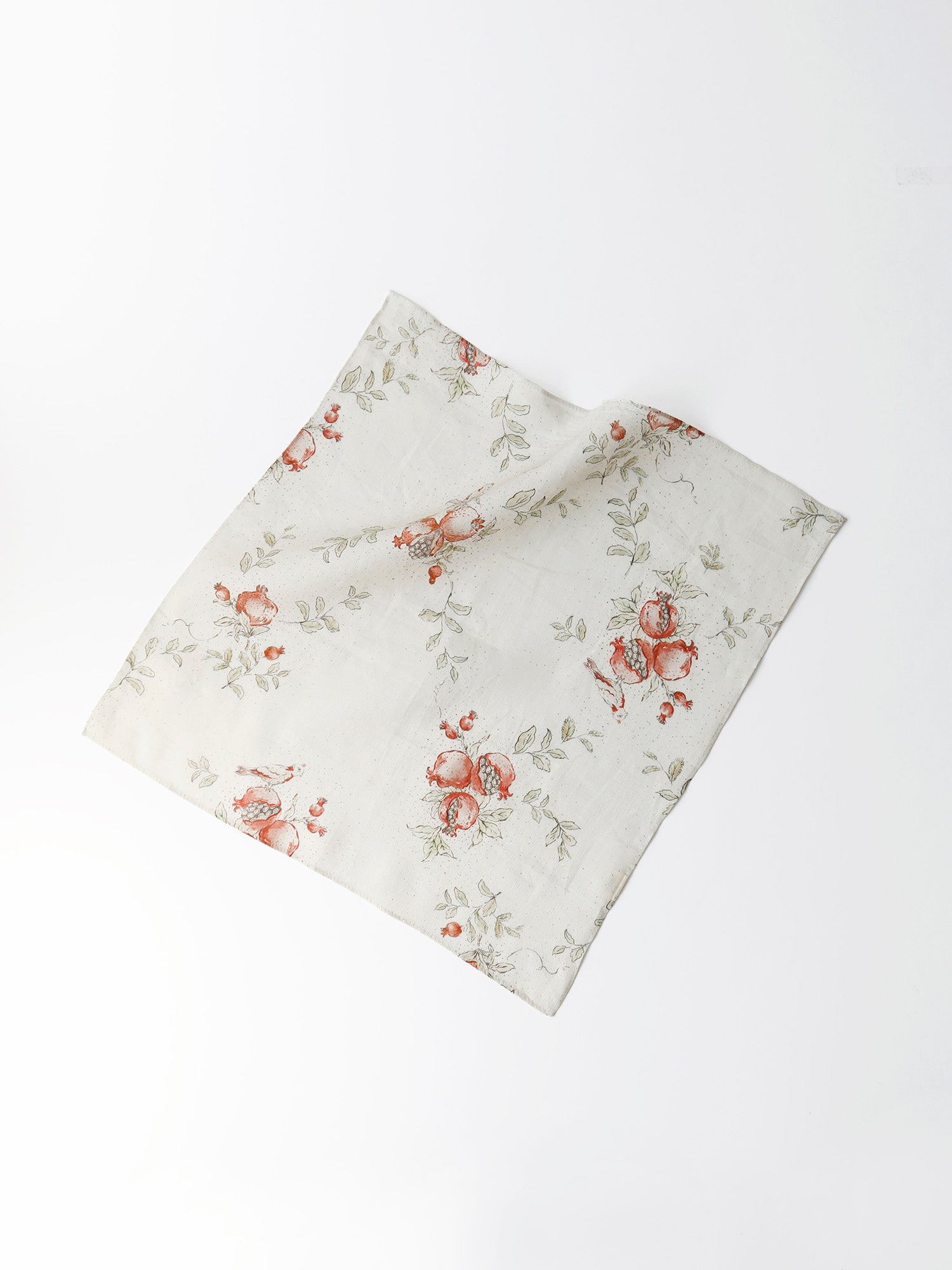 大きな実から粒々とした種が今にもこぼれ落ちそうな姿、その実をついばむ鳥たち…。幼いころに見ていた風景の一瞬を切り取ったようなプリント柄です。