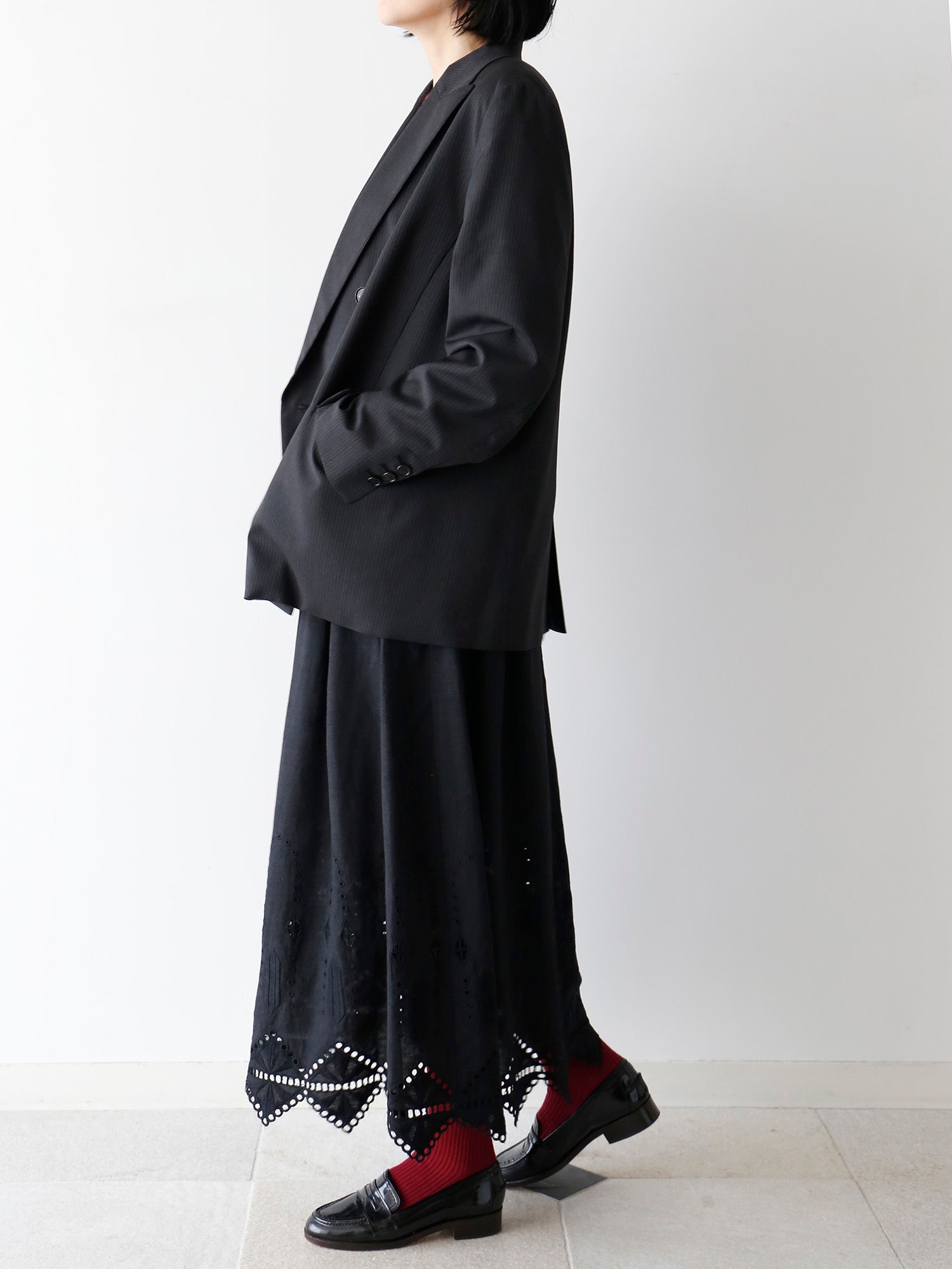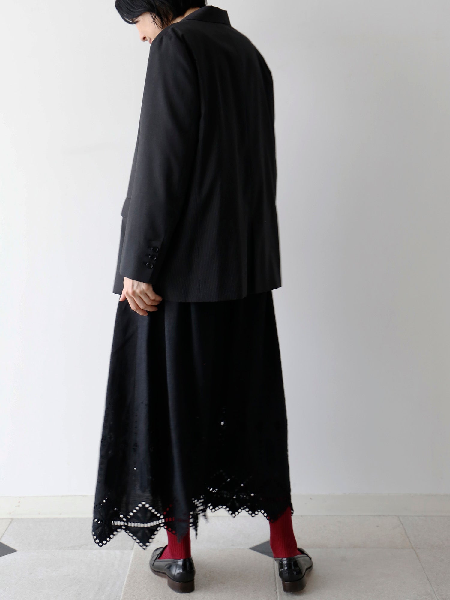 ノアール(黒)は、裾の刺繍とレースの透け感が際立ち、涼しげで軽やかな印象に。そのため、トップスに黒を合わせたワントーンコーディネートでも重たくなりません。