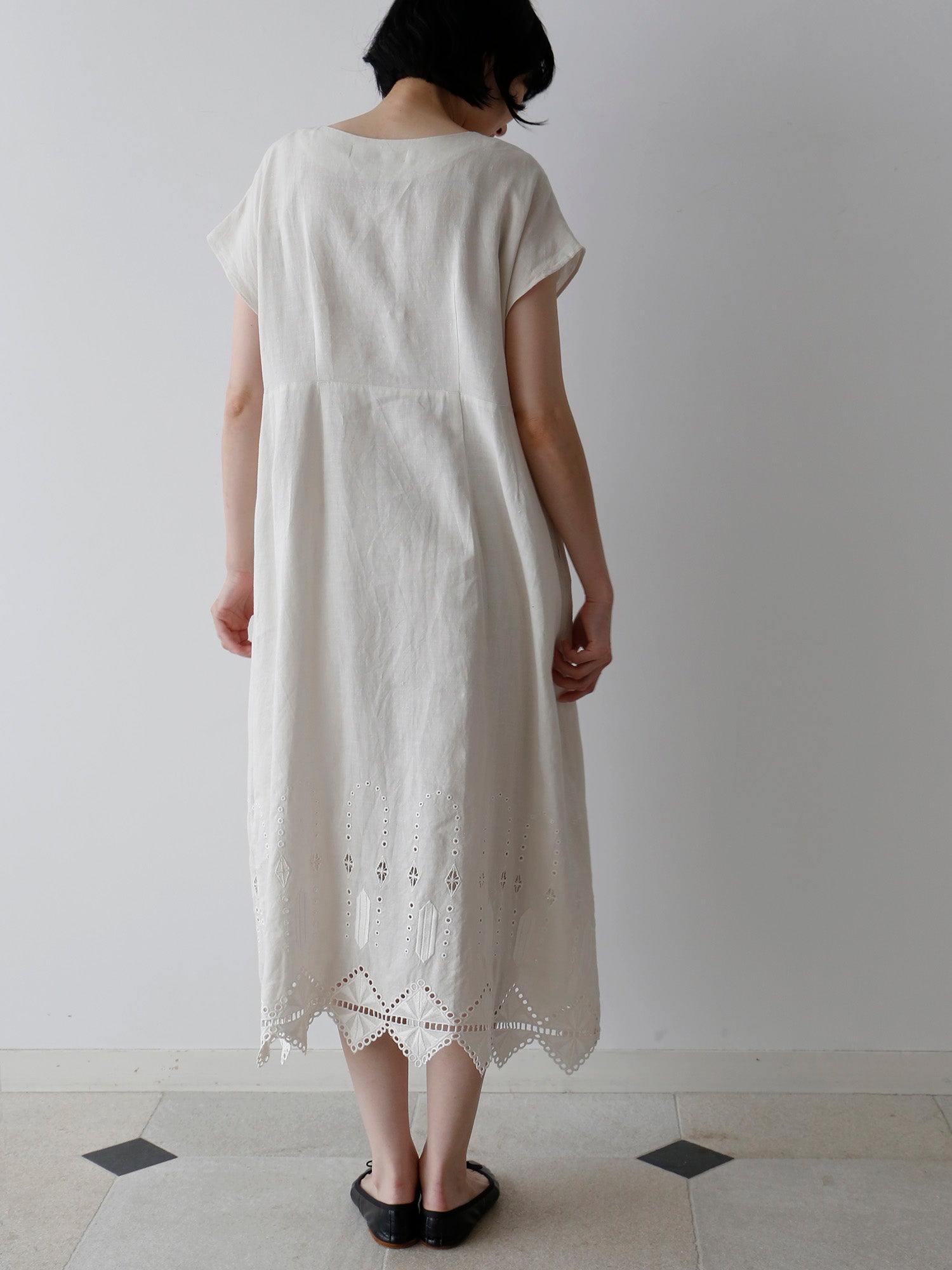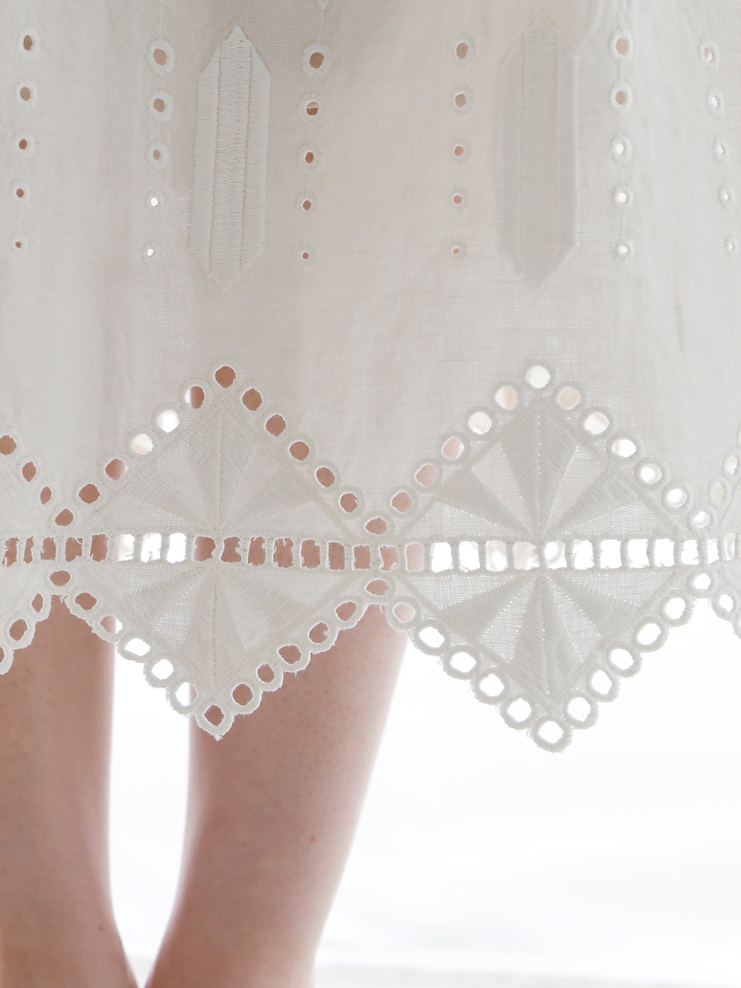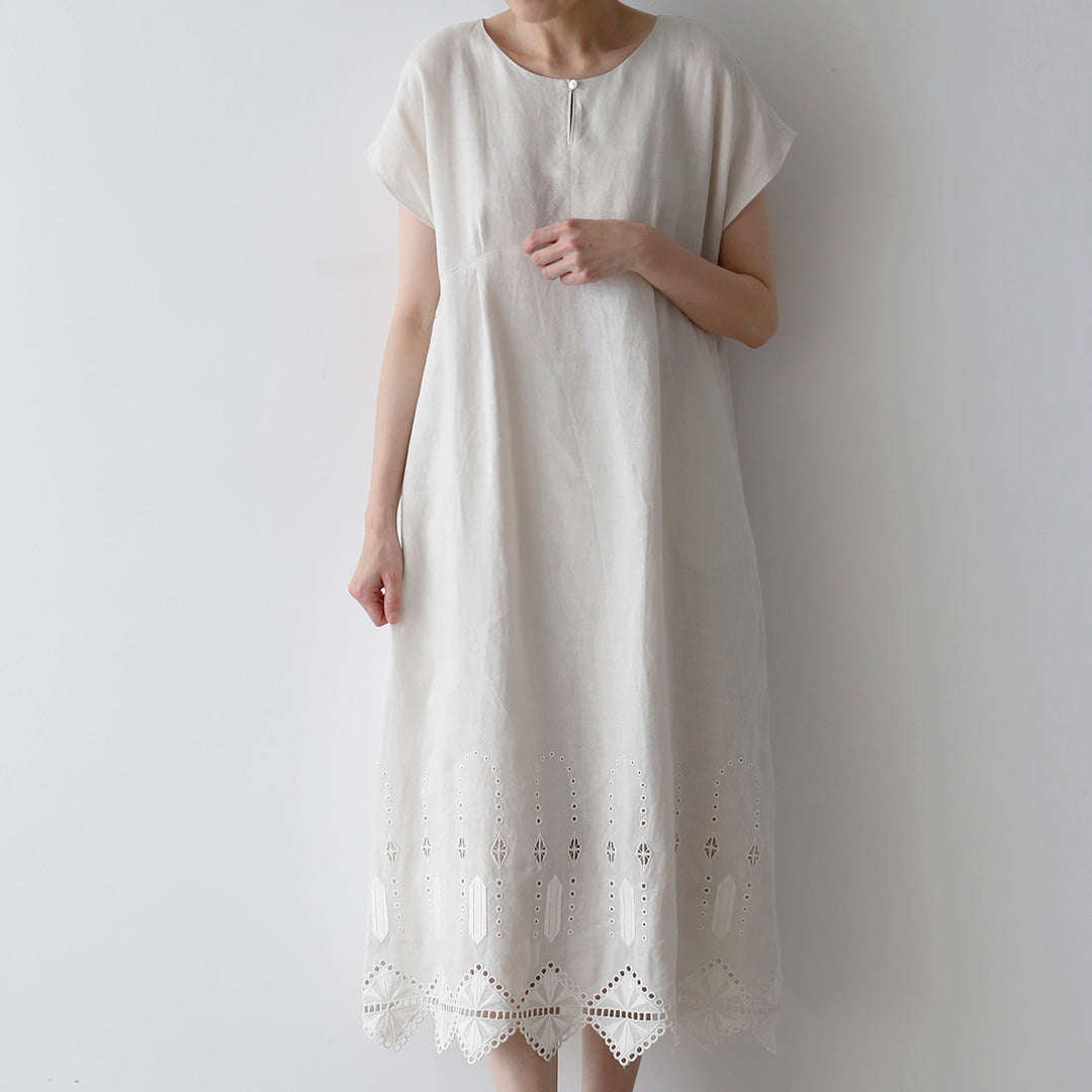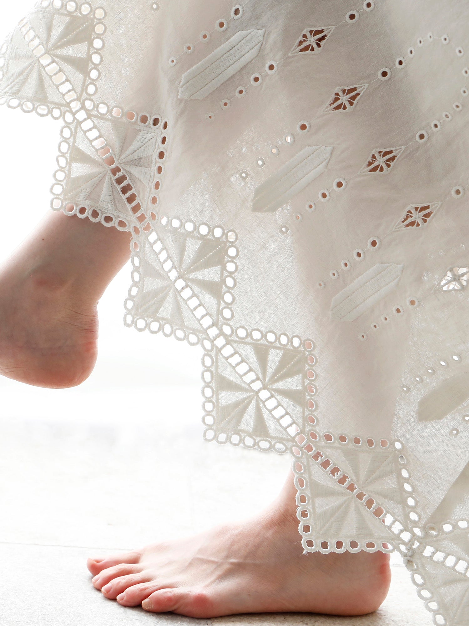 ロシェルの最大の魅力は、裾にあしらわれたオリジナルデザインのレースと刺繍。「No.16」では、裾周りにぐるりとハシゴレースがあしらわれ、丸いアイレットがスクエアの輪郭を描くように涼やかに施されています。
