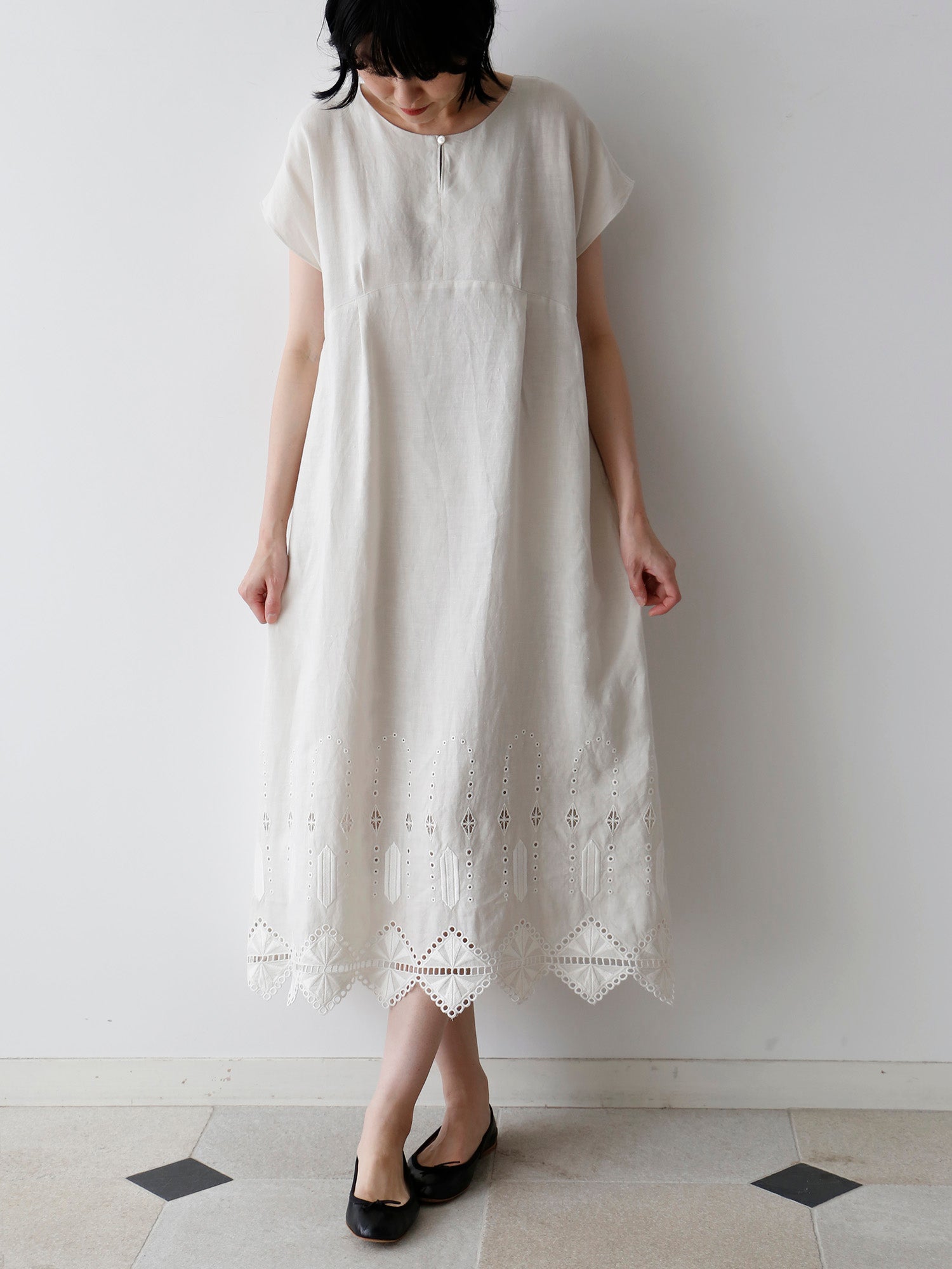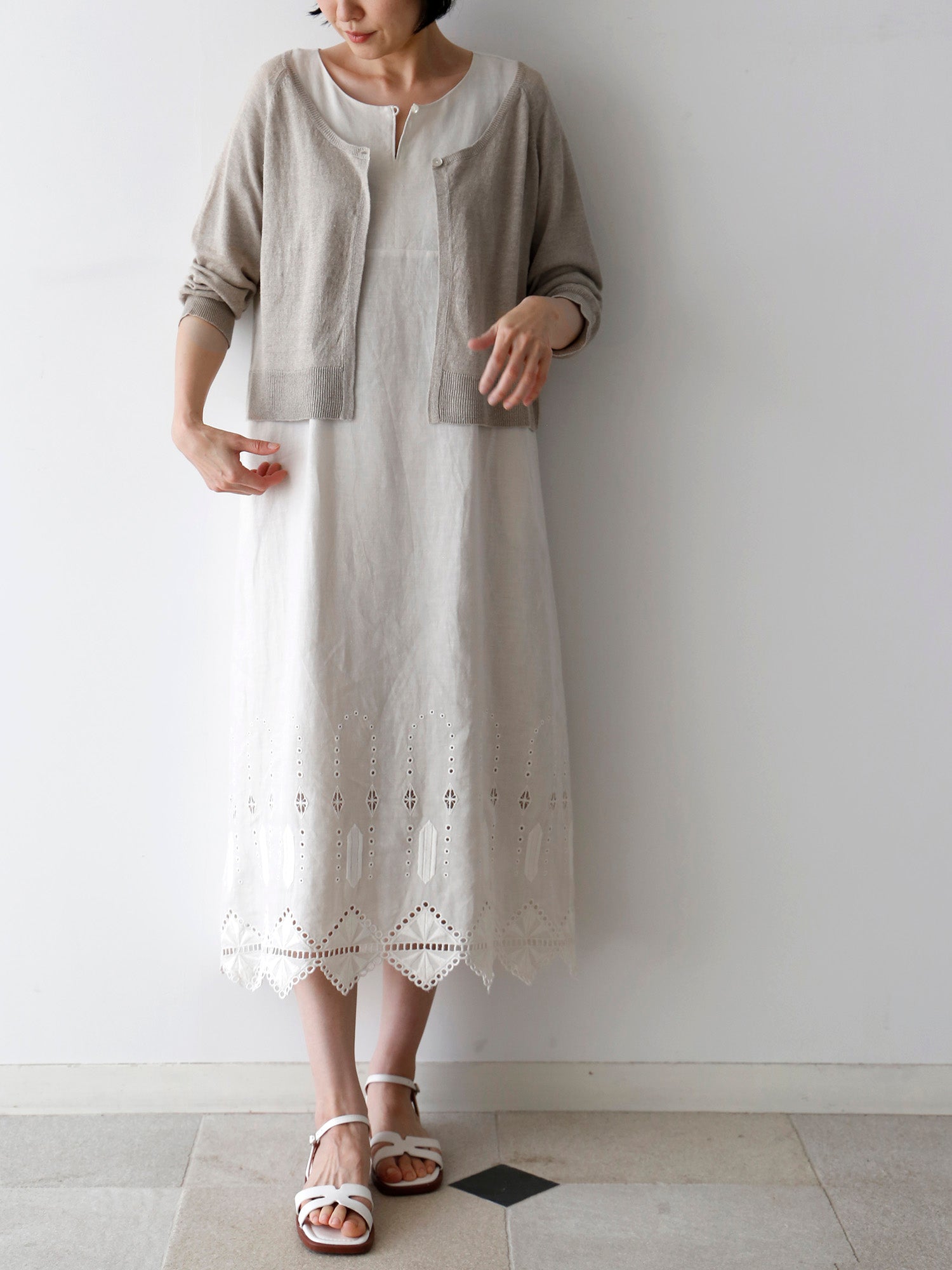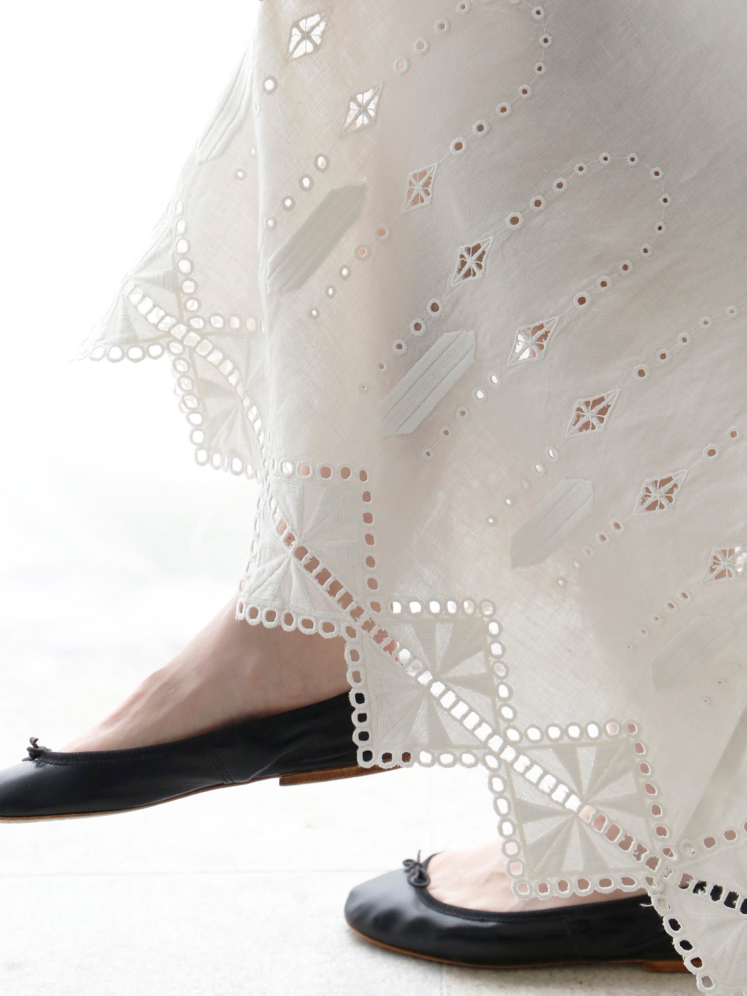 ロシェルの最大の魅力は、裾にあしらわれたオリジナルデザインのレースと刺繍。「No.16」では、裾周りにぐるりとハシゴレースがあしらわれ、丸いアイレットがスクエアの輪郭を描くように涼やかに施されています。