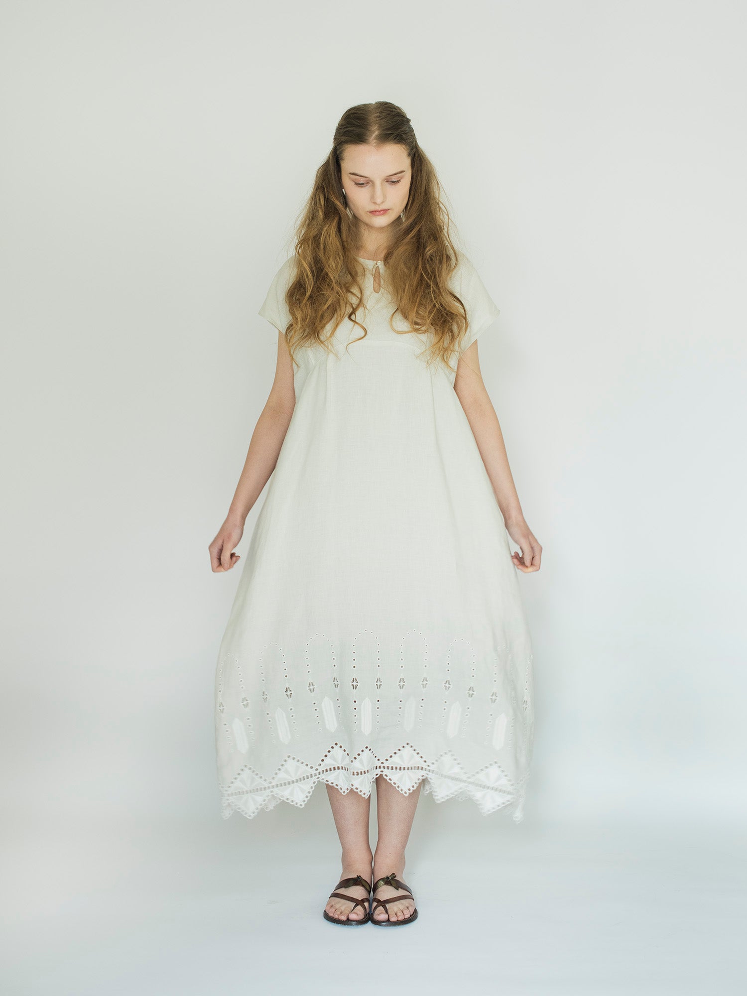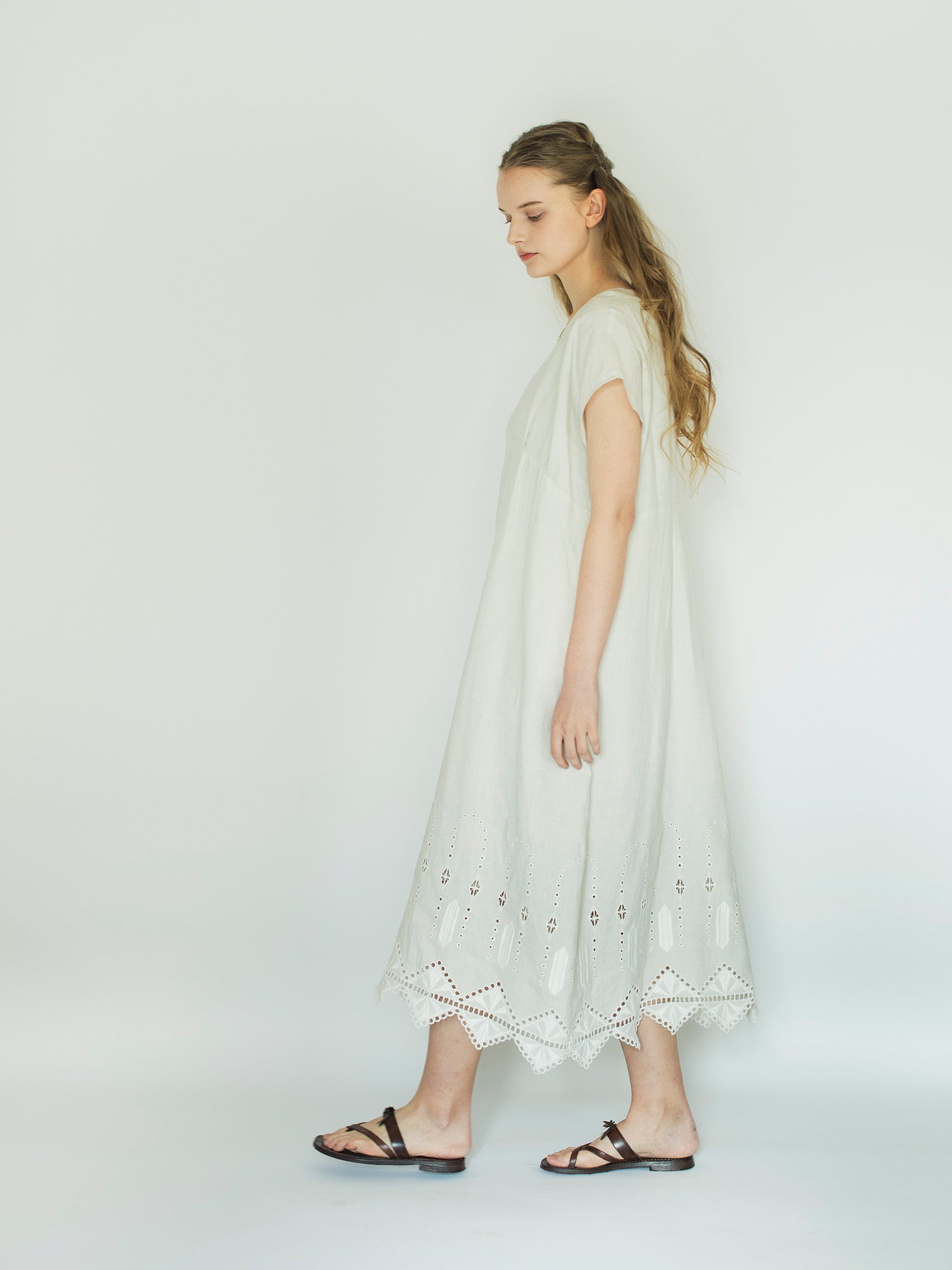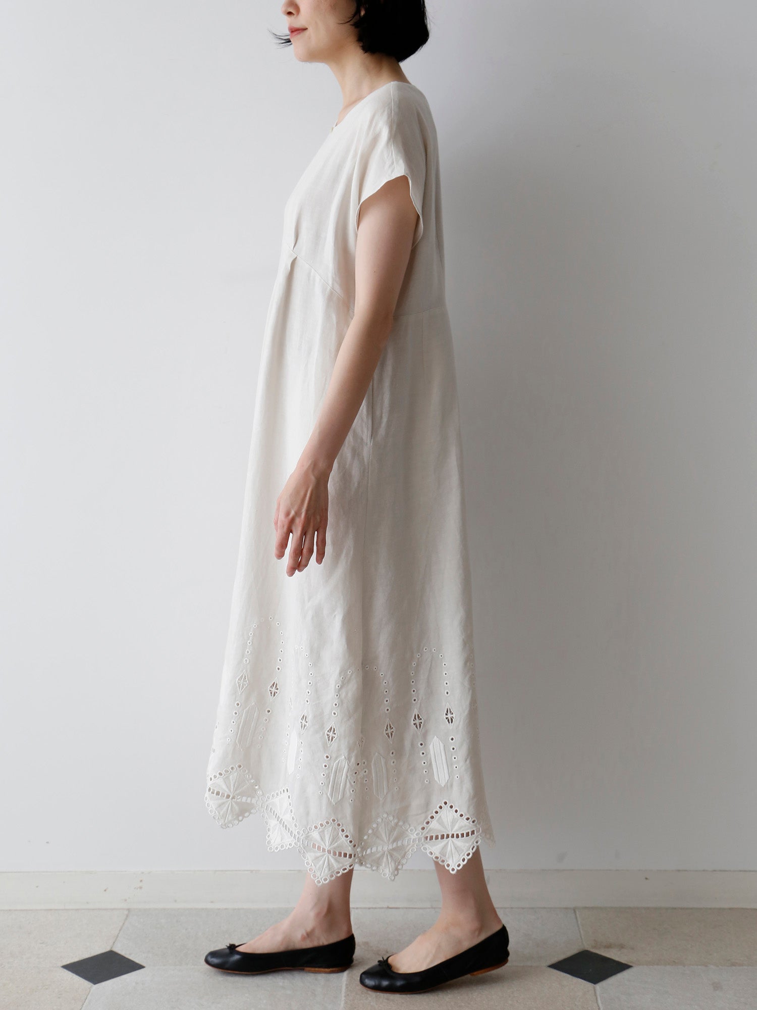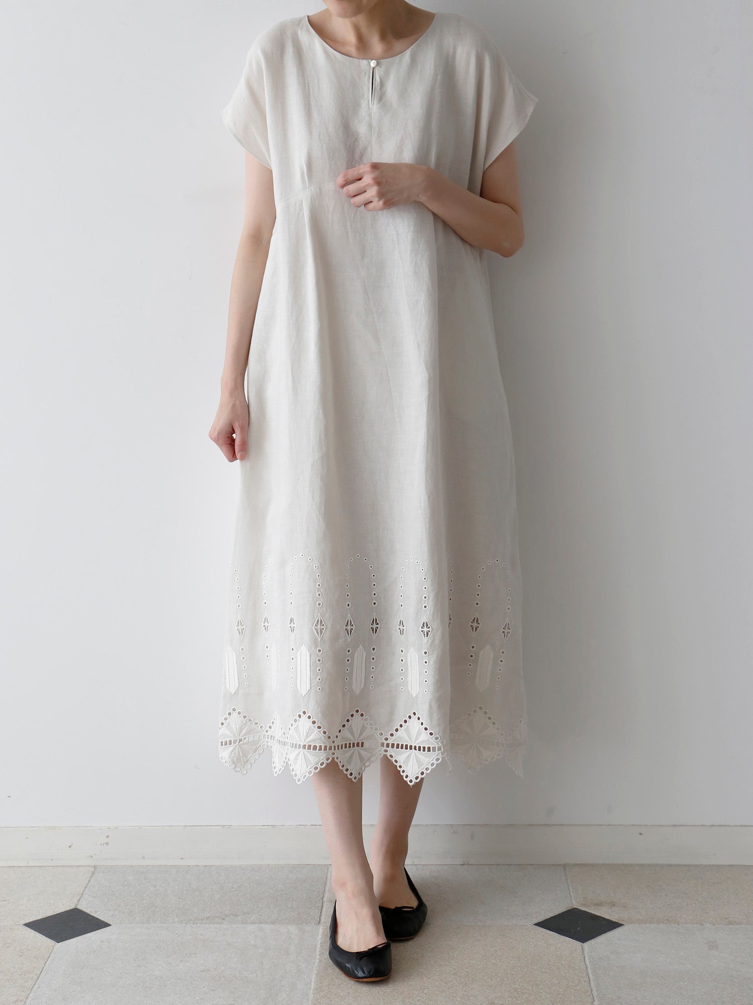 ロシェルの最大の魅力は、裾にあしらわれたオリジナルデザインのレースと刺繍。「No.16」では、裾周りにぐるりとハシゴレースがあしらわれ、丸いアイレットがスクエアの輪郭を描くように涼やかに施されています。