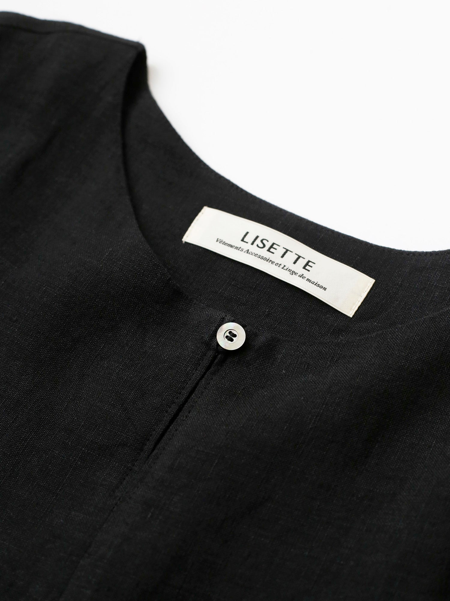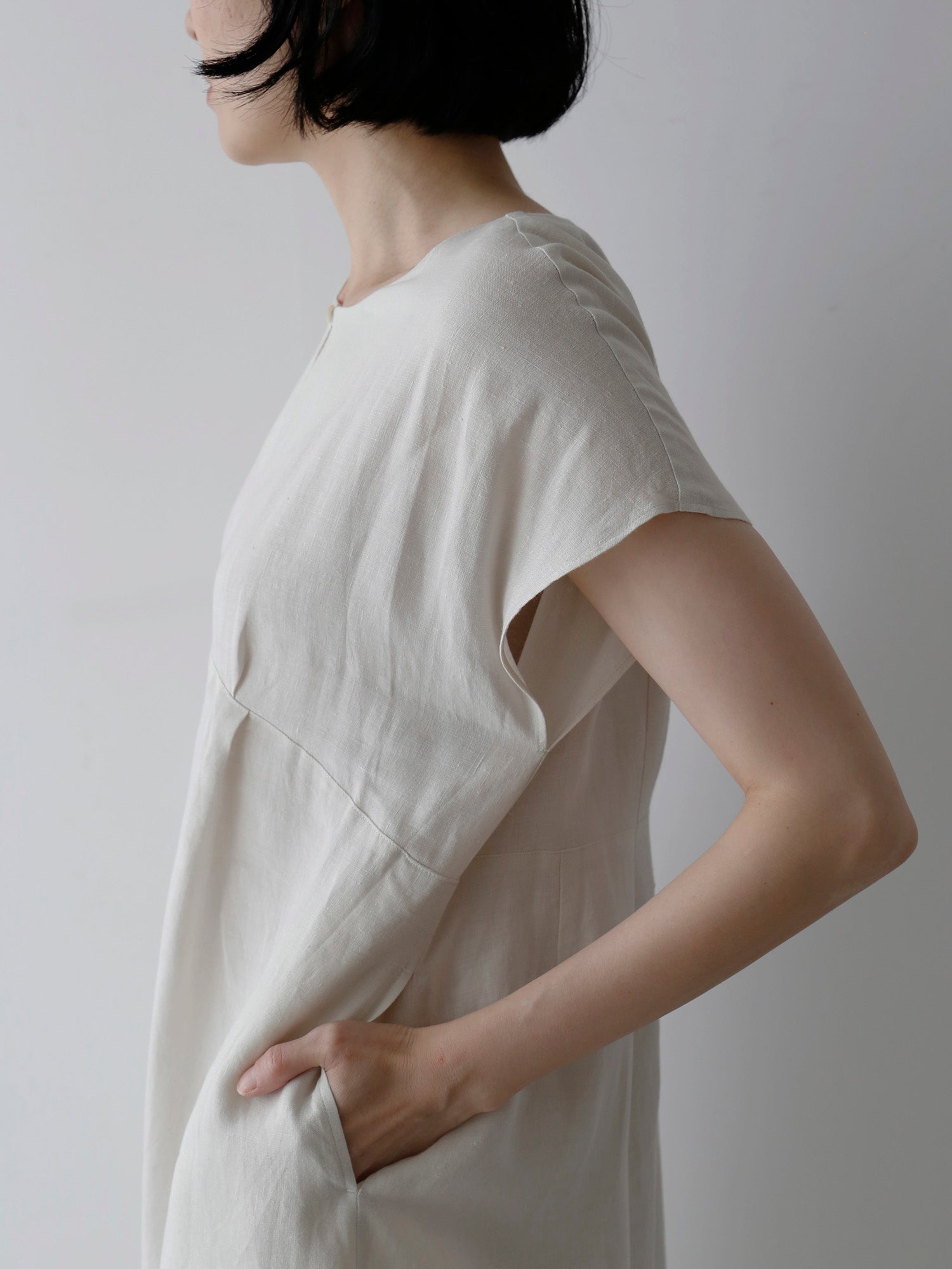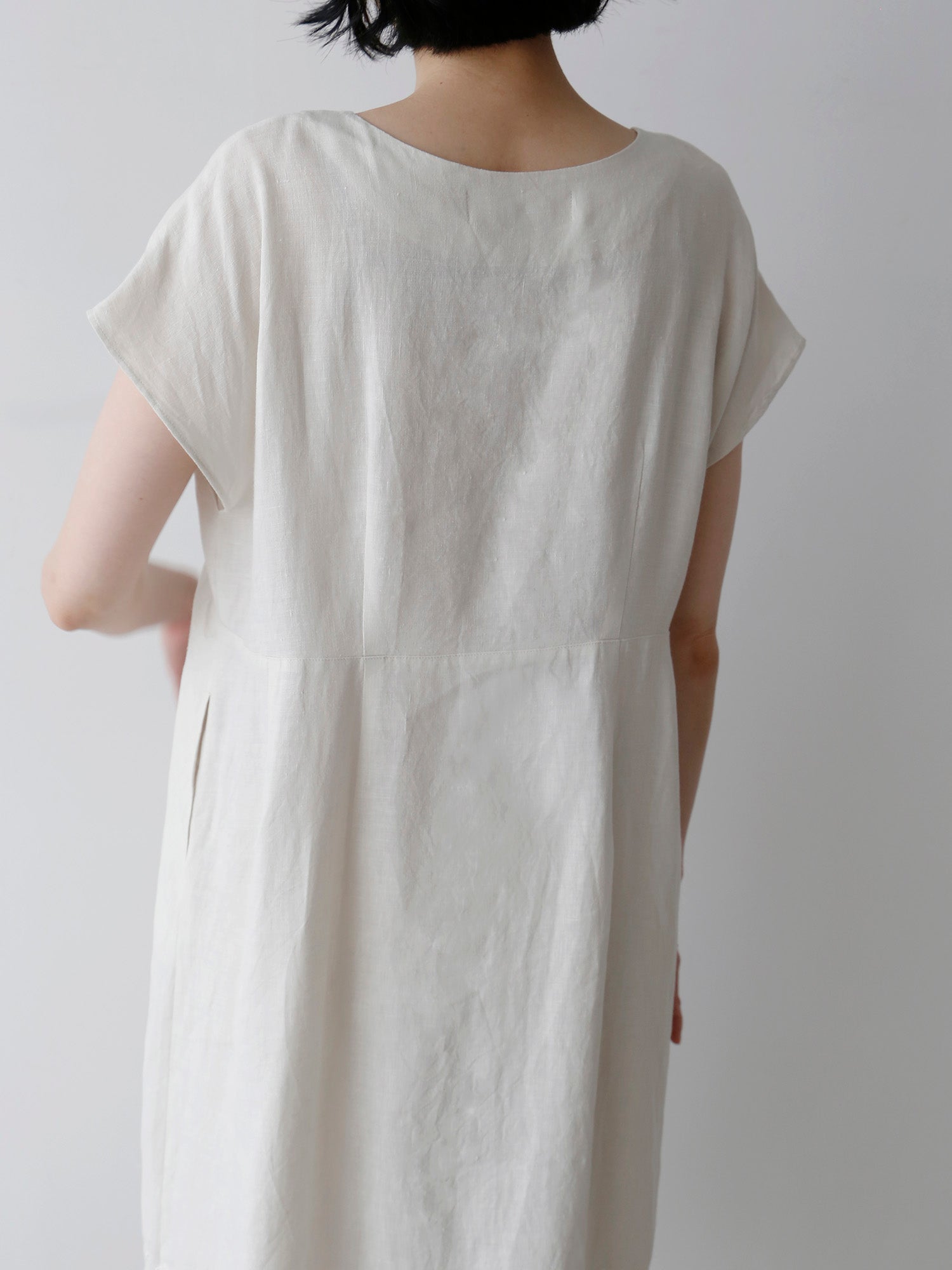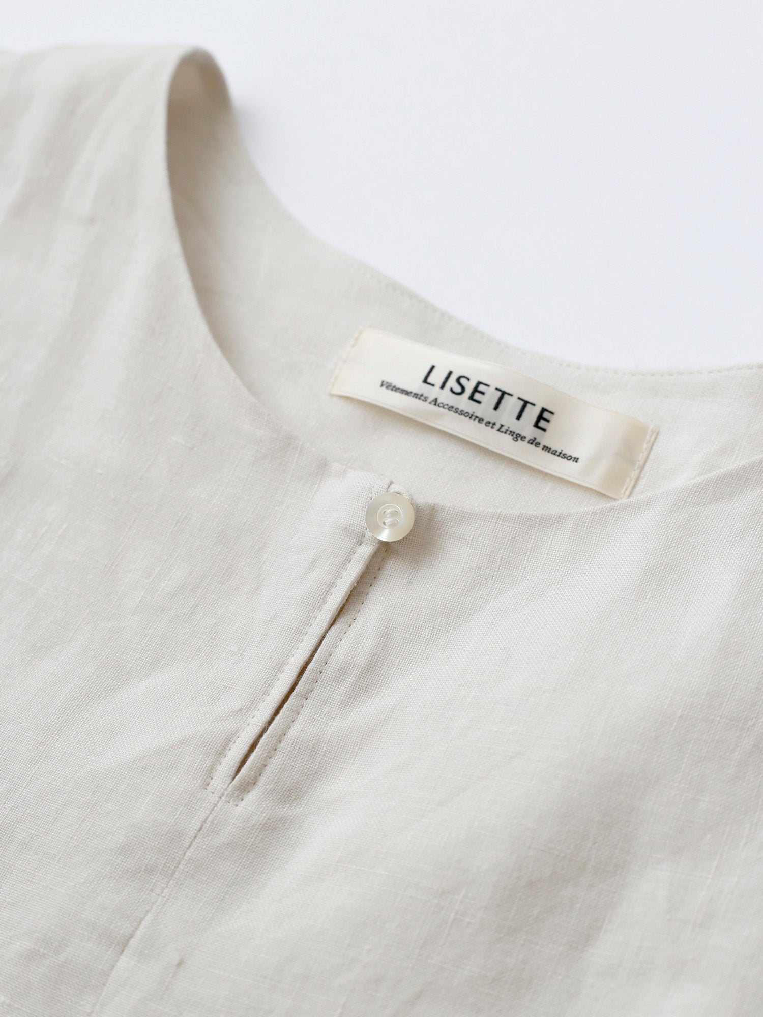 曲線を描く高めのウエスト切り替えと襟元のスリットが、リゼッタらしいこだわりを感じさせつつ、全体をすっきりと涼やかに見せてくれます。優雅さをまといながら、軽やかに着られる一枚です。