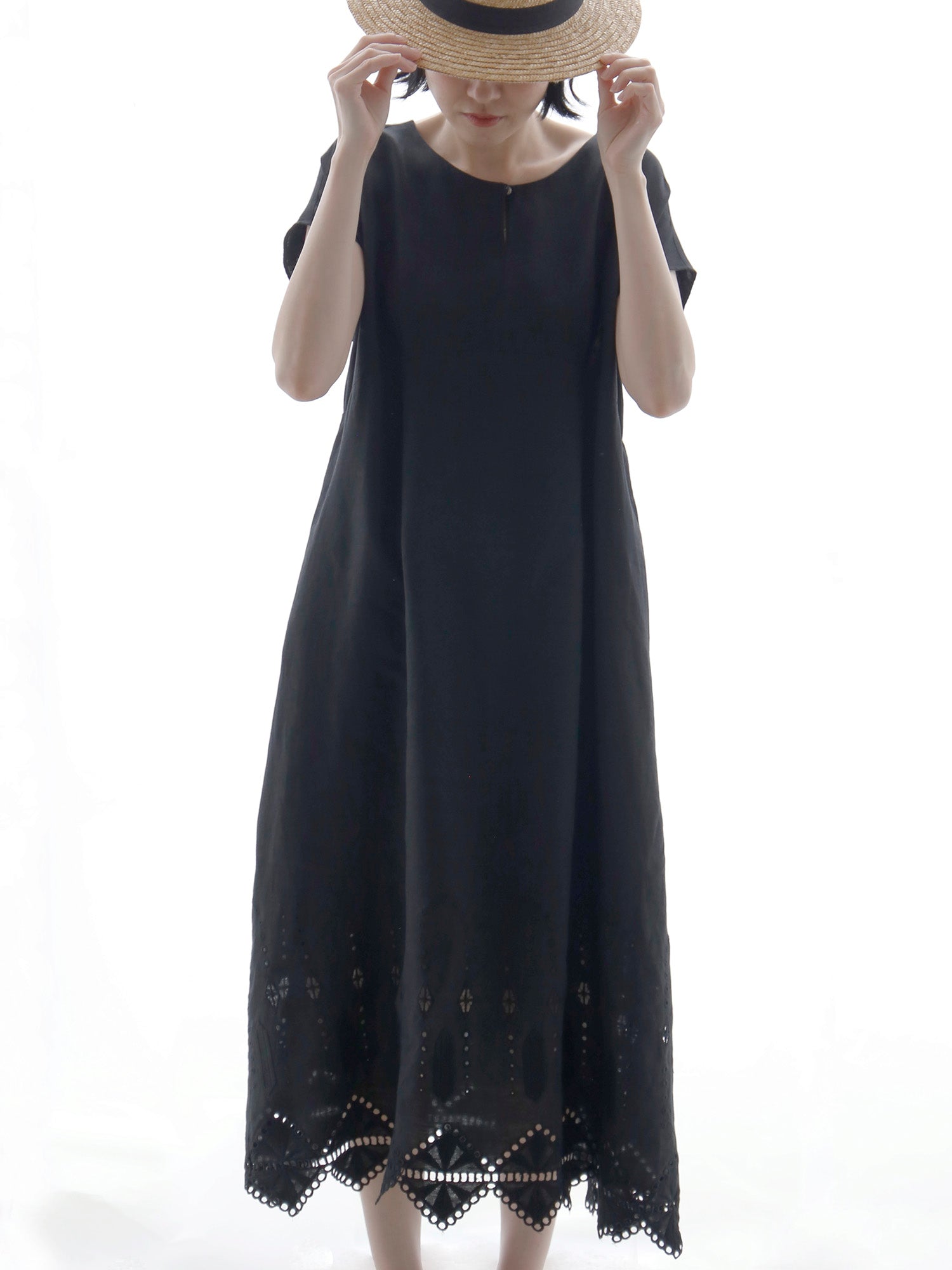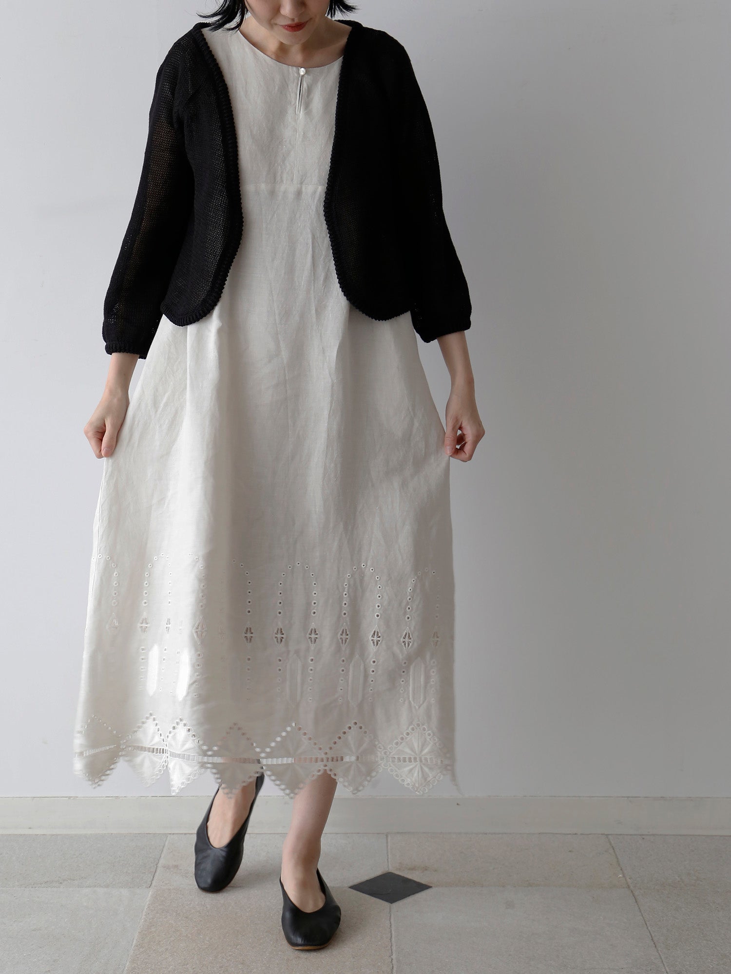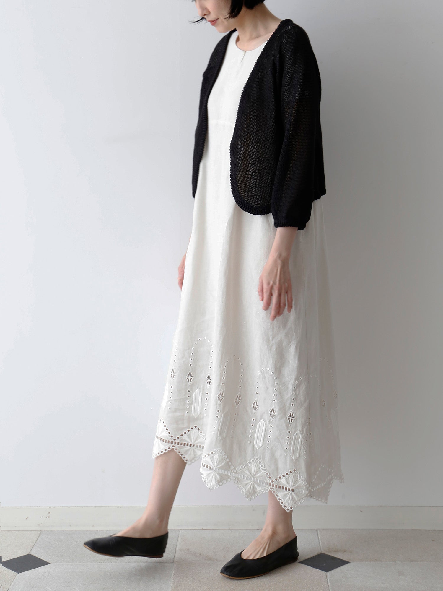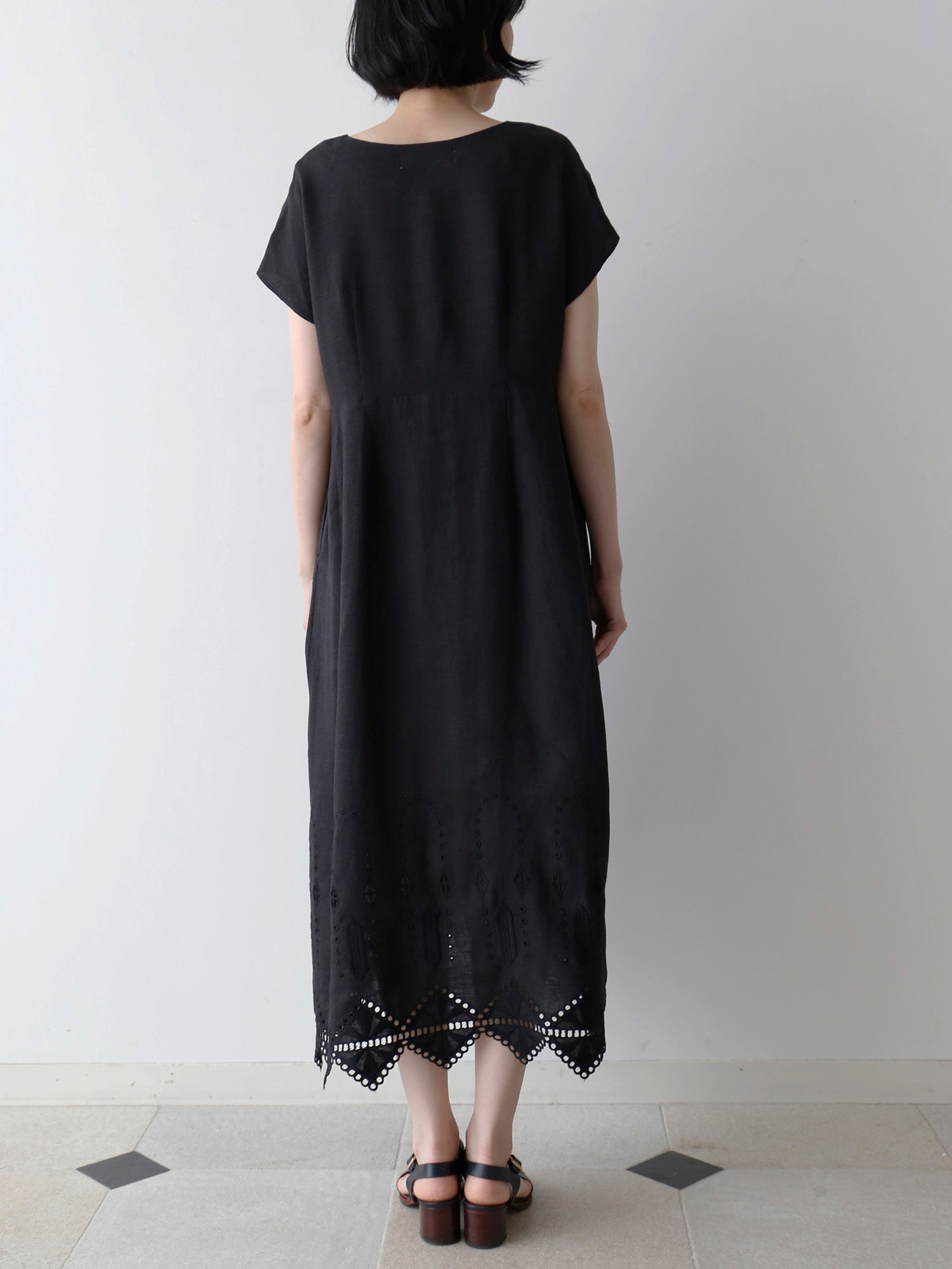 ノアール(黒)は、裾の刺繍とレースの透け感が際立ち、涼しげで軽やかな印象に。一枚で着ても華やかで、ワントーンコーディネートでも重たくなりません。