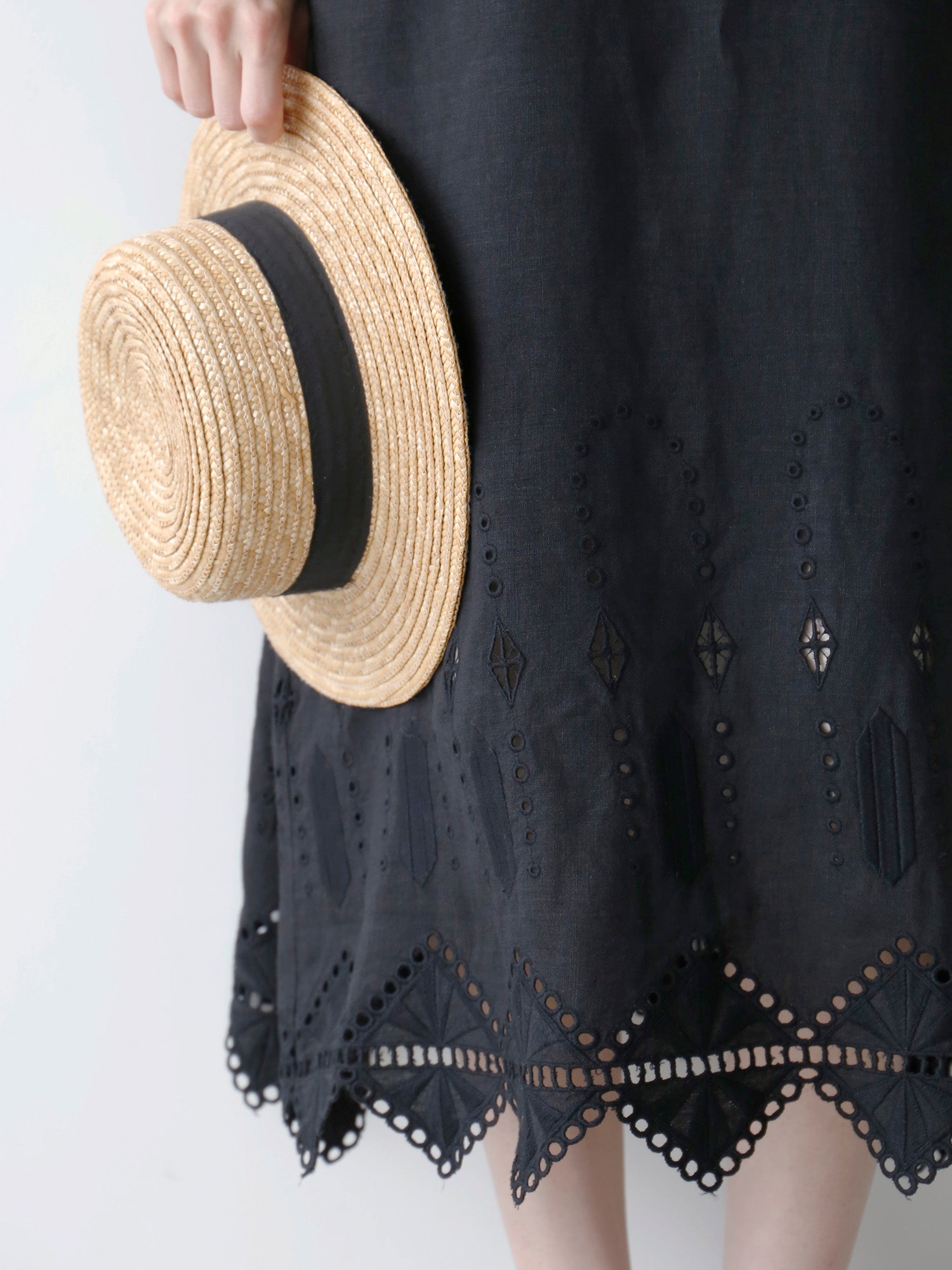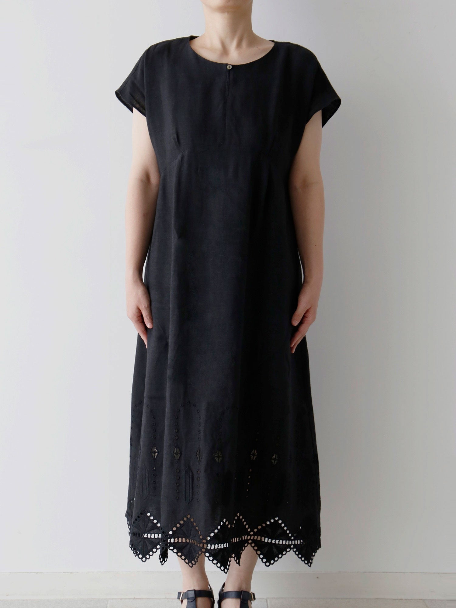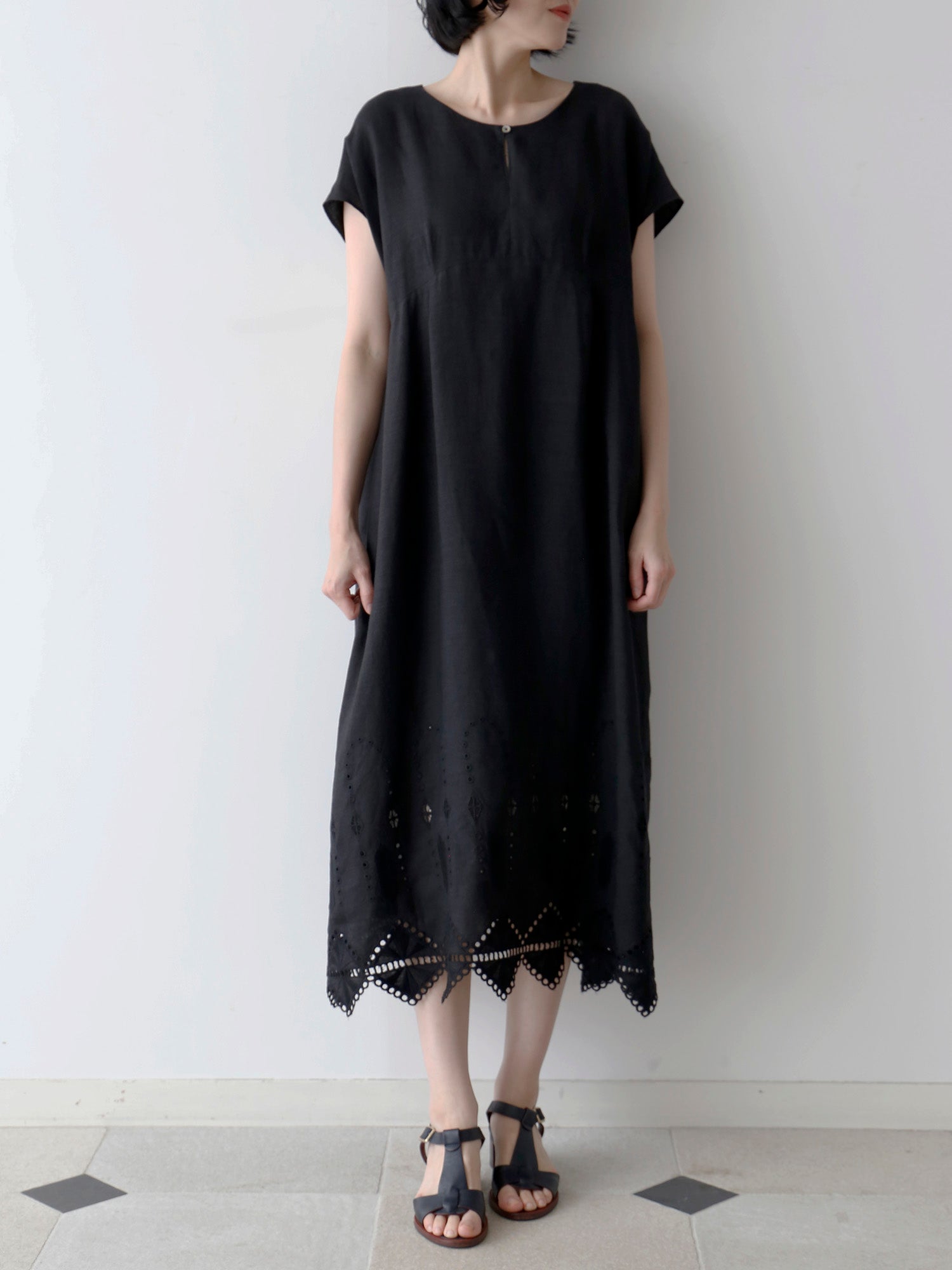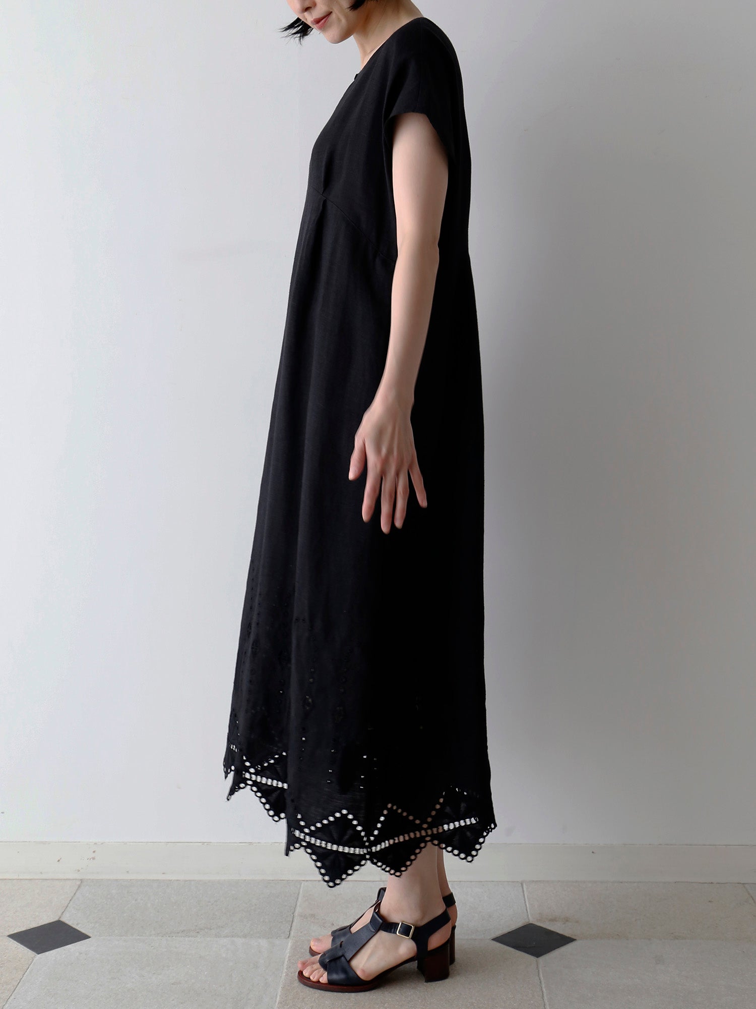 ノアール(黒)は、裾の刺繍とレースの透け感が際立ち、涼しげで軽やかな印象に。一枚で着ても華やかで、ワントーンコーディネートでも重たくなりません。