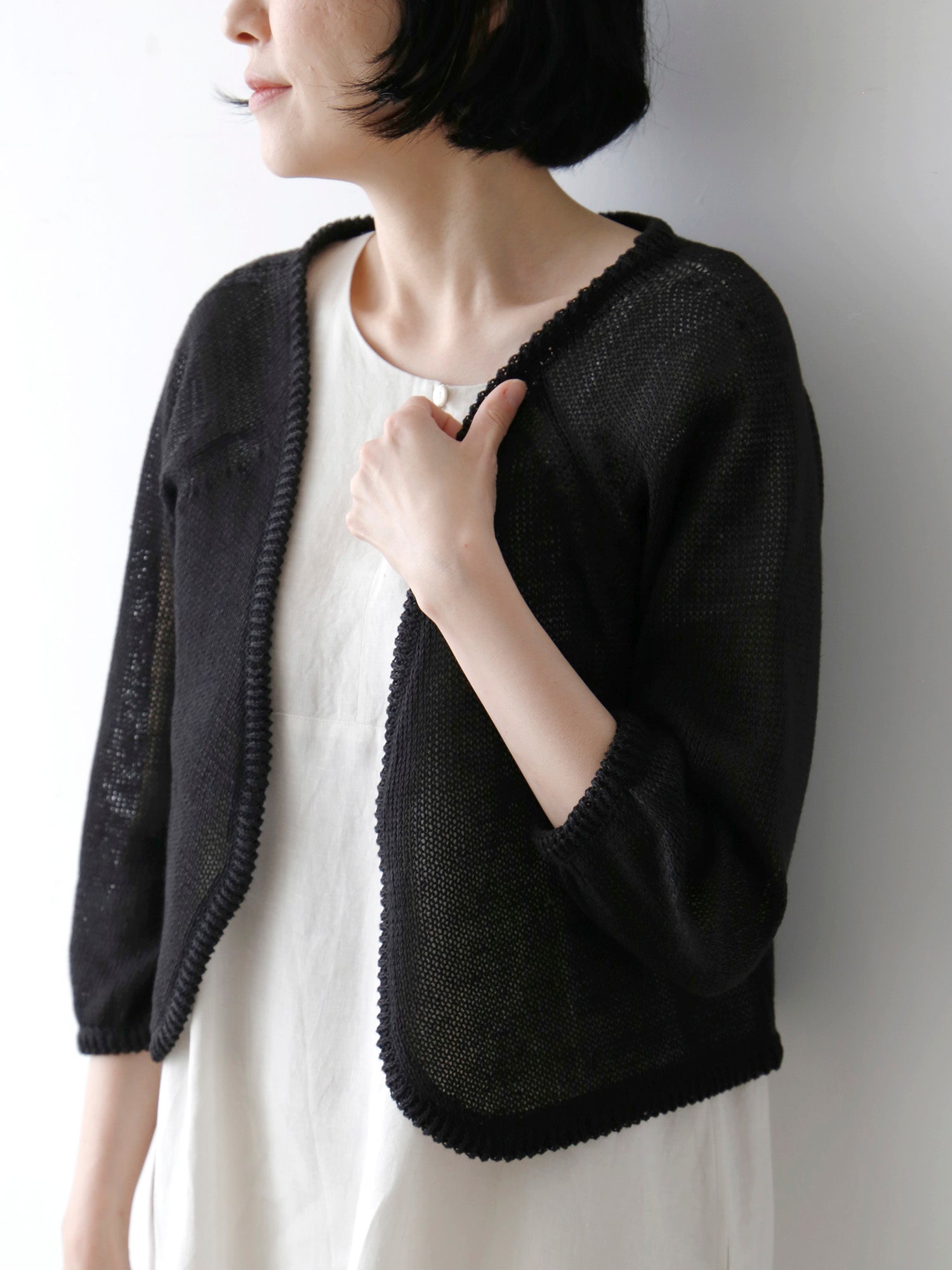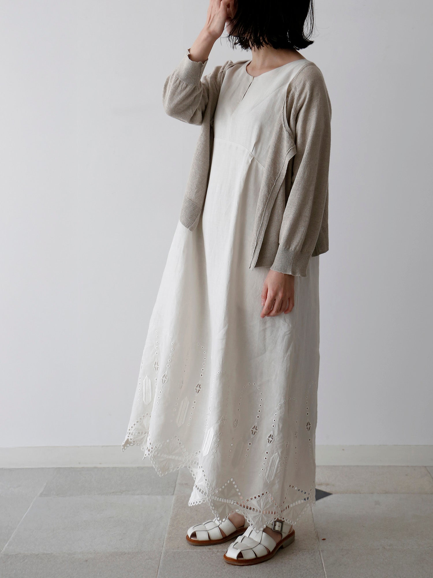 アンティークホワイトは透け感が気になる場合があり、またアームホールが開いたデザインなので、中にインナーをお召しいただくと安心です。
