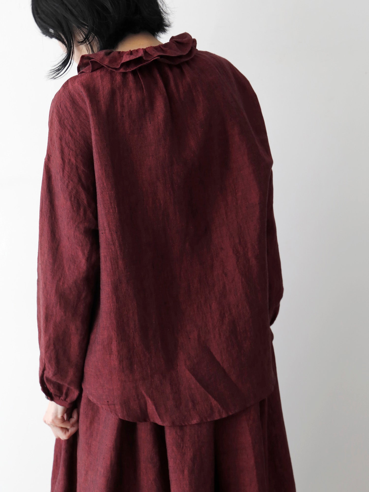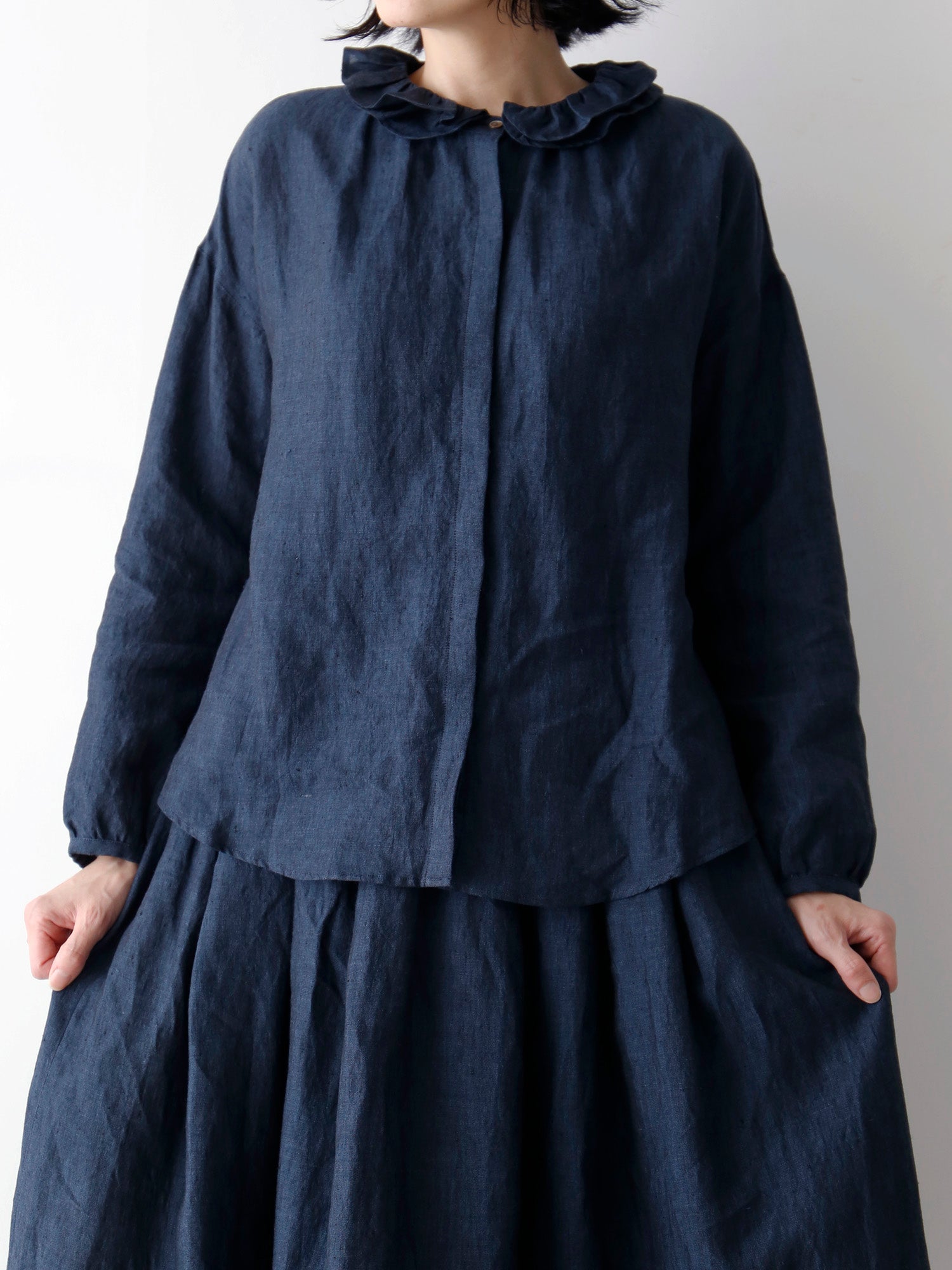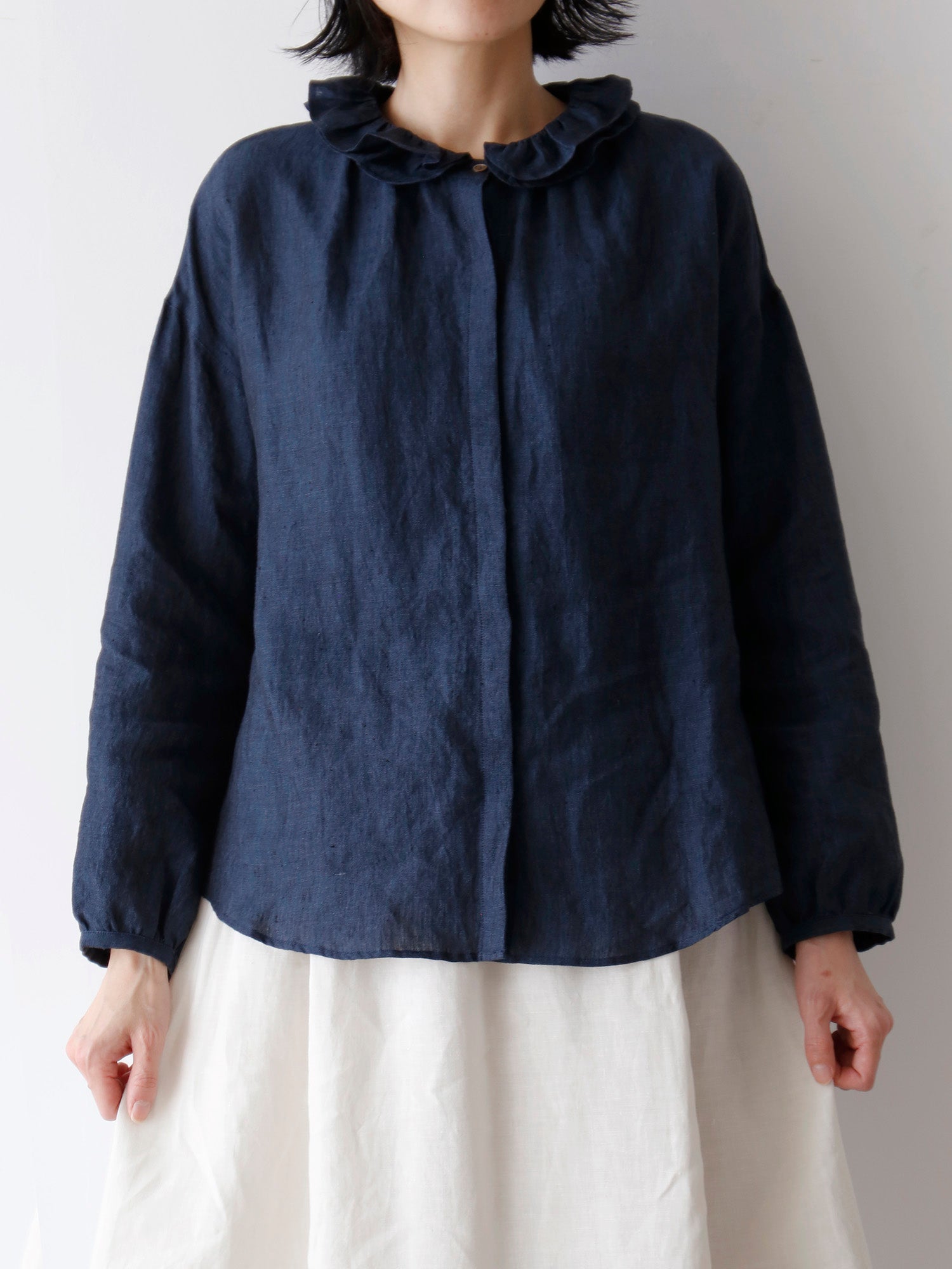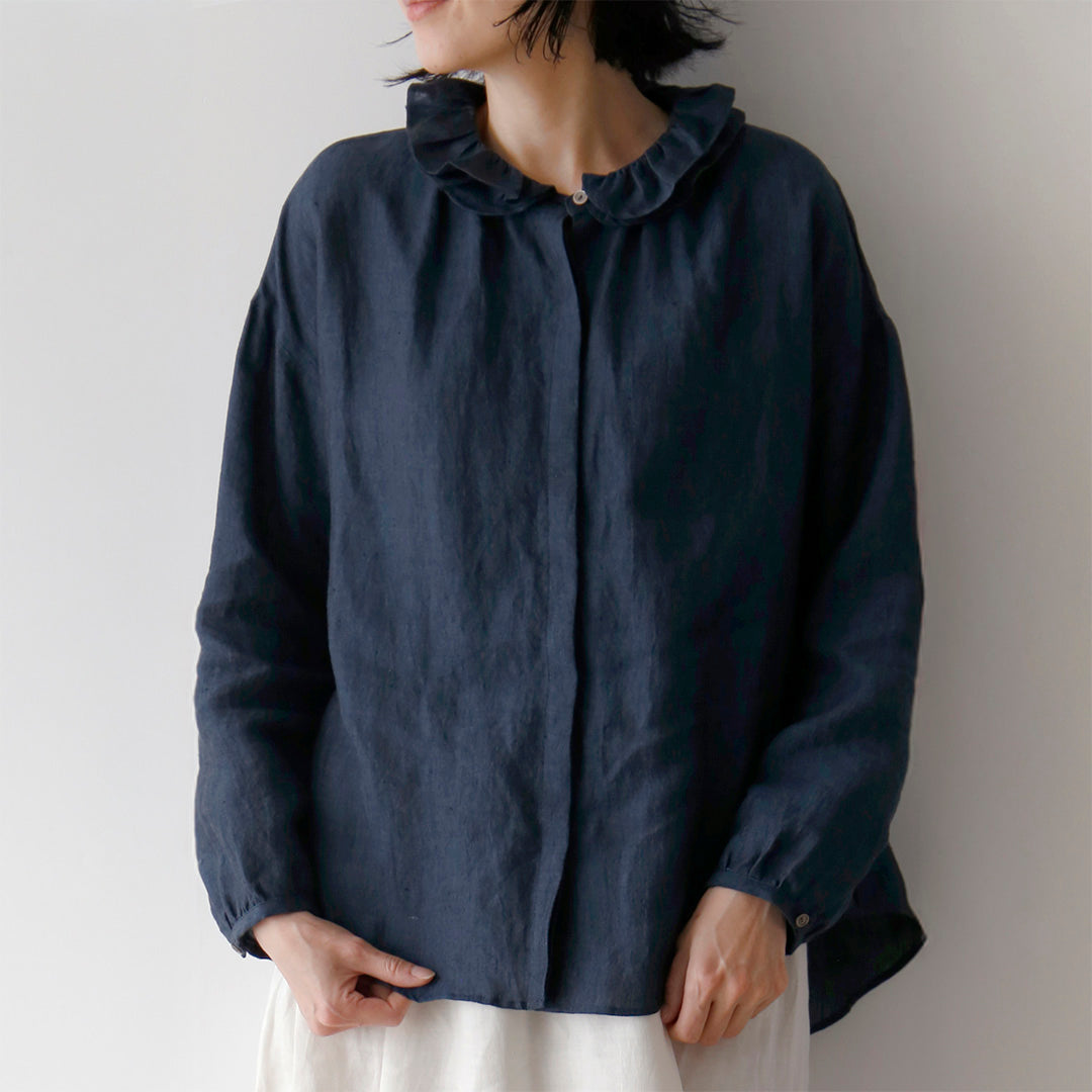 このブラウスの特徴は、ダブルフリルのカラー。ギャザーを寄せた二重の衿が、顔周りを華やかに彩ります。一枚で着てももちろん素敵ですが、寒くなってきたらニットやジャケットと重ねて、レイヤードアイテムとしても活躍します。