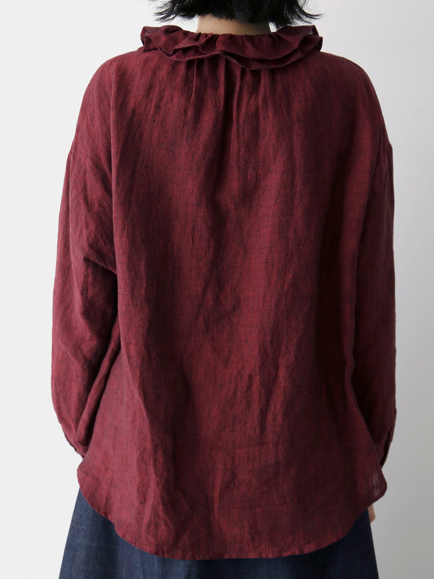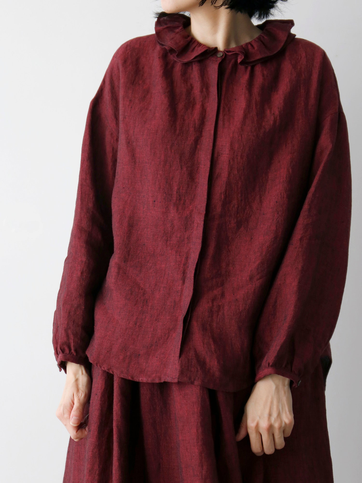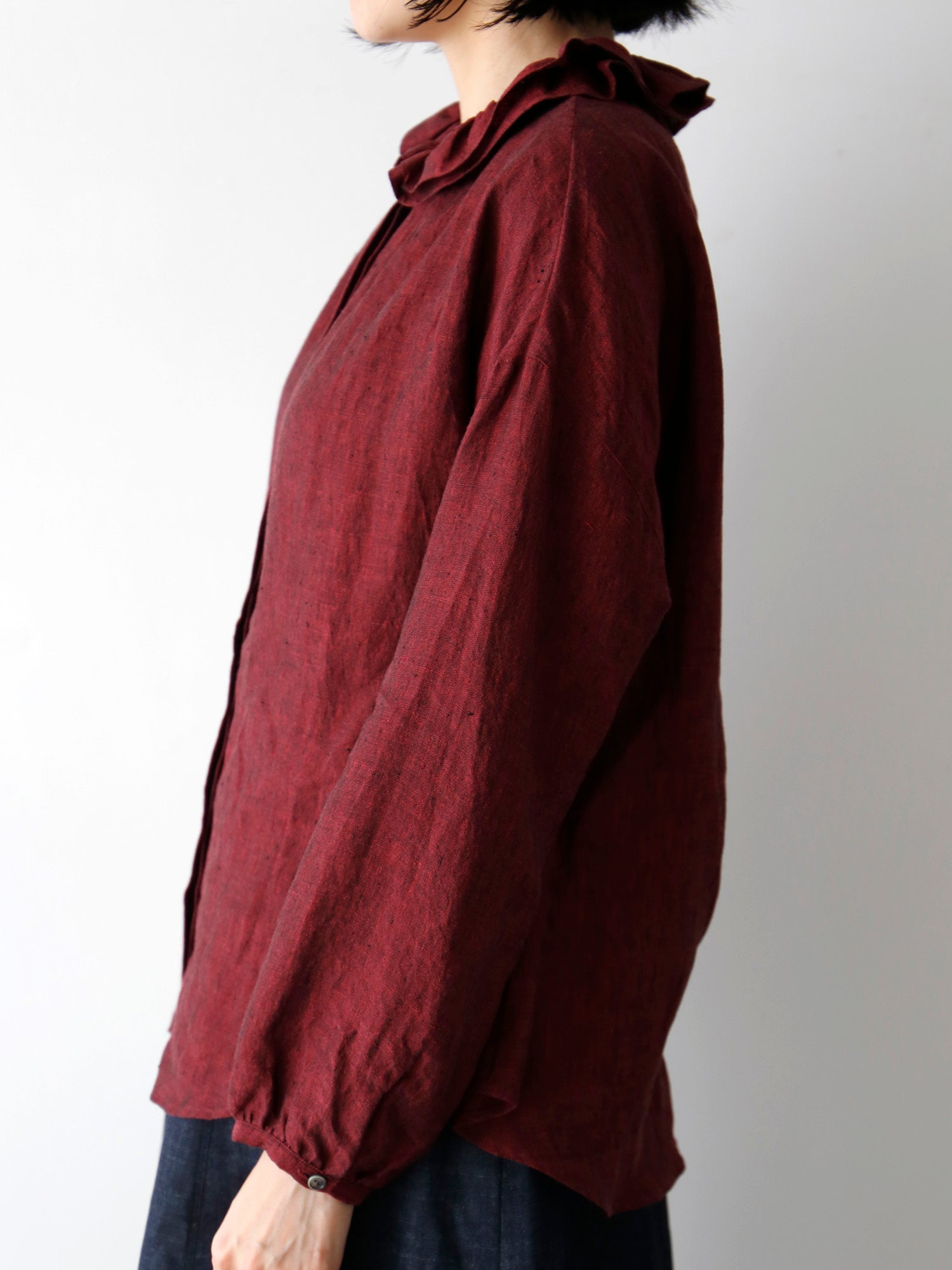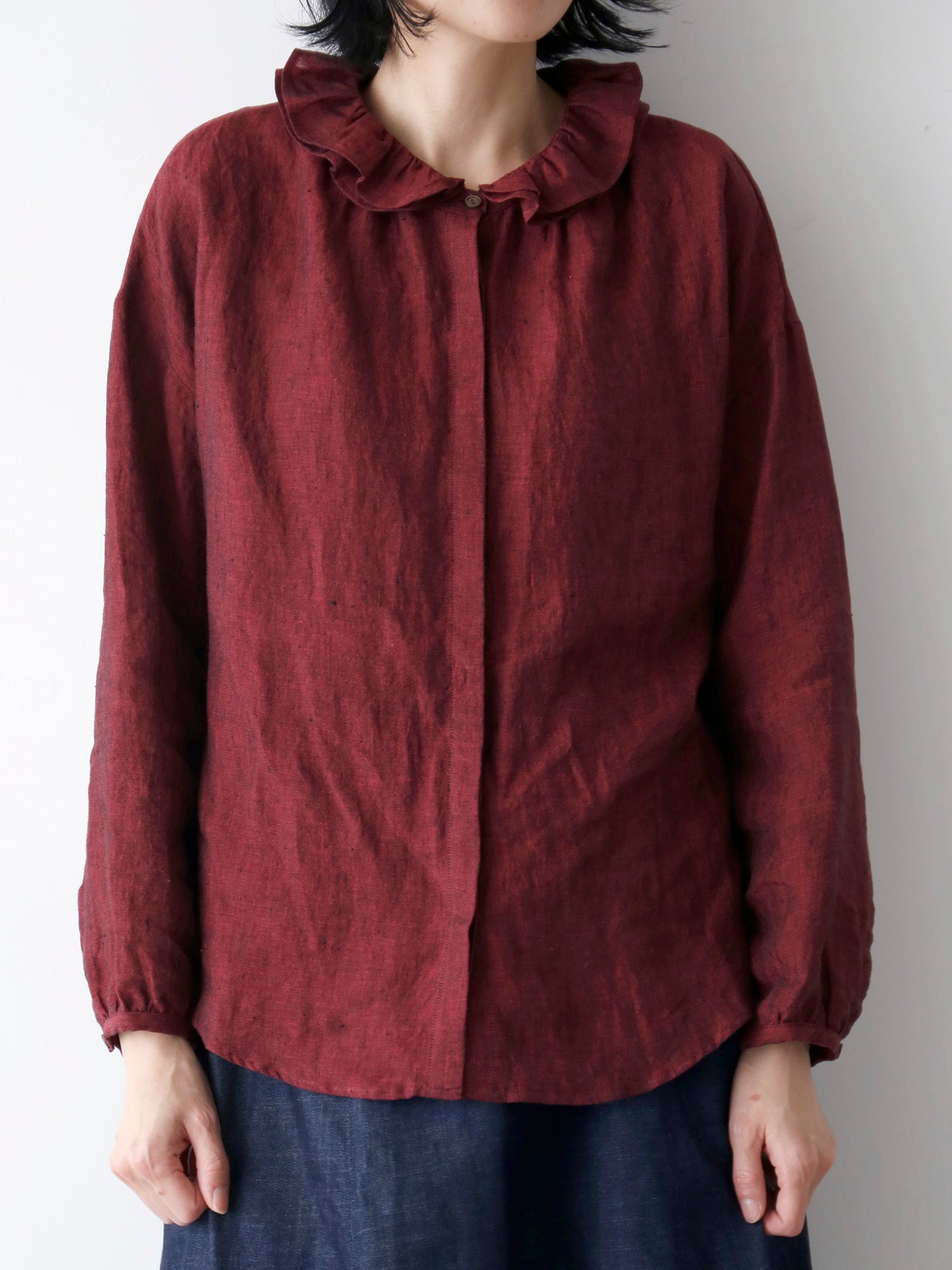 このブラウスの特徴は、ダブルフリルのカラー。ギャザーを寄せた二重の衿が、顔周りを華やかに彩ります。一枚で着てももちろん素敵ですが、寒くなってきたらニットやジャケットと重ねて、レイヤードアイテムとしても活躍します。