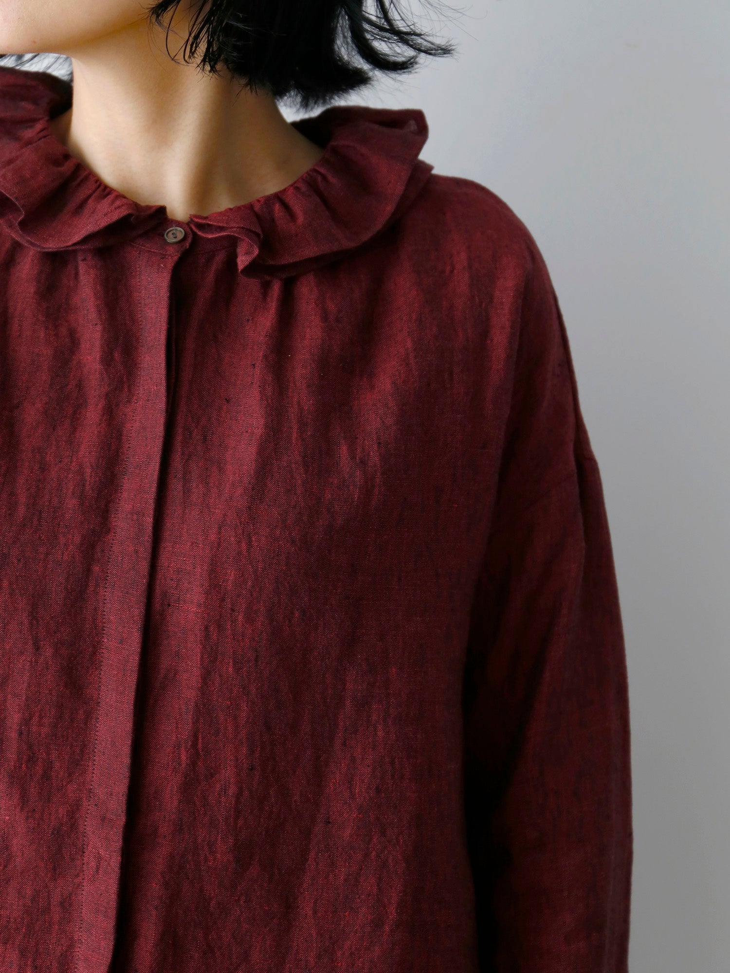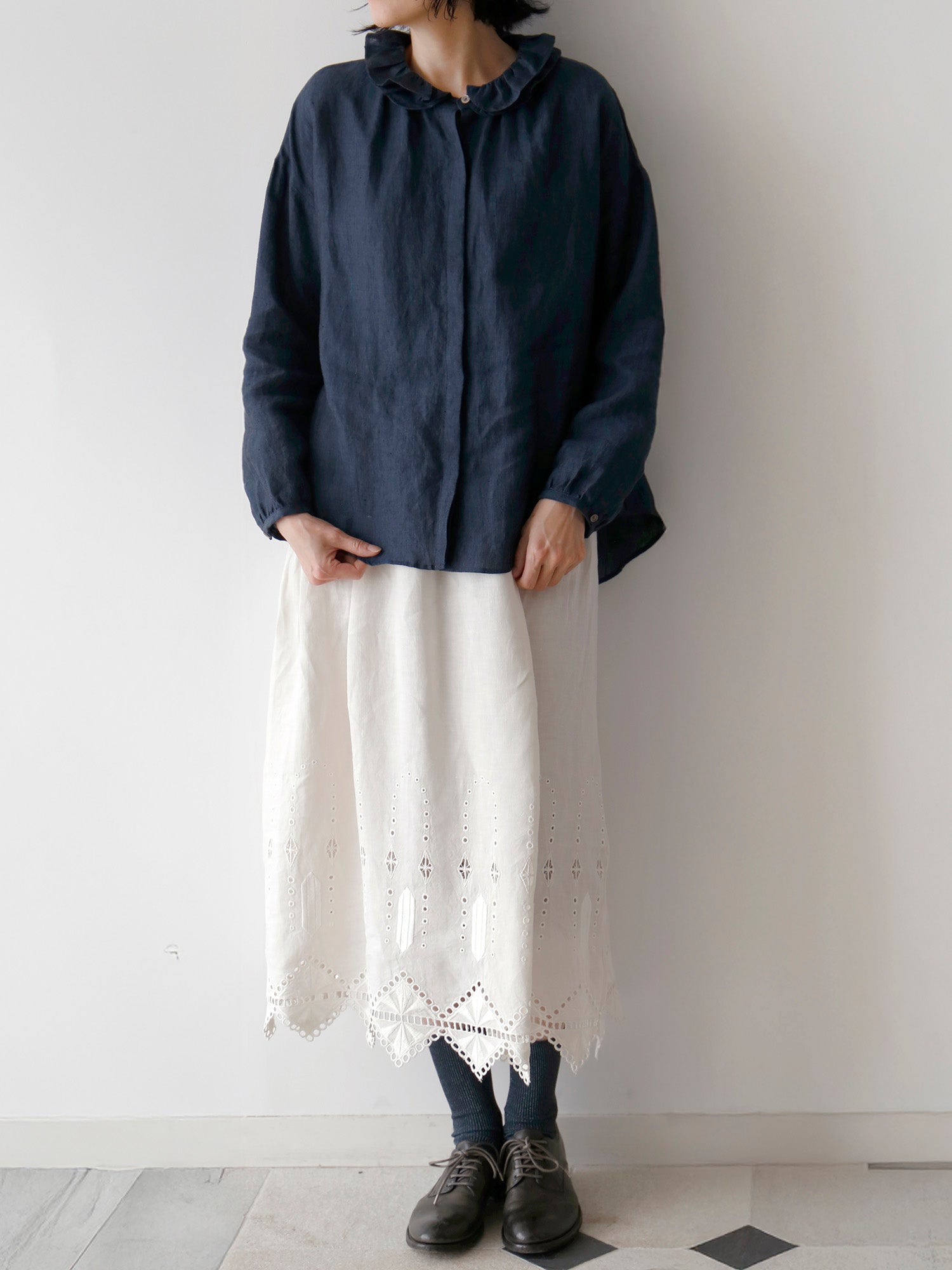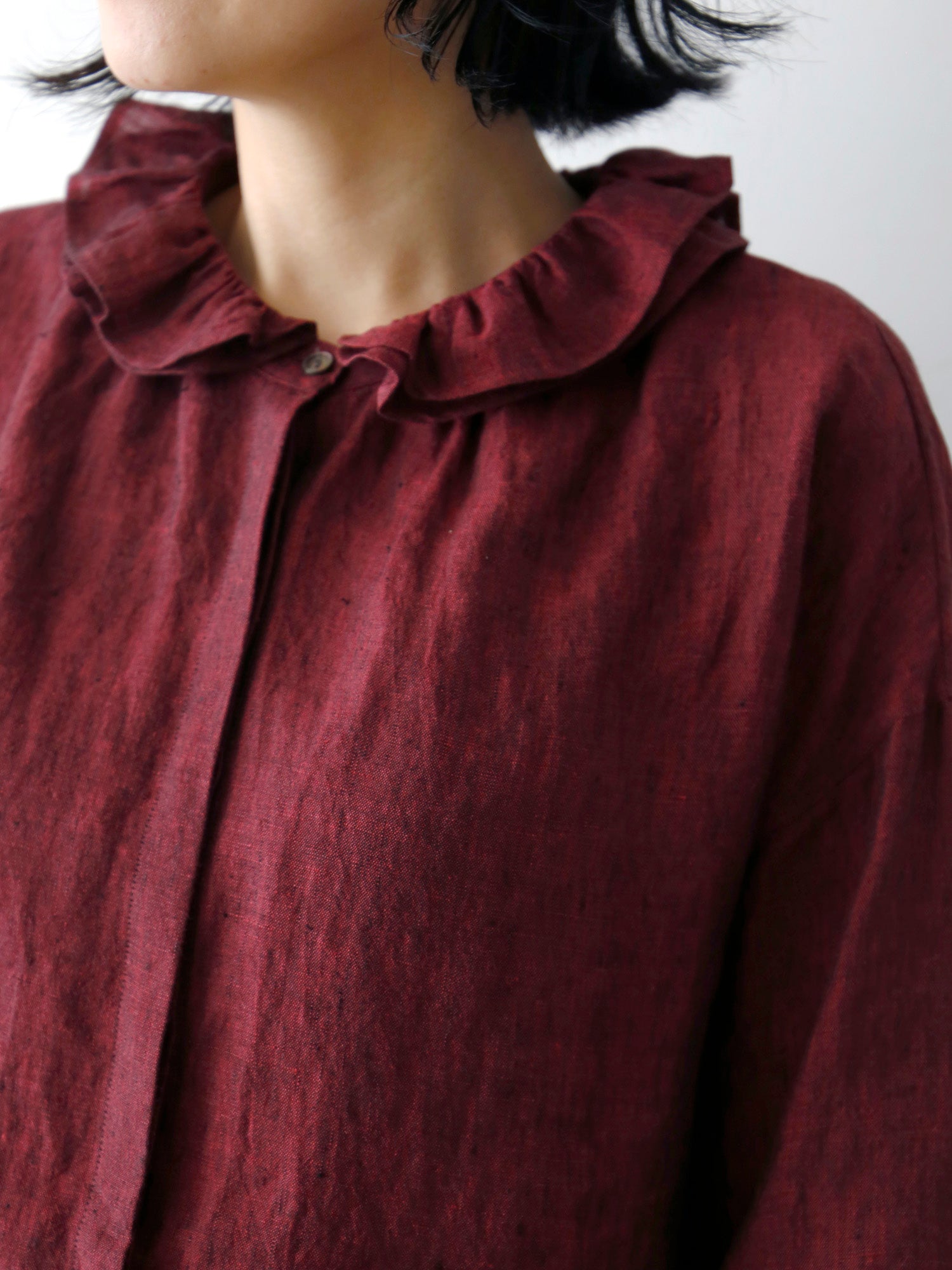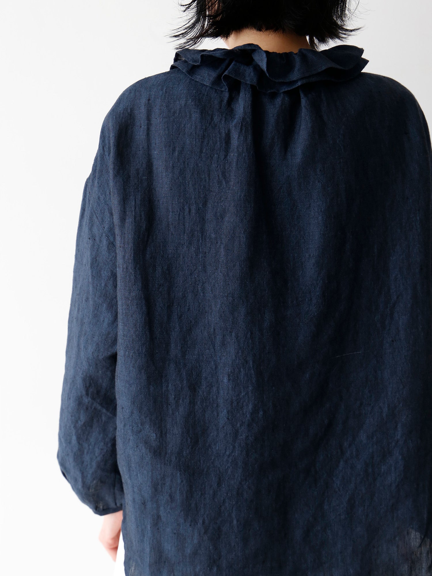 このブラウスの特徴は、ダブルフリルのカラー。ギャザーを寄せた二重の衿が、顔周りを華やかに彩ります。一枚で着てももちろん素敵ですが、寒くなってきたらニットやジャケットと重ねて、レイヤードアイテムとしても活躍します。