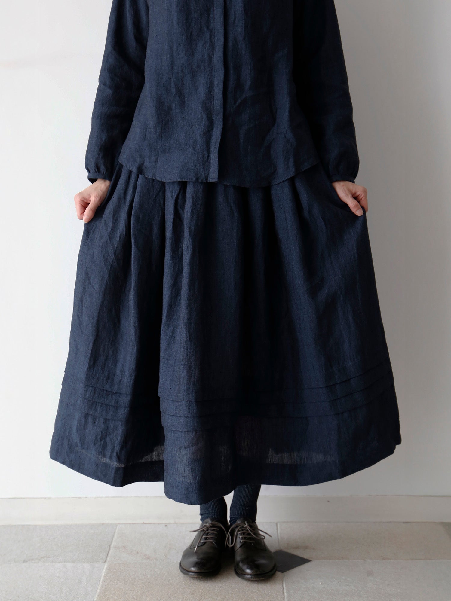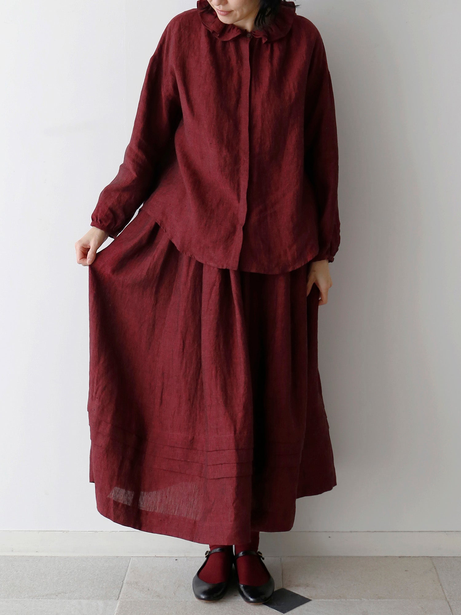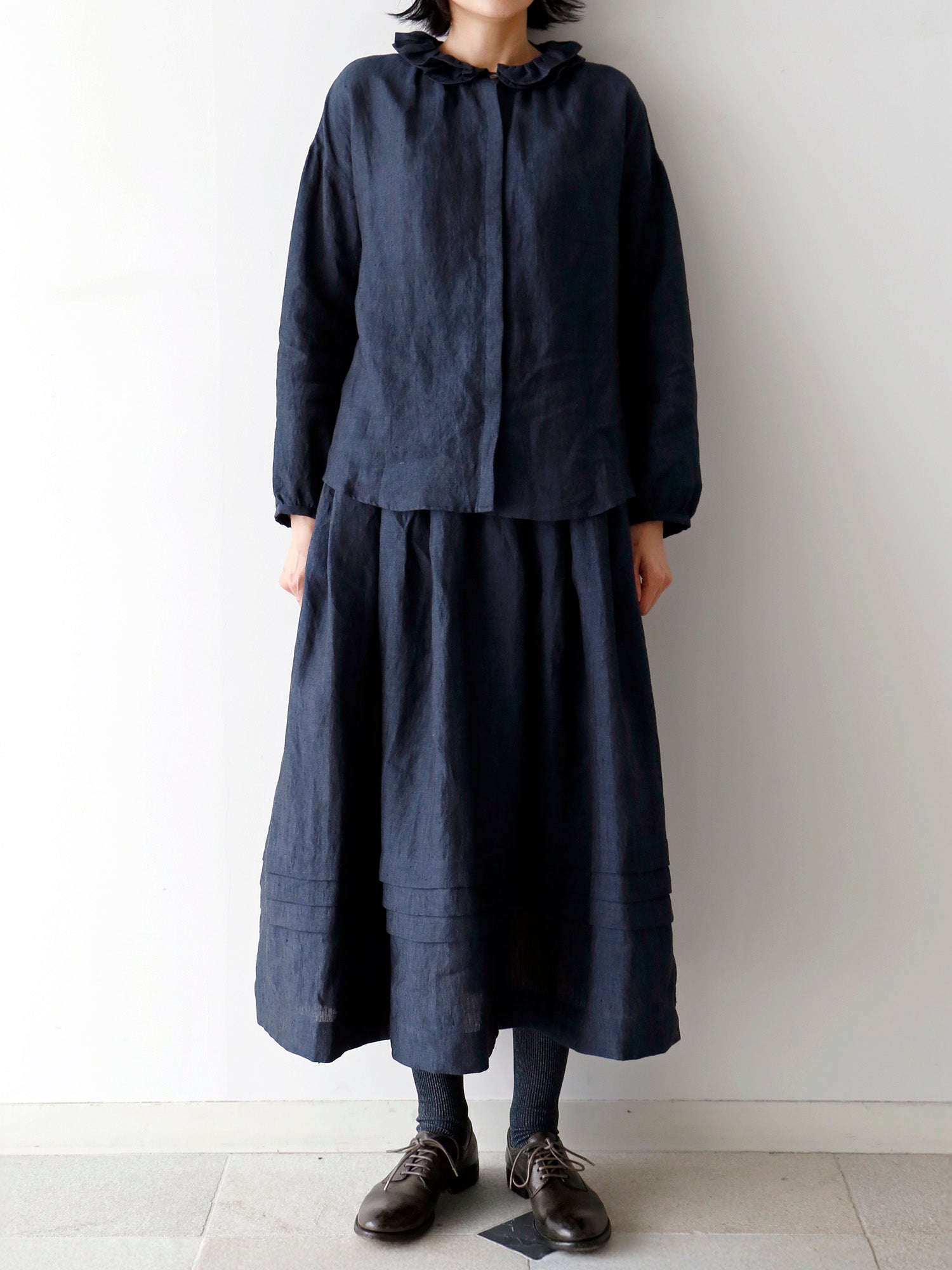 同じ生地で仕立てたスカート《 ローレン 》と合わせれば、ワンピースのような着こなしも楽しめます。