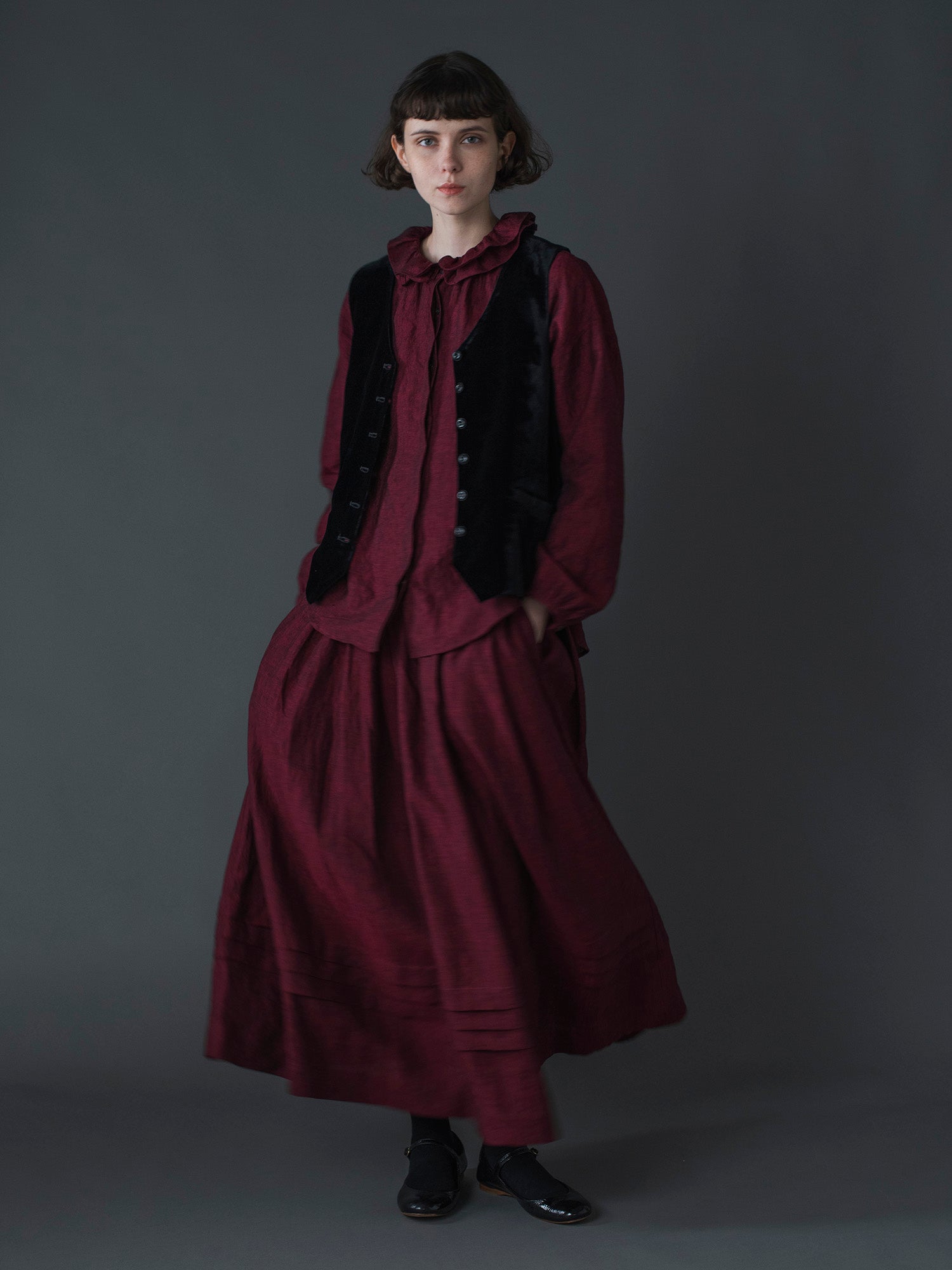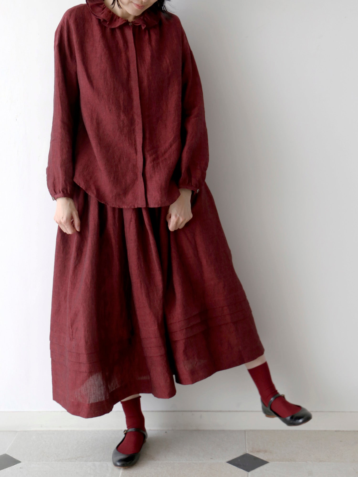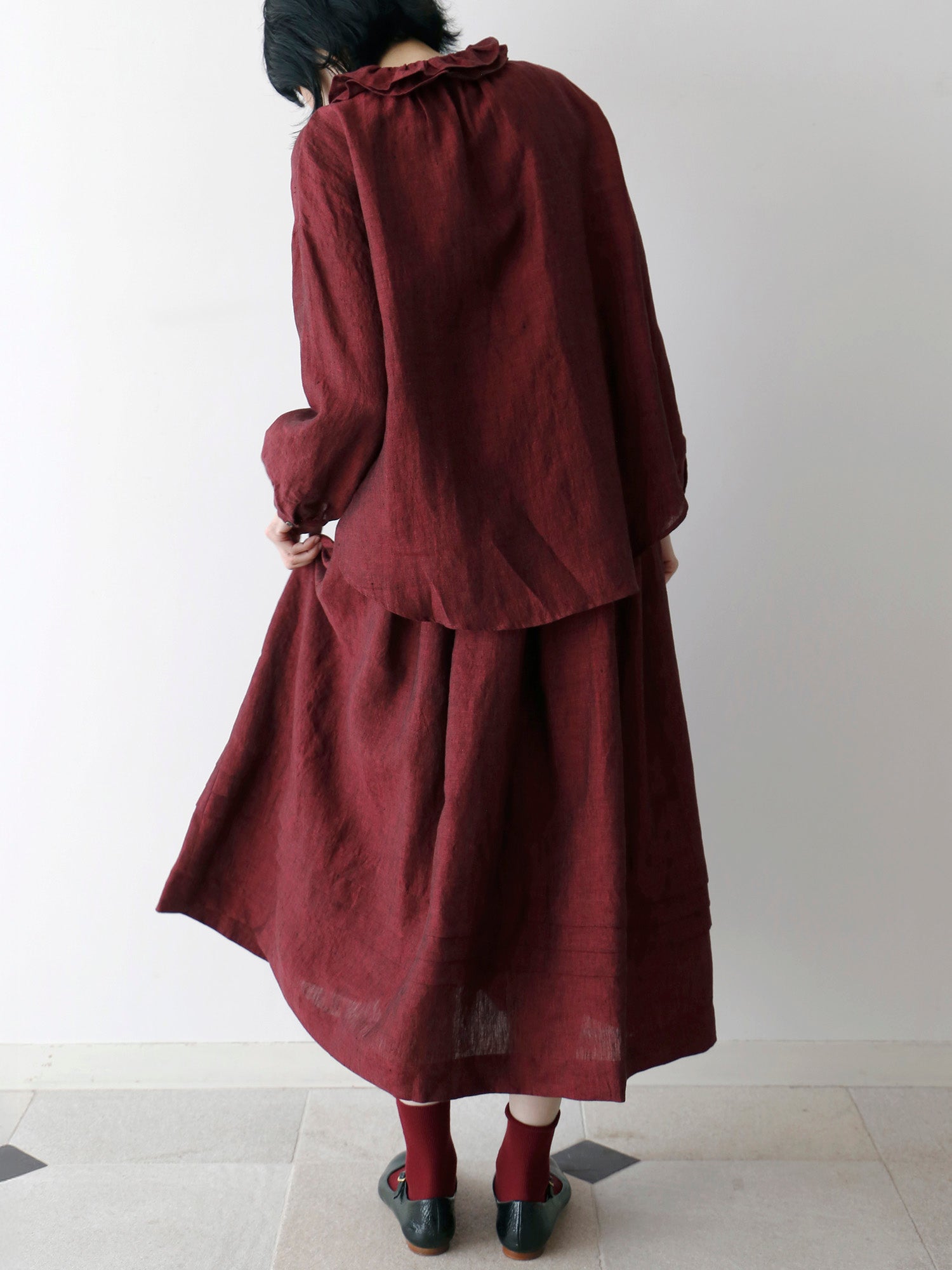 同じ生地で仕立てたスカート《 ローレン 》と合わせれば、ワンピースのような着こなしも楽しめます。