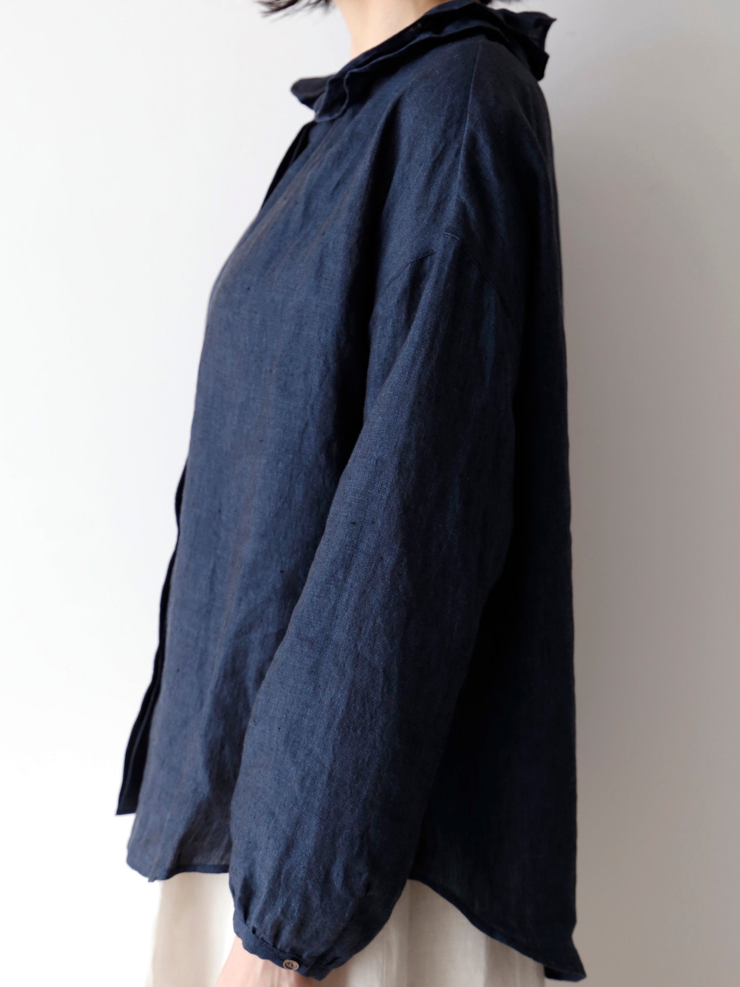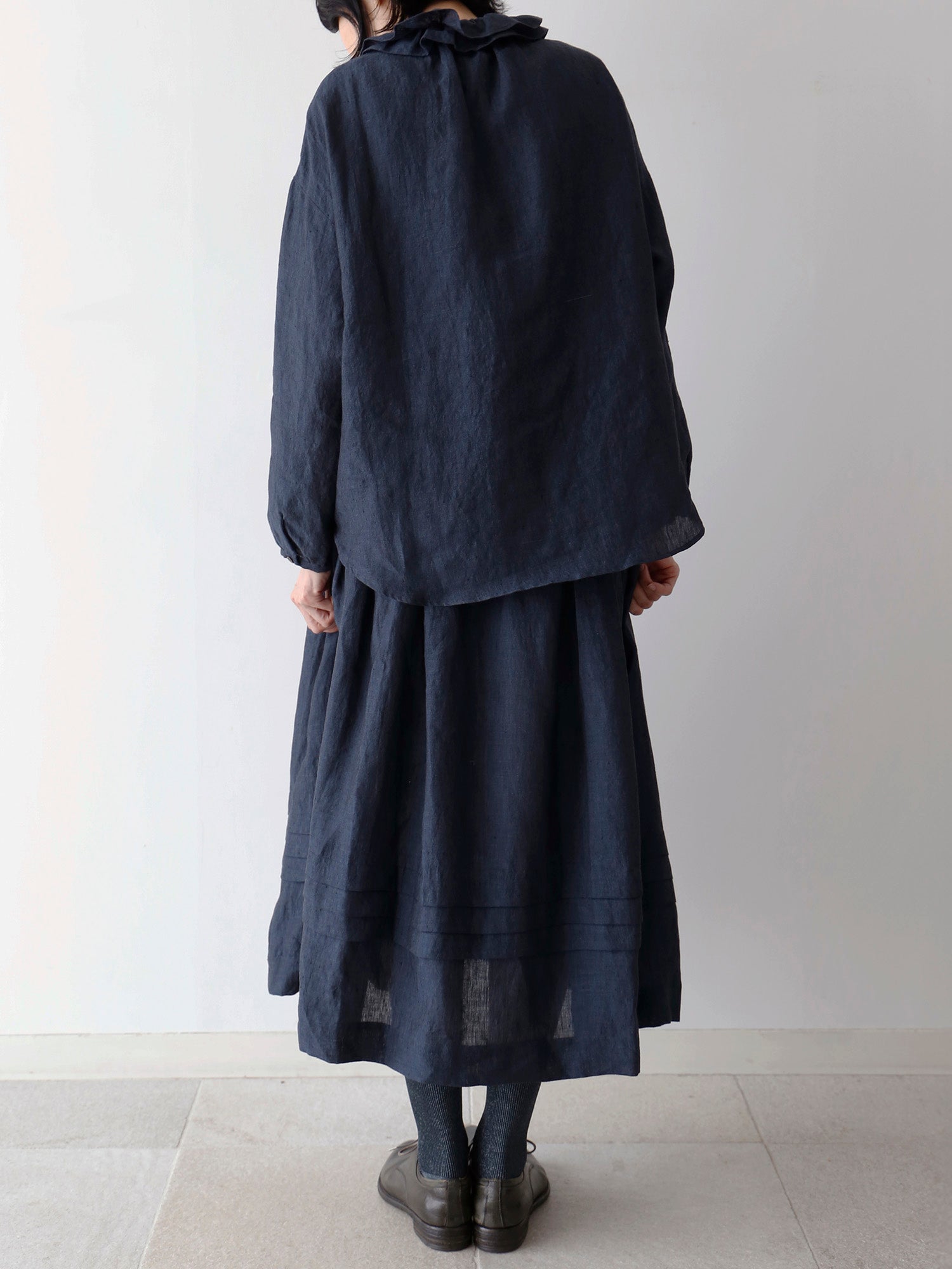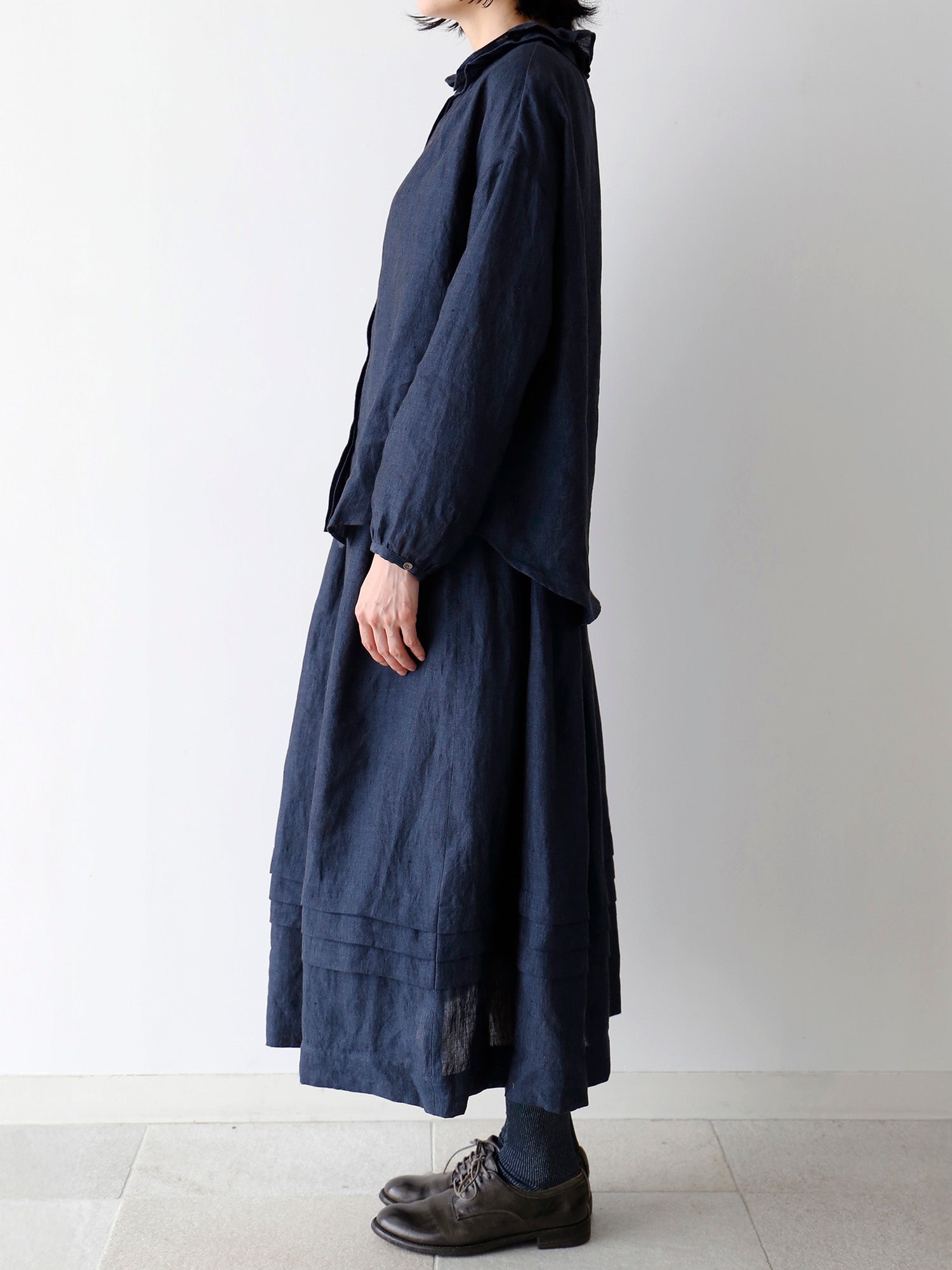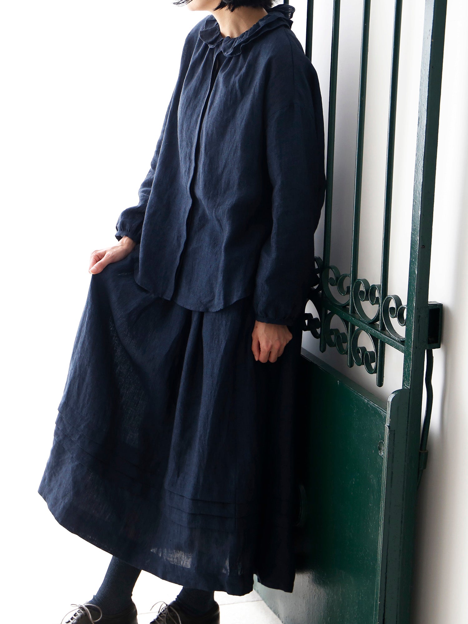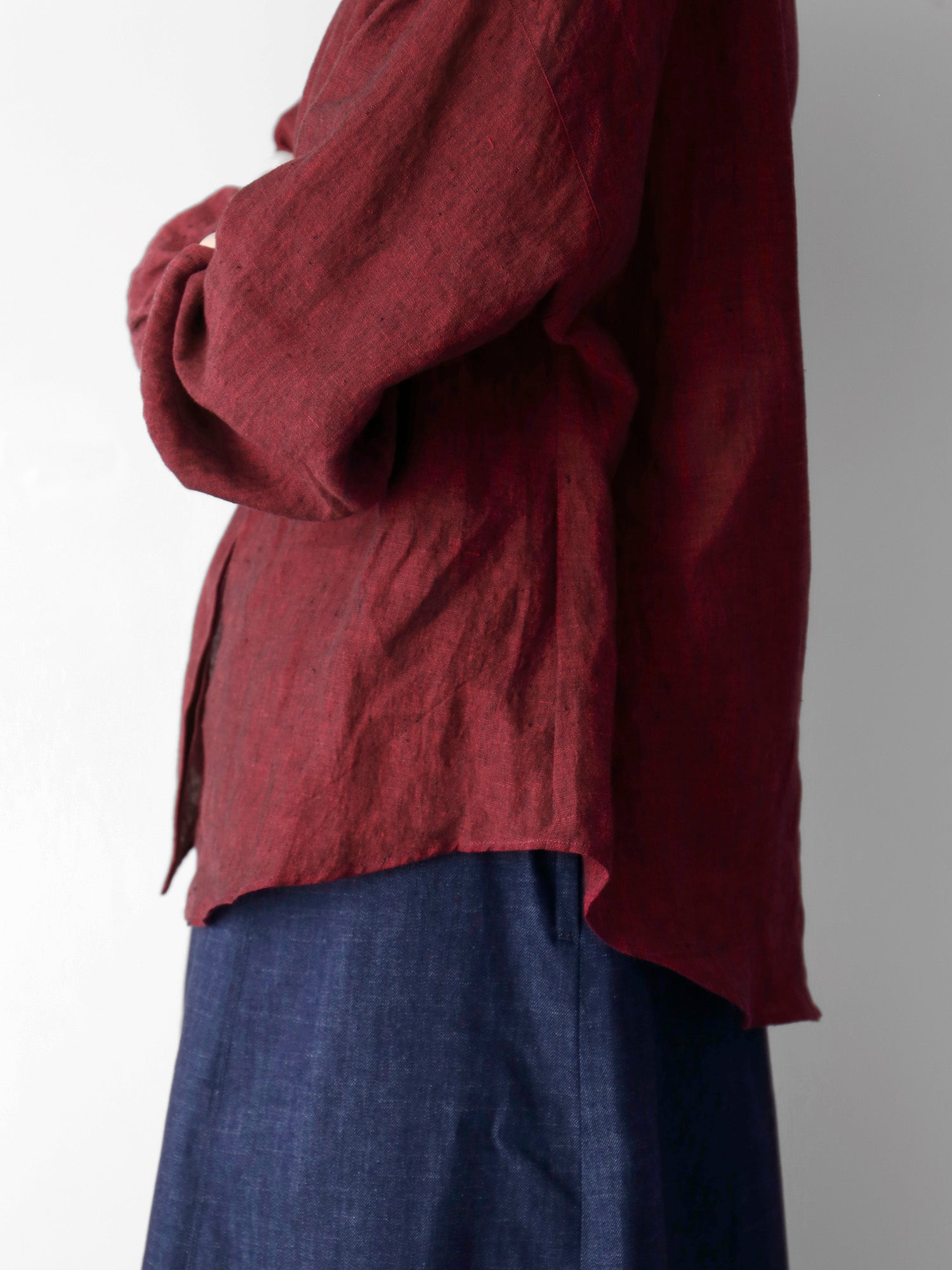 経糸に黒、緯糸に色糸を用いた奥行きのある尾州のシャンブレーリネン生地を使用しています。リネン特有の自然な光沢が美しく、軽やかでありながら透け感が少なく、安心して着られる生地です。
