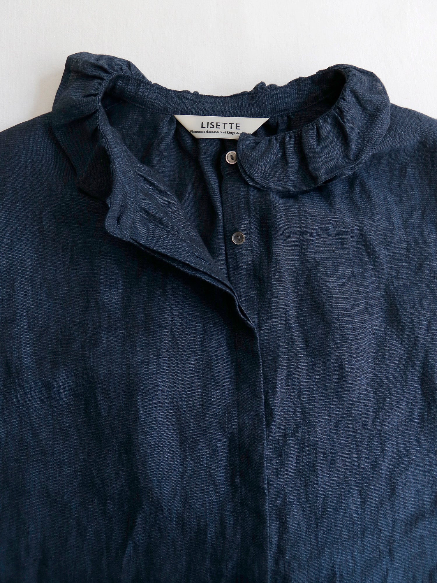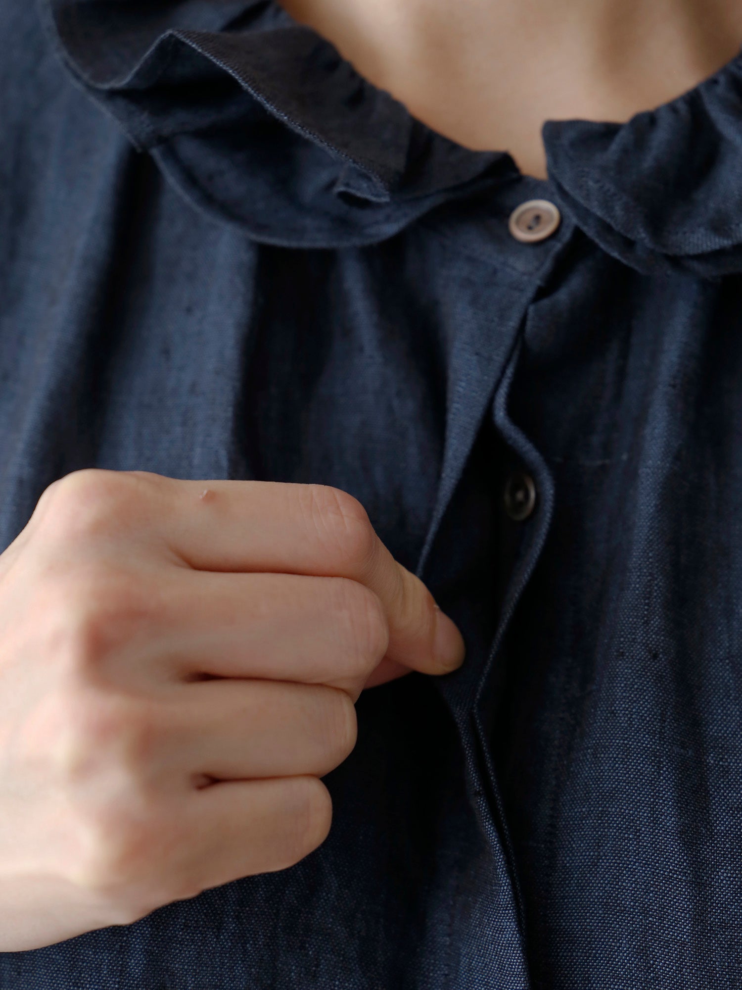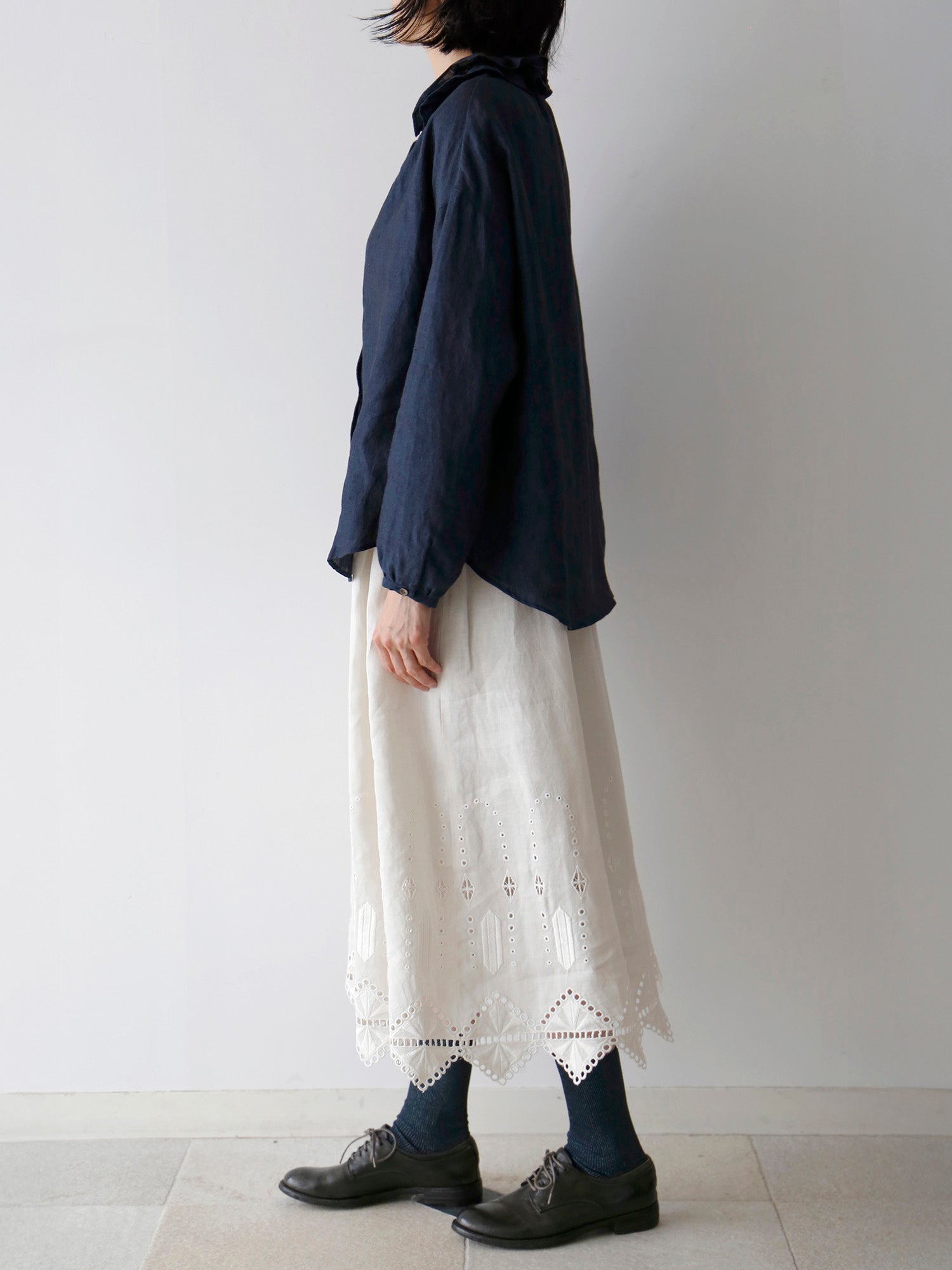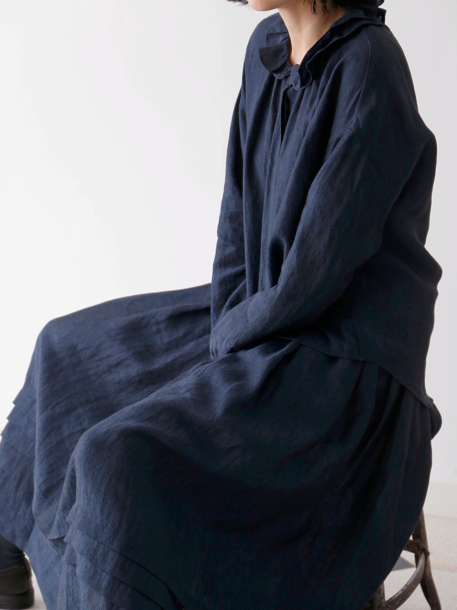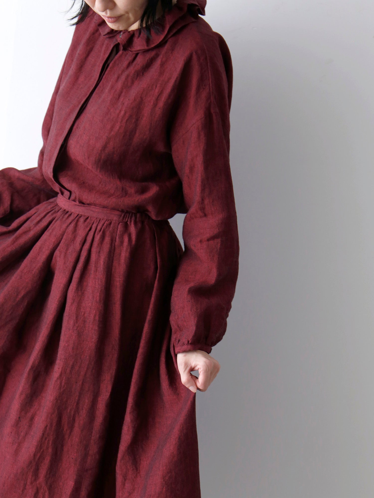 経糸に黒、緯糸に色糸を用いた奥行きのある尾州のシャンブレーリネン生地を使用しています。リネン特有の自然な光沢が美しく、軽やかでありながら透け感が少なく、安心して着られる生地です。