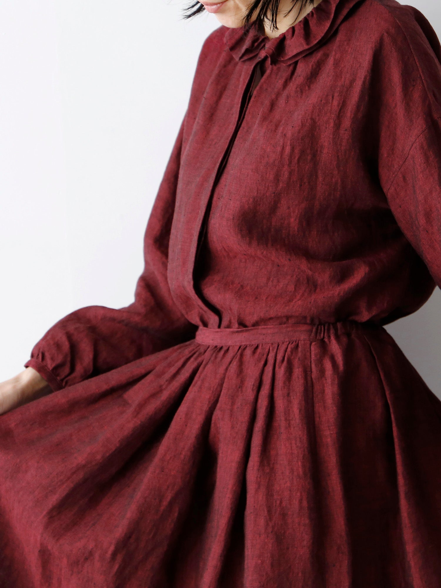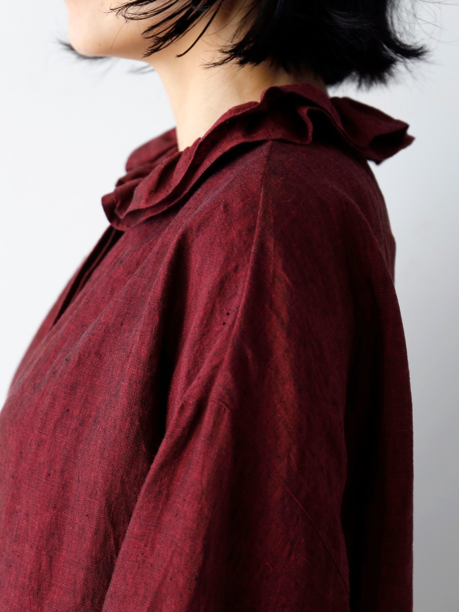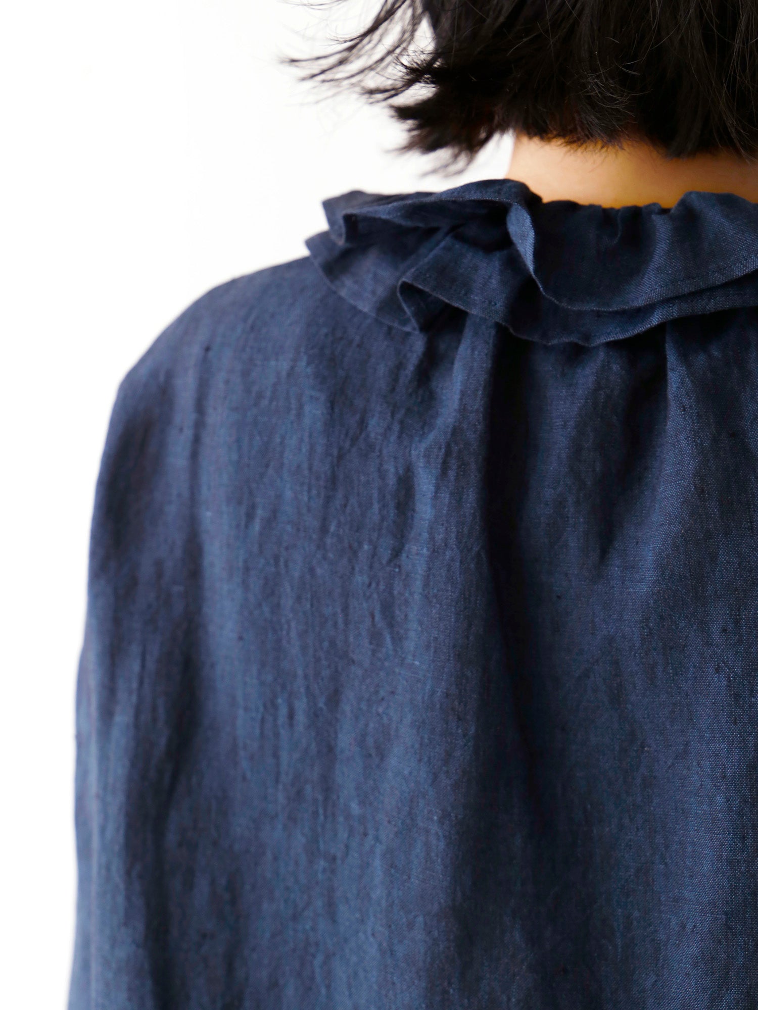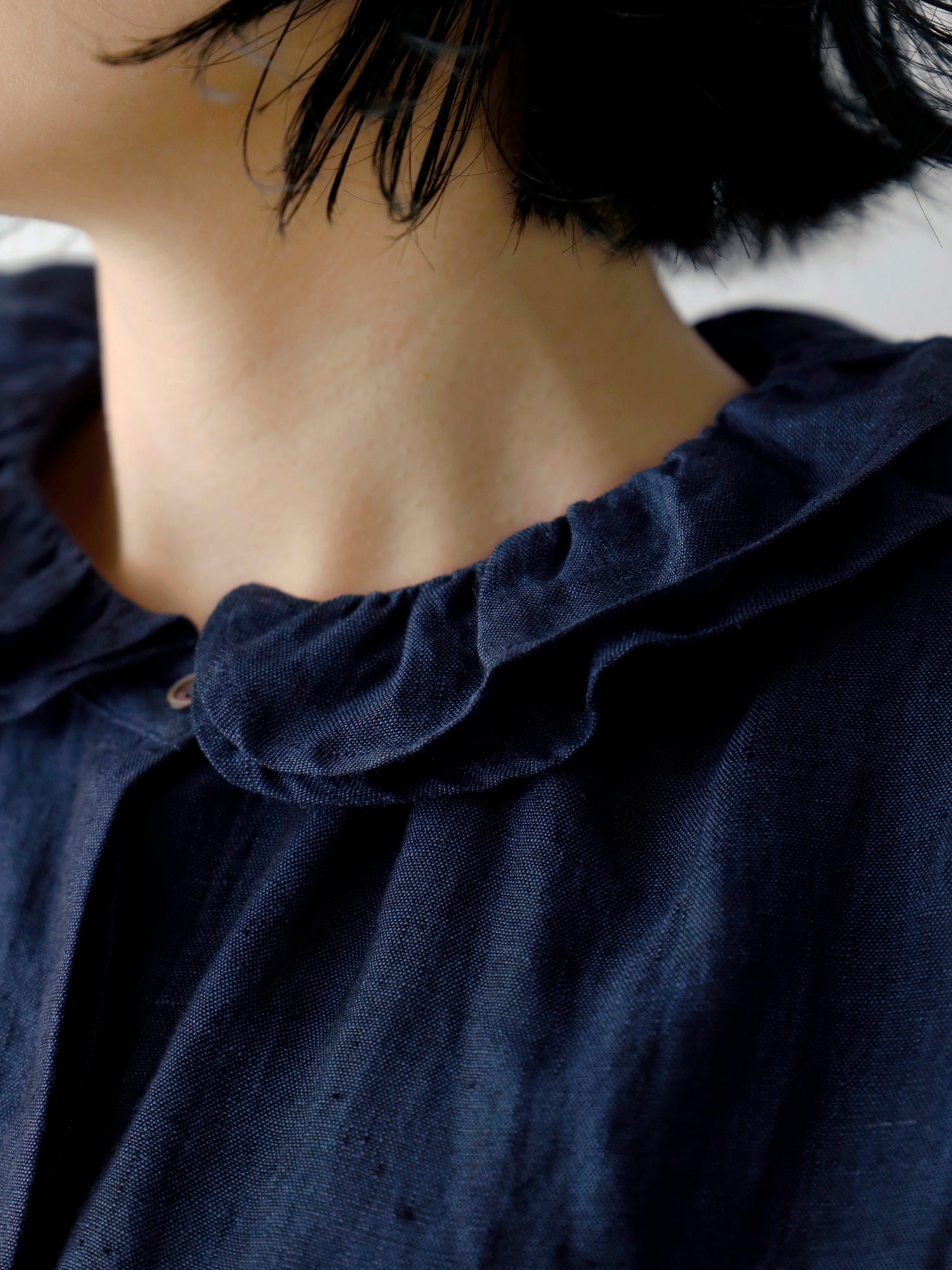 ギャザーを寄せた二重の衿。重なりによって動きと立体感が生まれ、顔周りを華やかに見せるだけでなく、どんな角度から見ても美しいシルエットを作り出します。