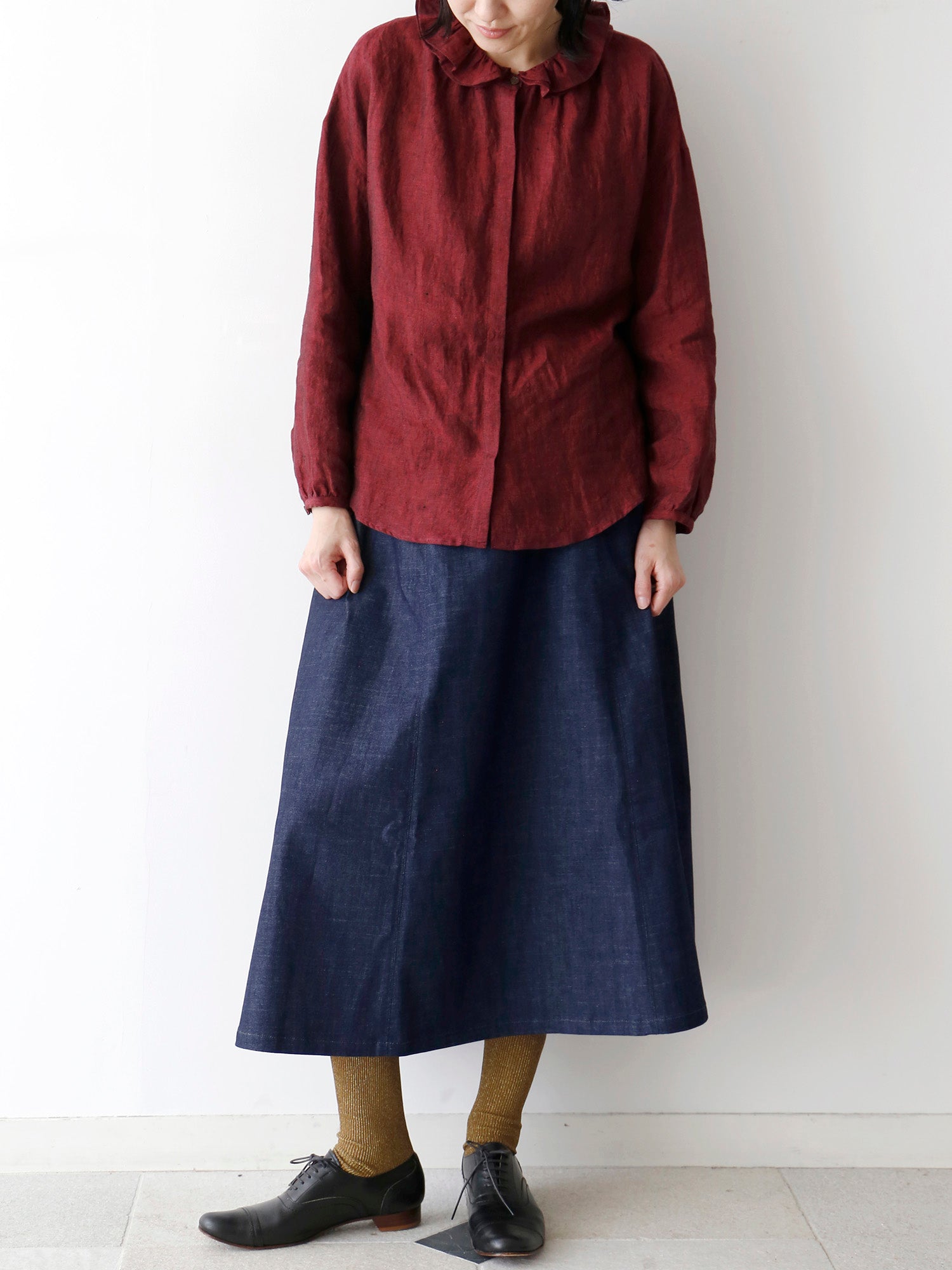 深みのあるシャンブレーリネンで仕立てた、一枚で着映えするブラウス《レイチェル》。秋の始まりに寄り添うリネンの装いをご紹介します。