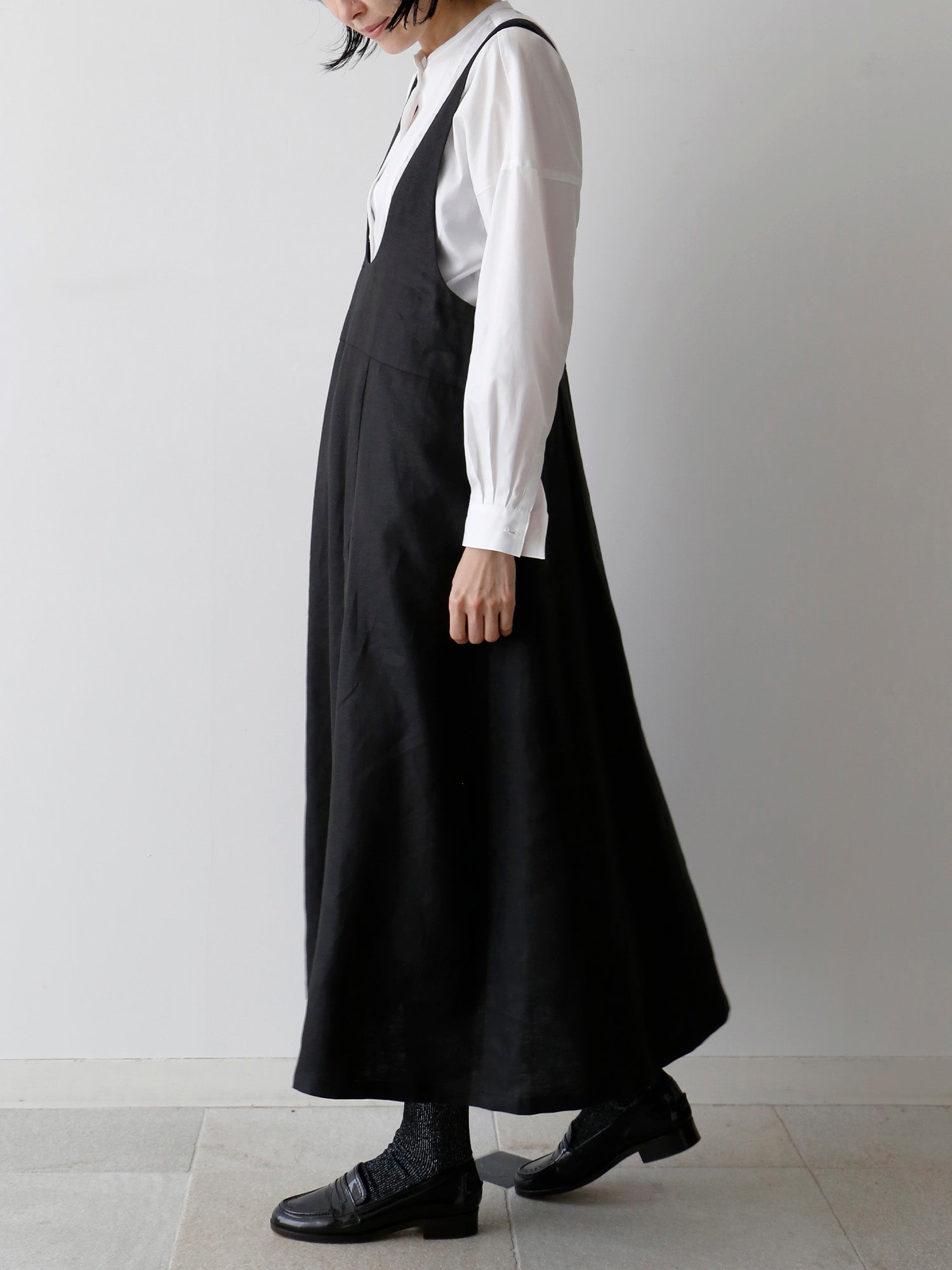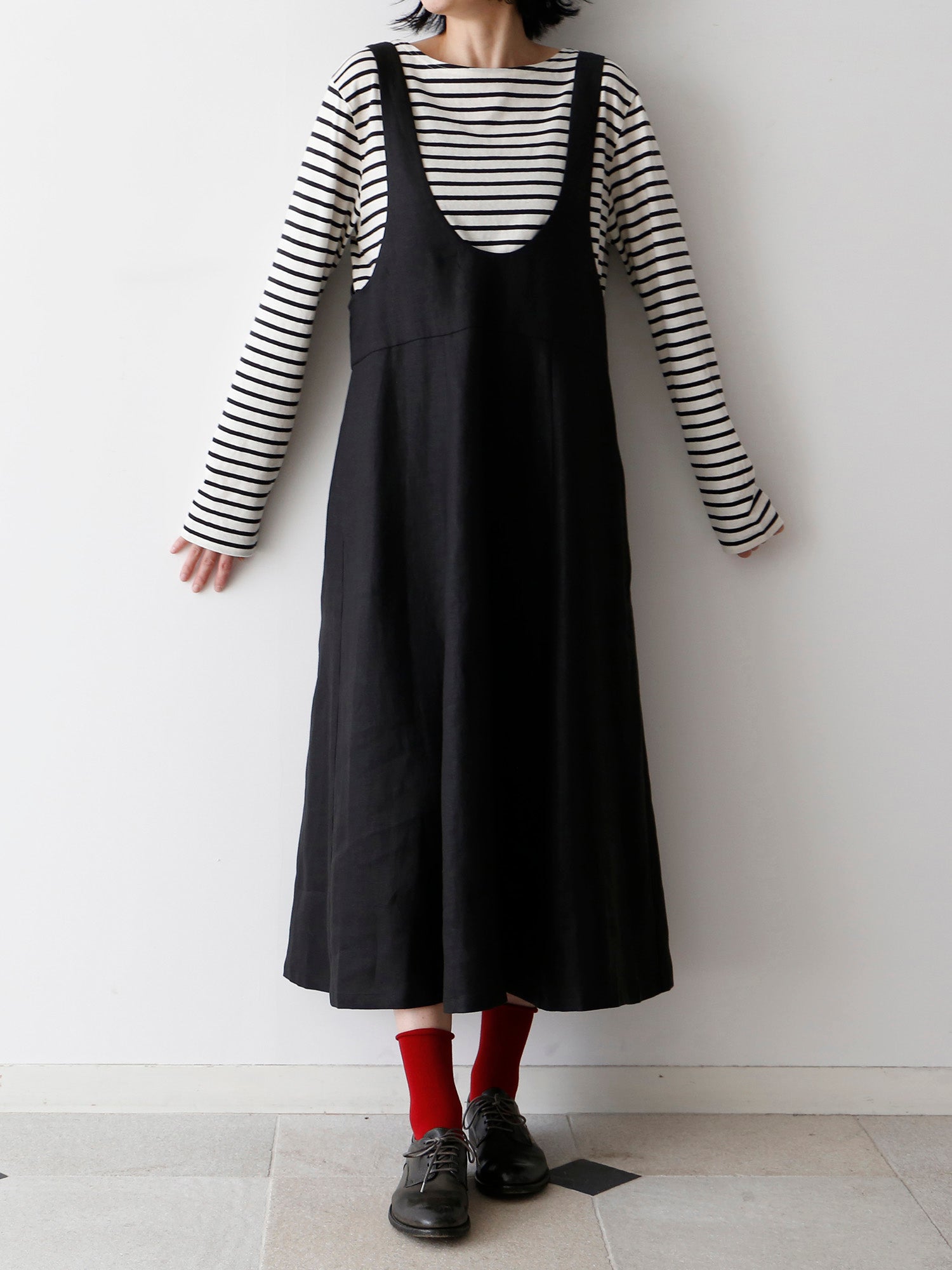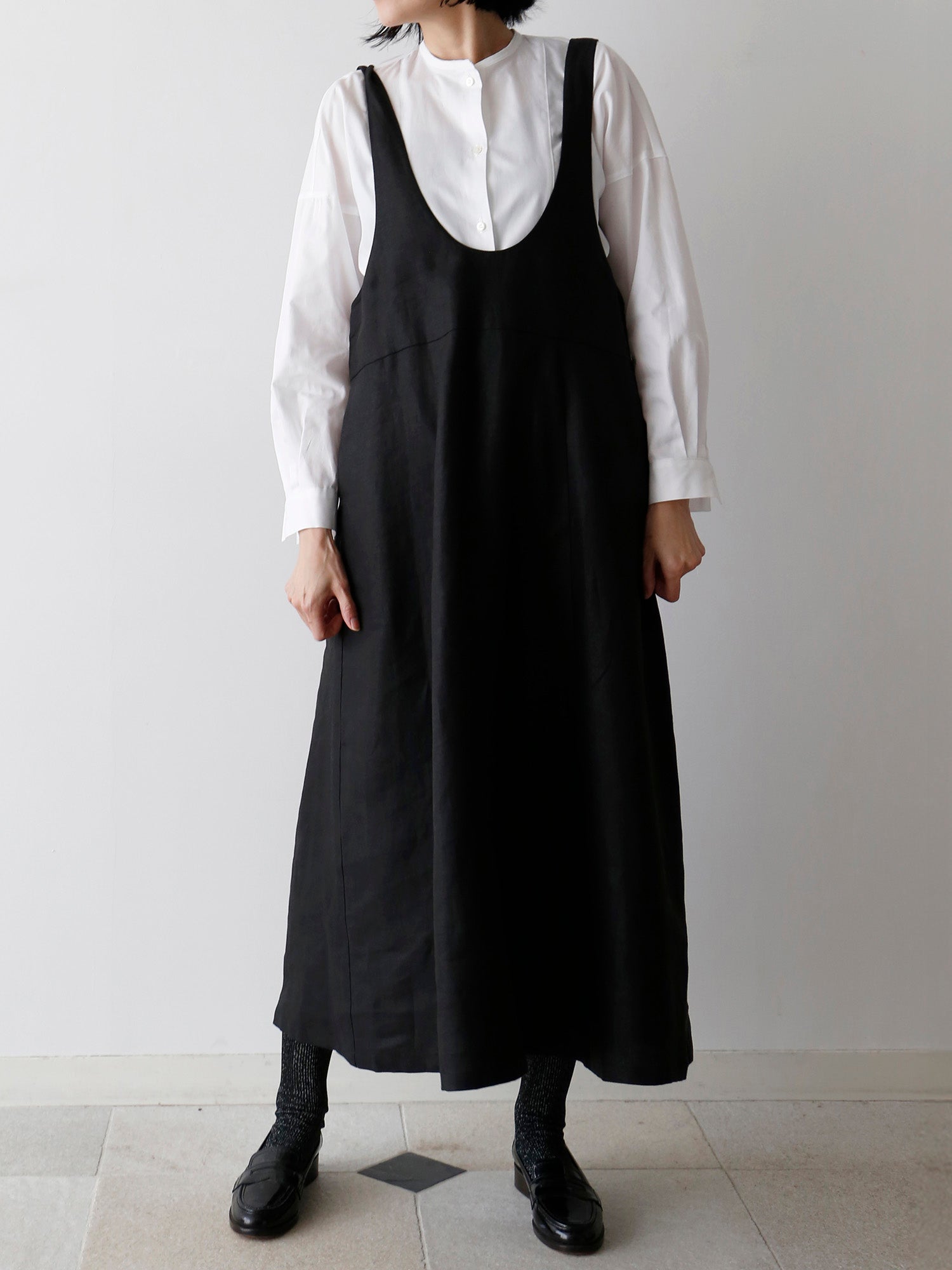 イタリア製の上質なリネンツイルで仕立てた、フレアージャンパースカート。深く、緩やかなカーブを描く胸元は、中に合わせる一枚でがらりと表情を変えるのも魅力です。