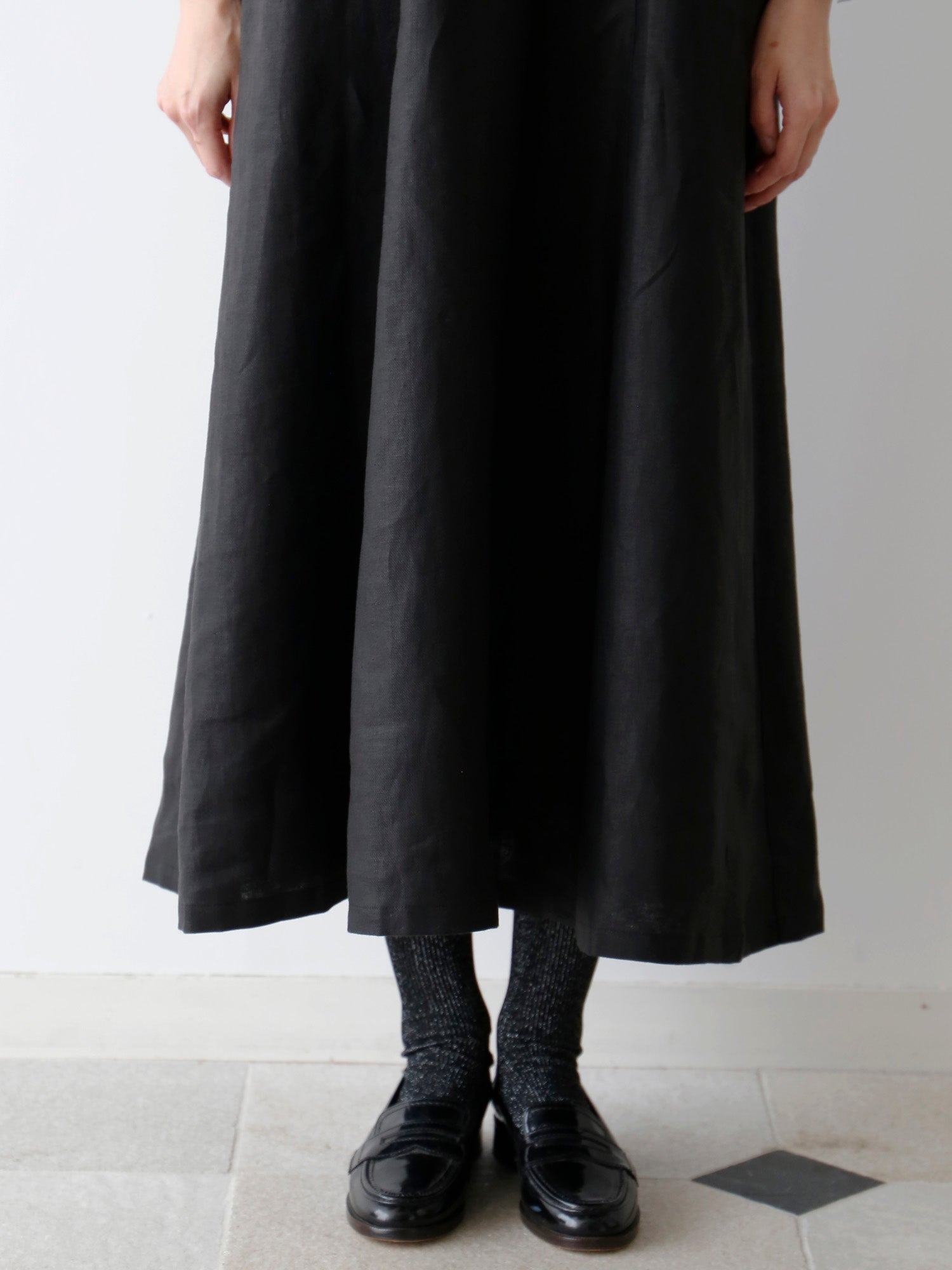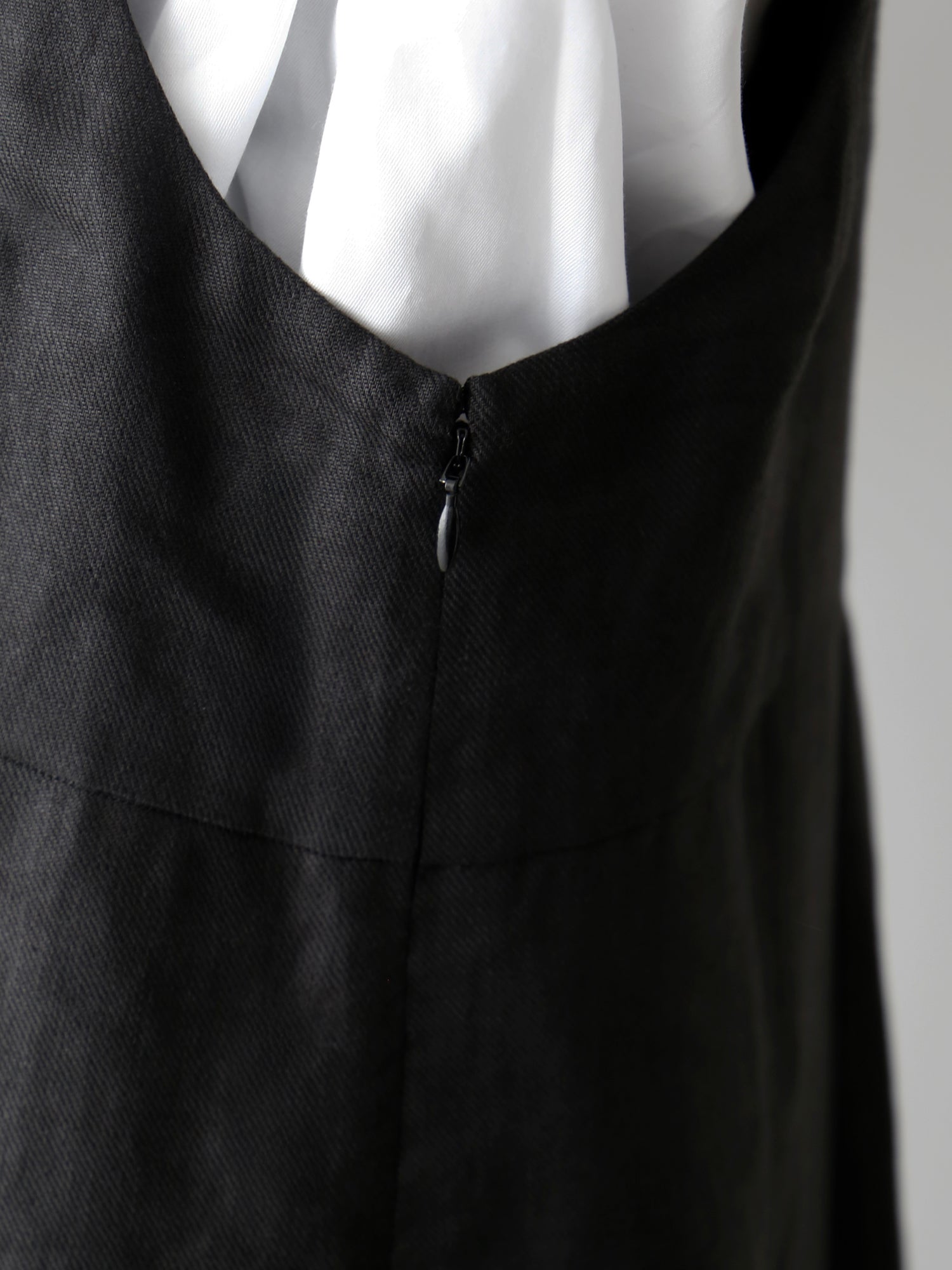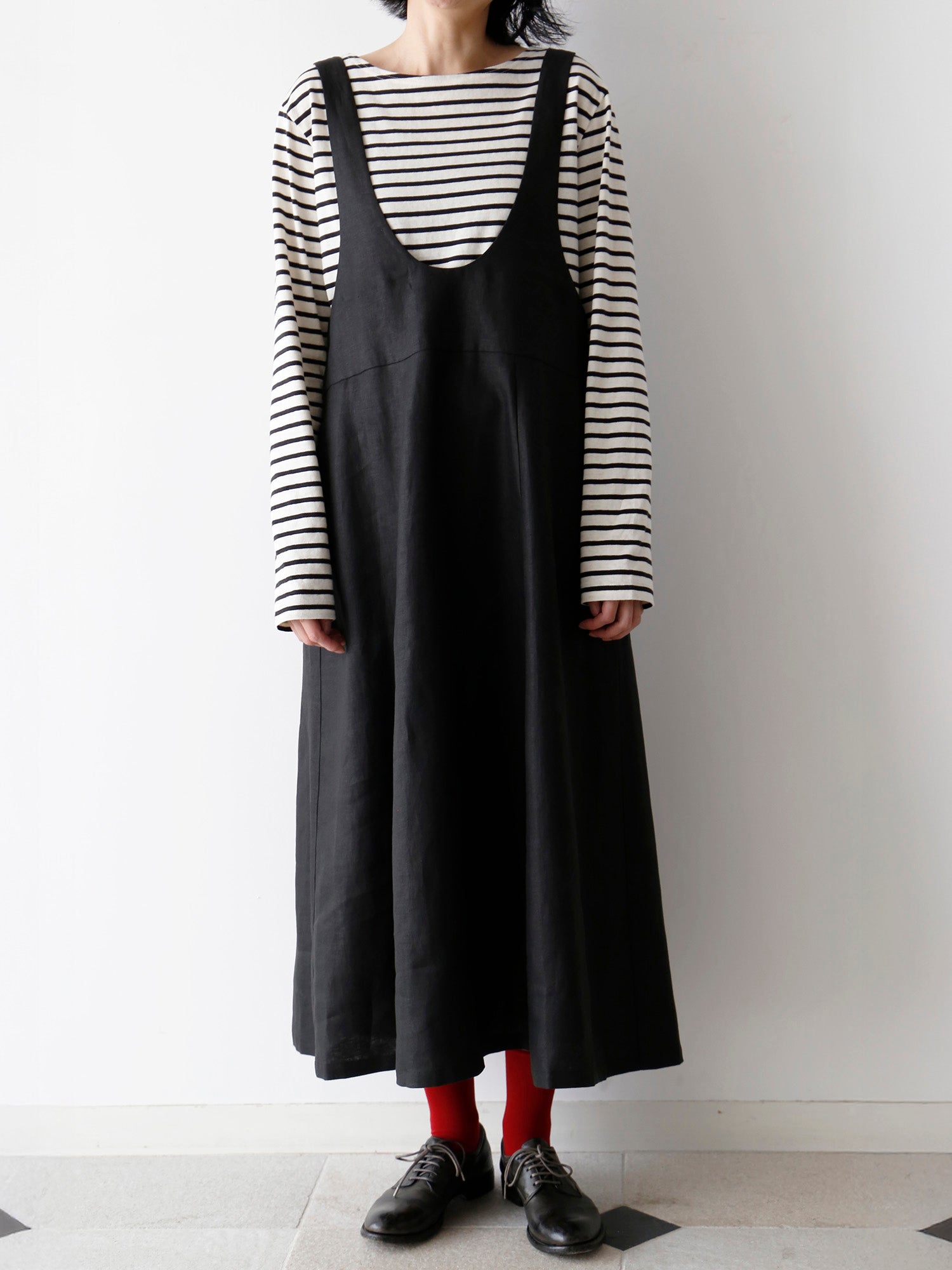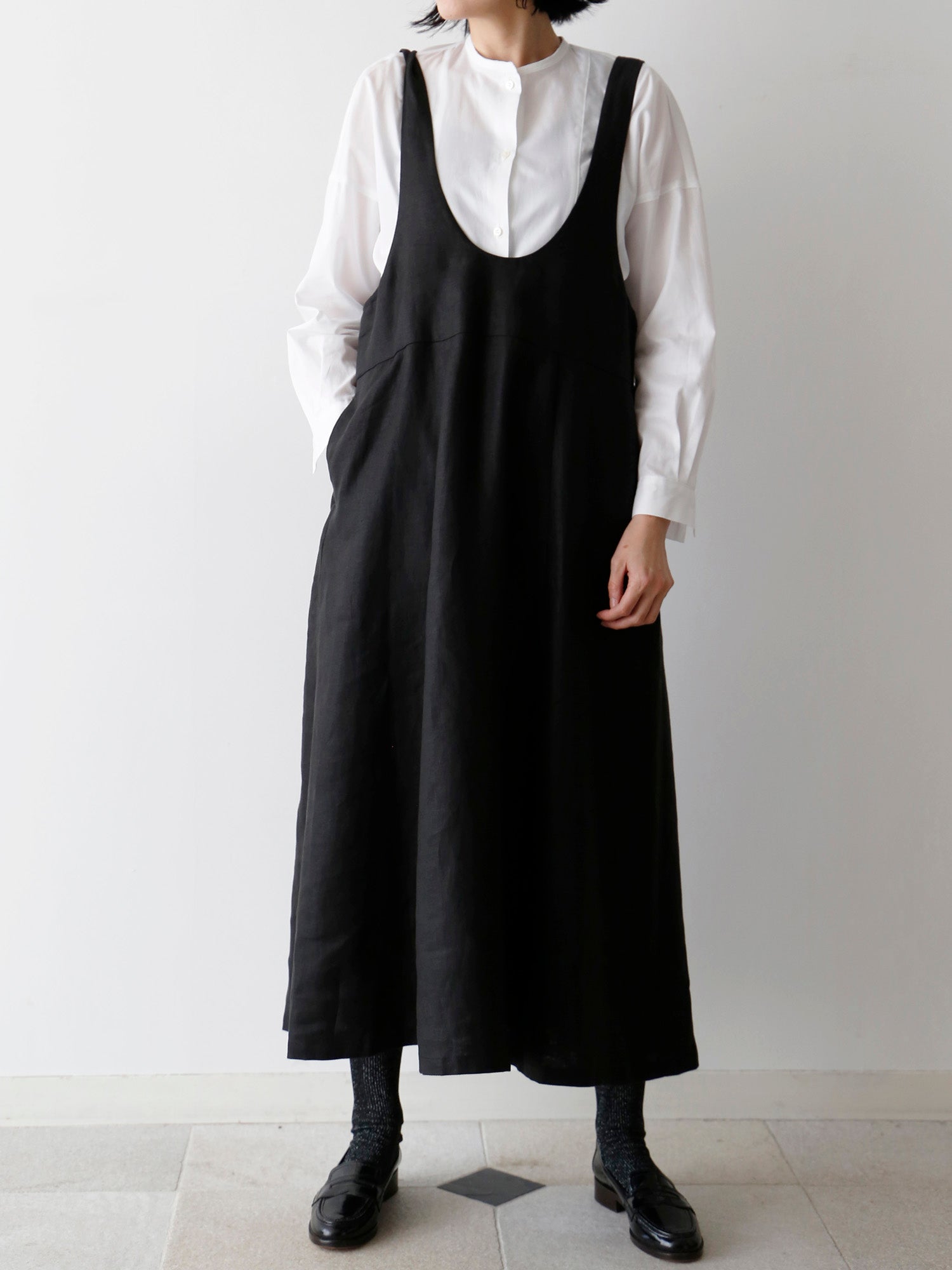 イタリア製の上質なリネンツイルで仕立てた、フレアージャンパースカート。深く、緩やかなカーブを描く胸元は、中に合わせる一枚でがらりと表情を変えるのも魅力です。