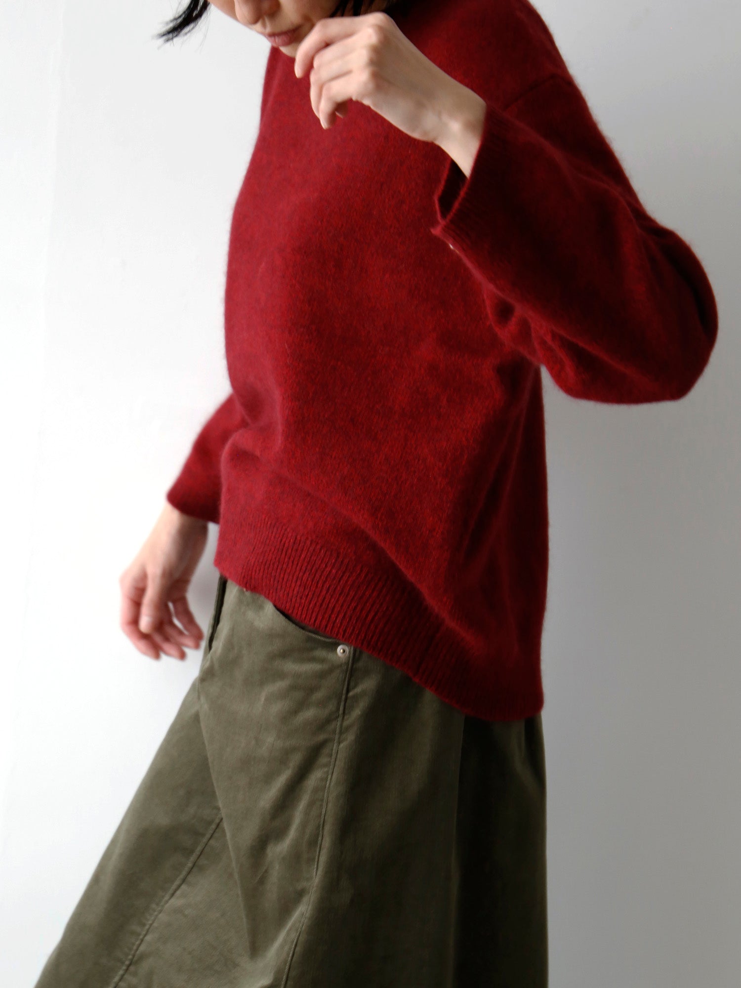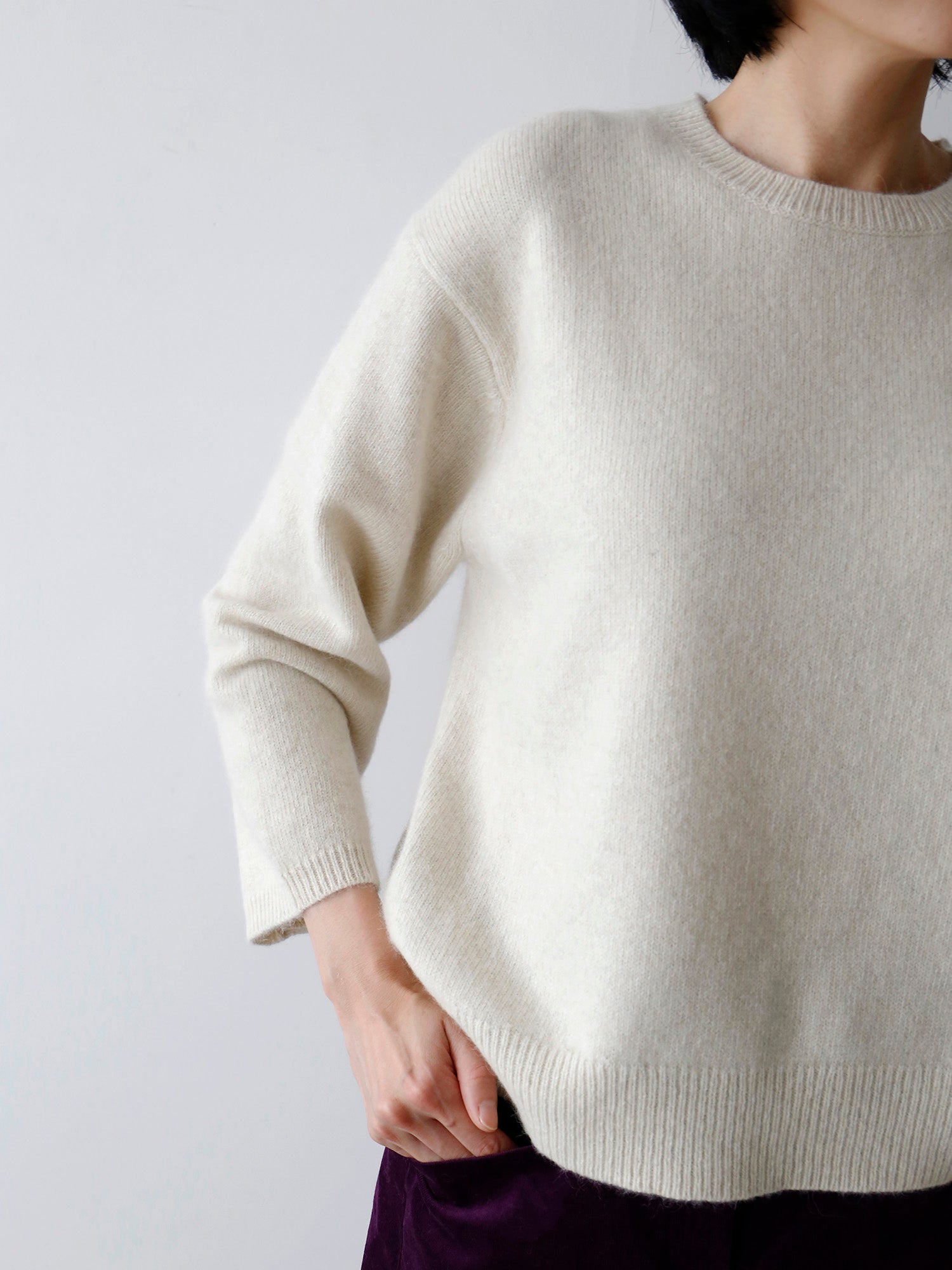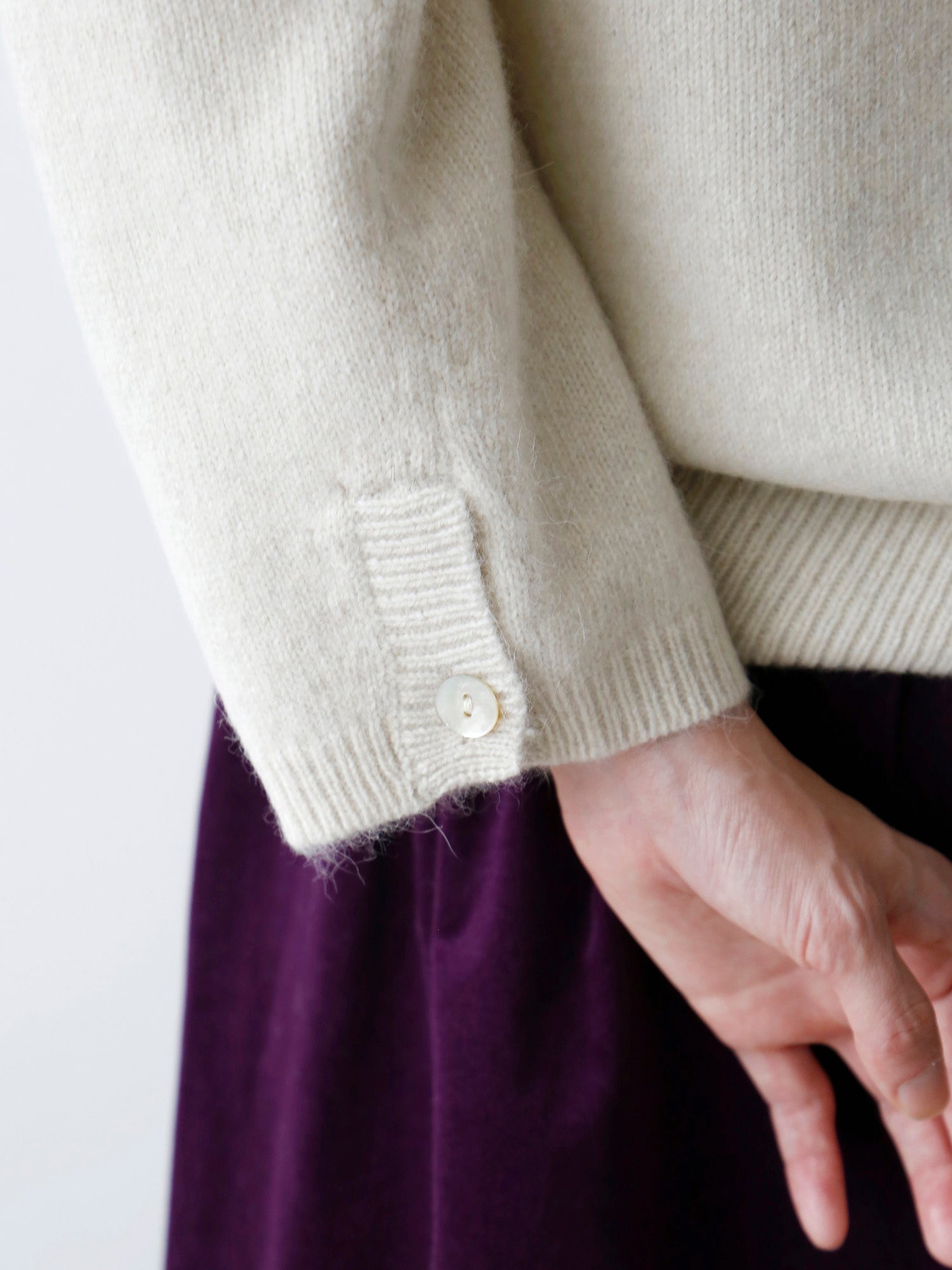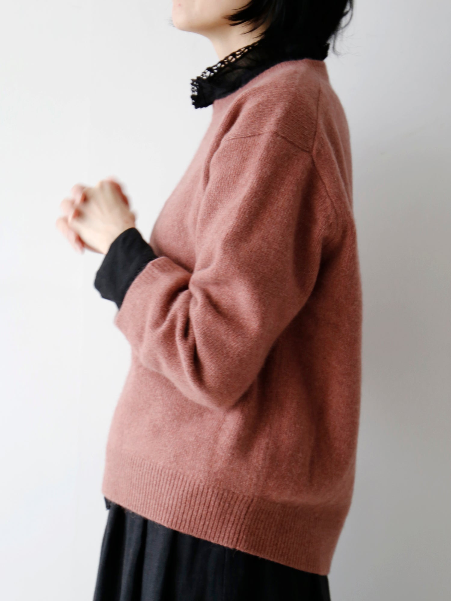 ウールとベビーアルパカをベースに、軽さと膨らみを加えるナイロン、そして毛足のあるラクーンをブレンド。ふんわりとした空気を含んだ編地は、軽やかでありながら暖かく、秋冬の装いを心地よく包み込みます。