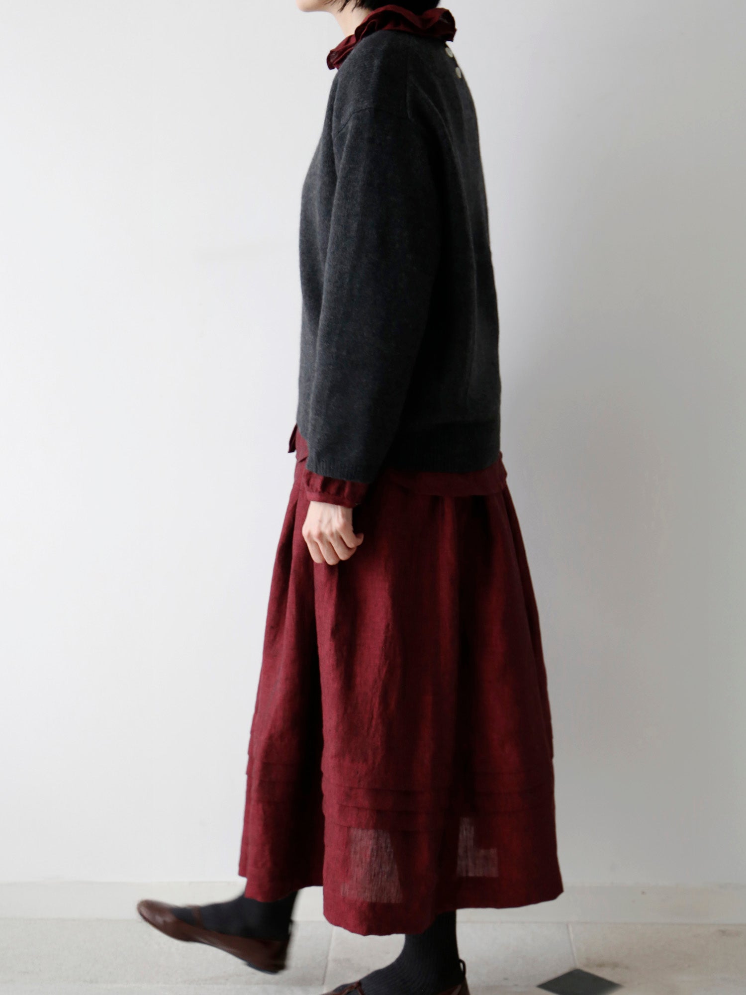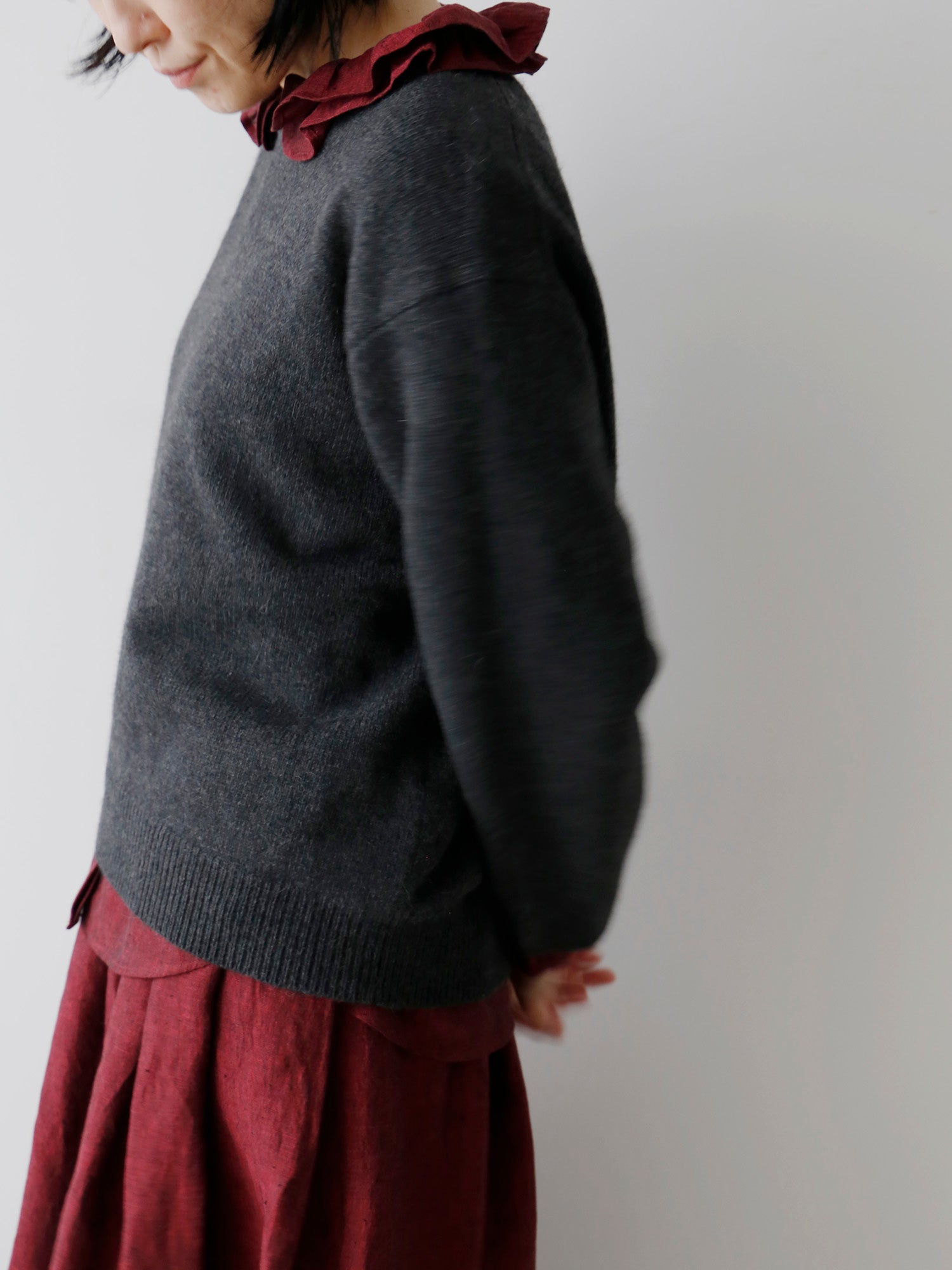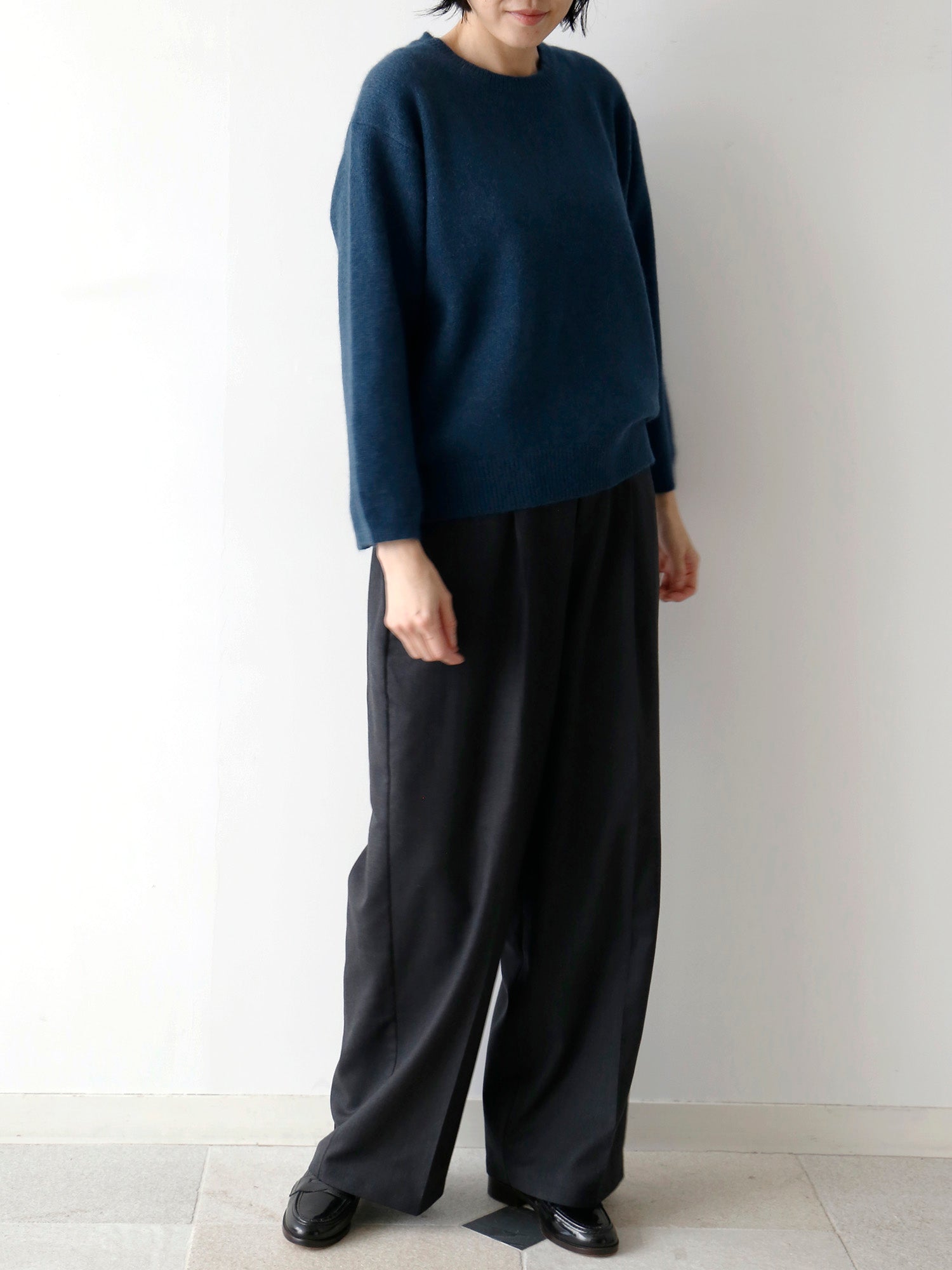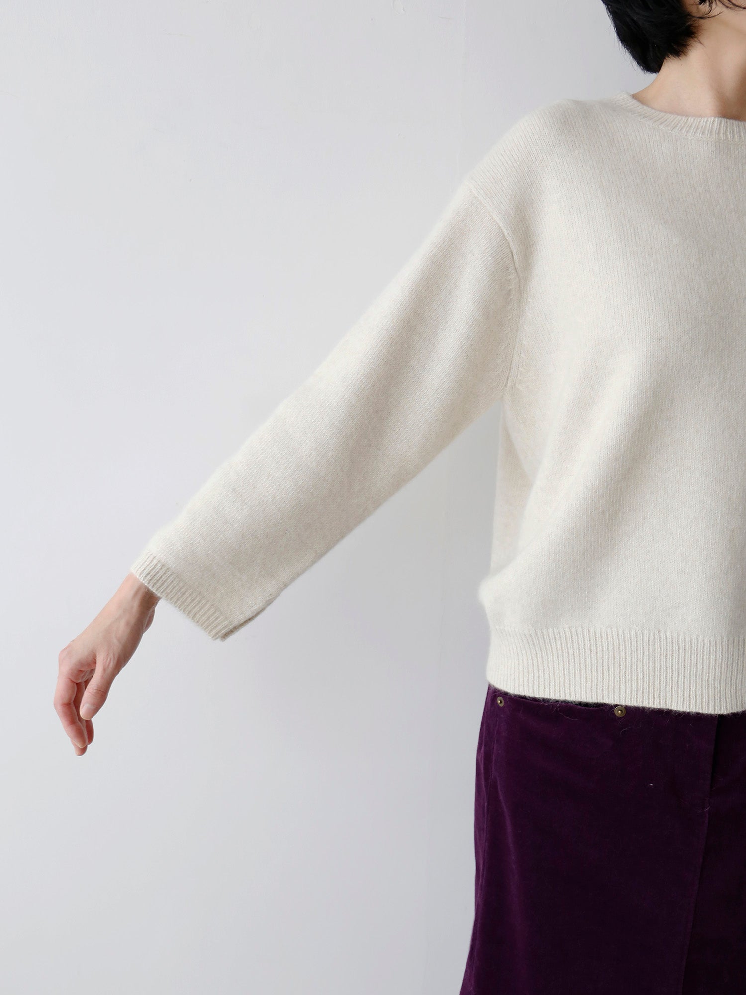 ウールとベビーアルパカをベースに、軽さと膨らみを加えるナイロン、そして毛足のあるラクーンをブレンド。ふんわりとした空気を含んだ編地は、軽やかでありながら暖かく、秋冬の装いを心地よく包み込みます。