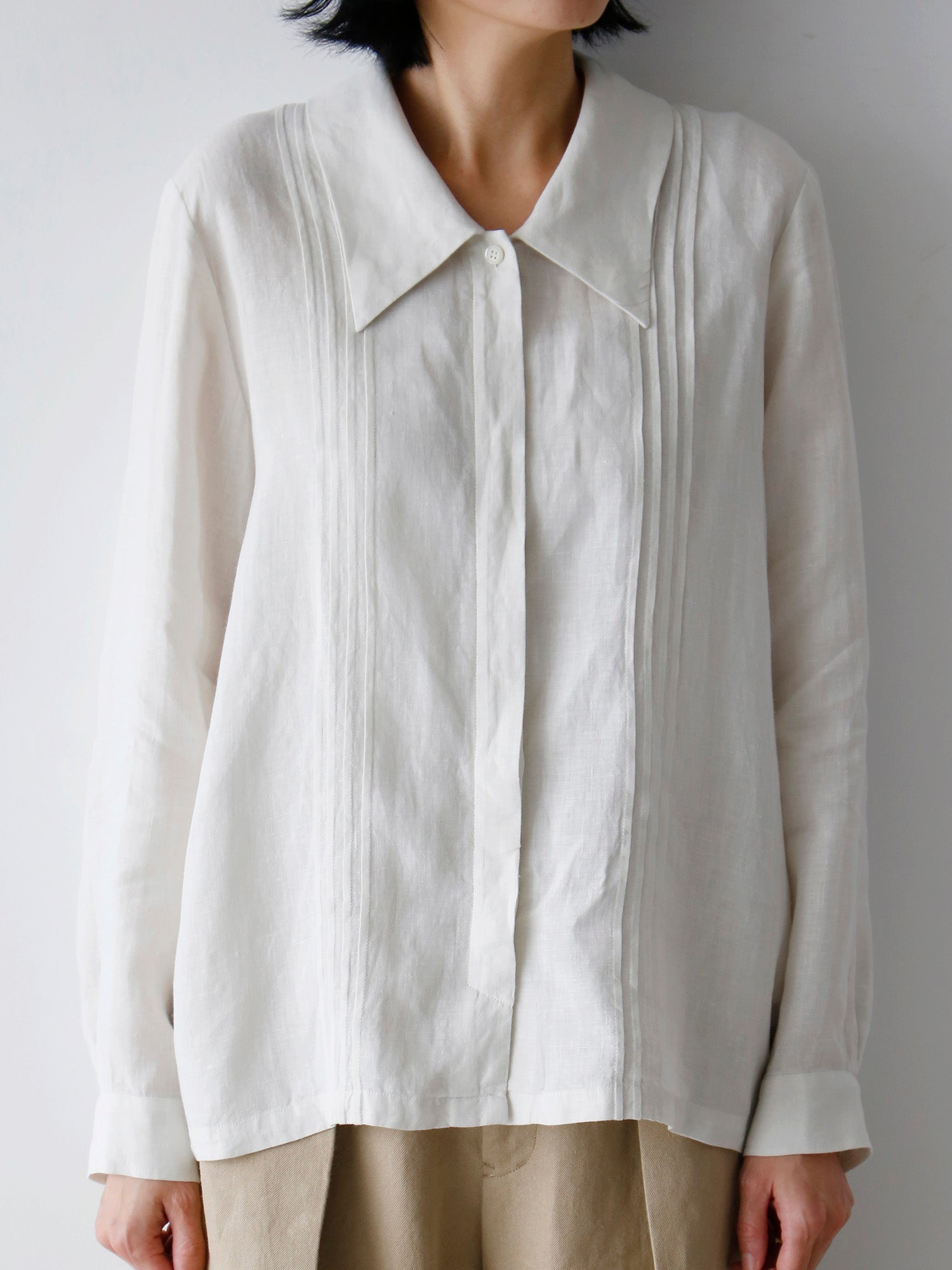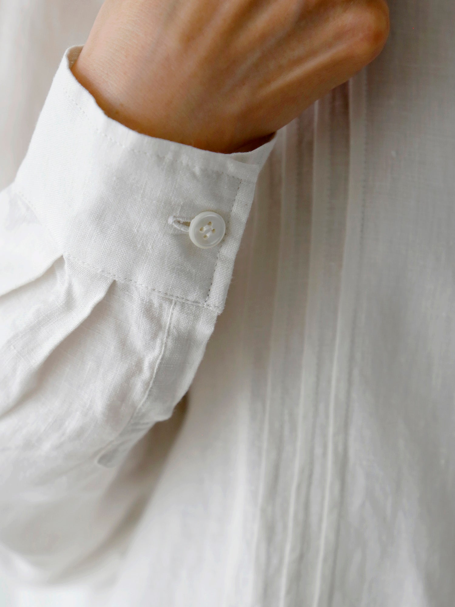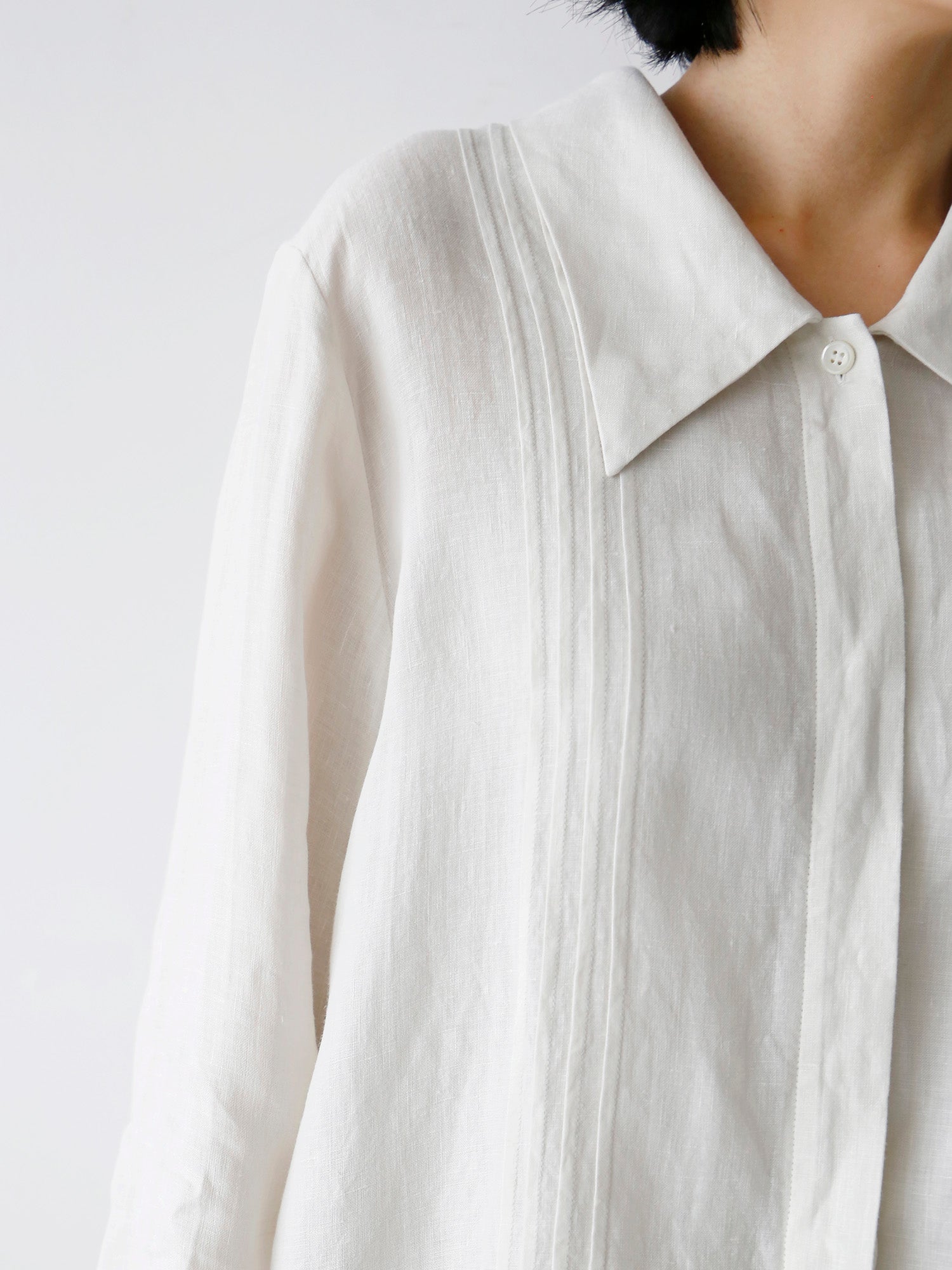 細かなピンタックがほどよい立体感を生み、縦のラインを強調してすっきりと見せてくれます。