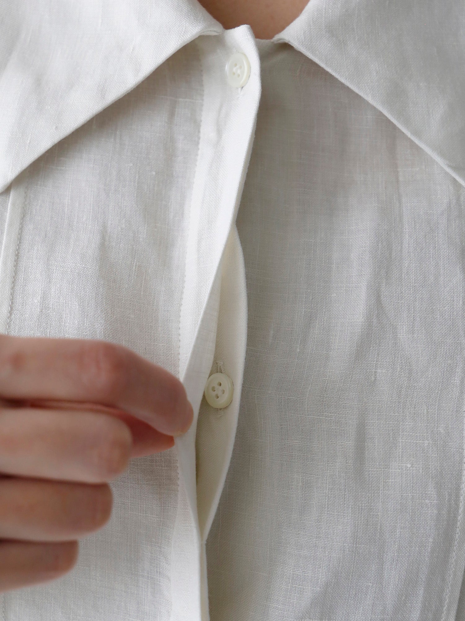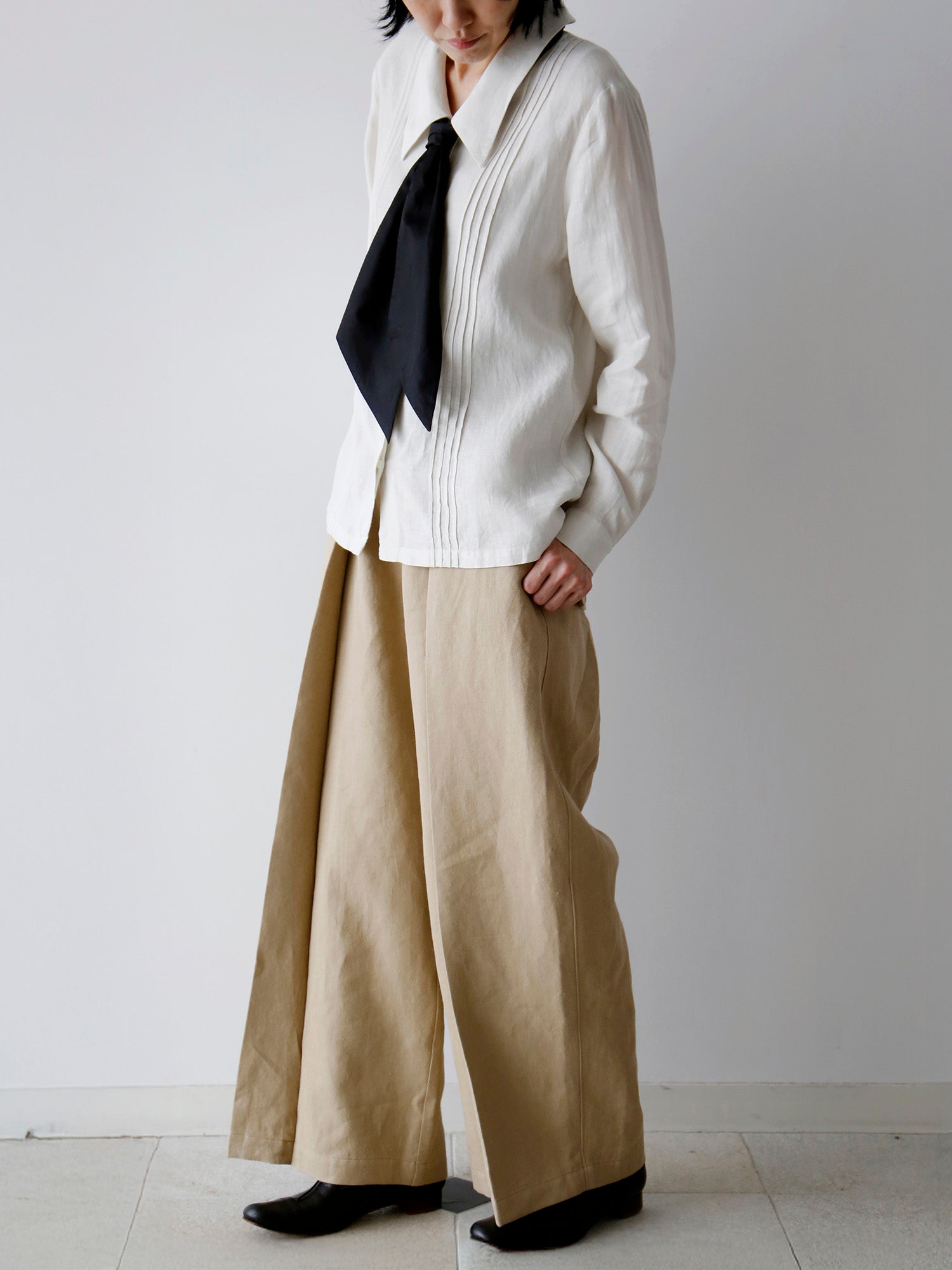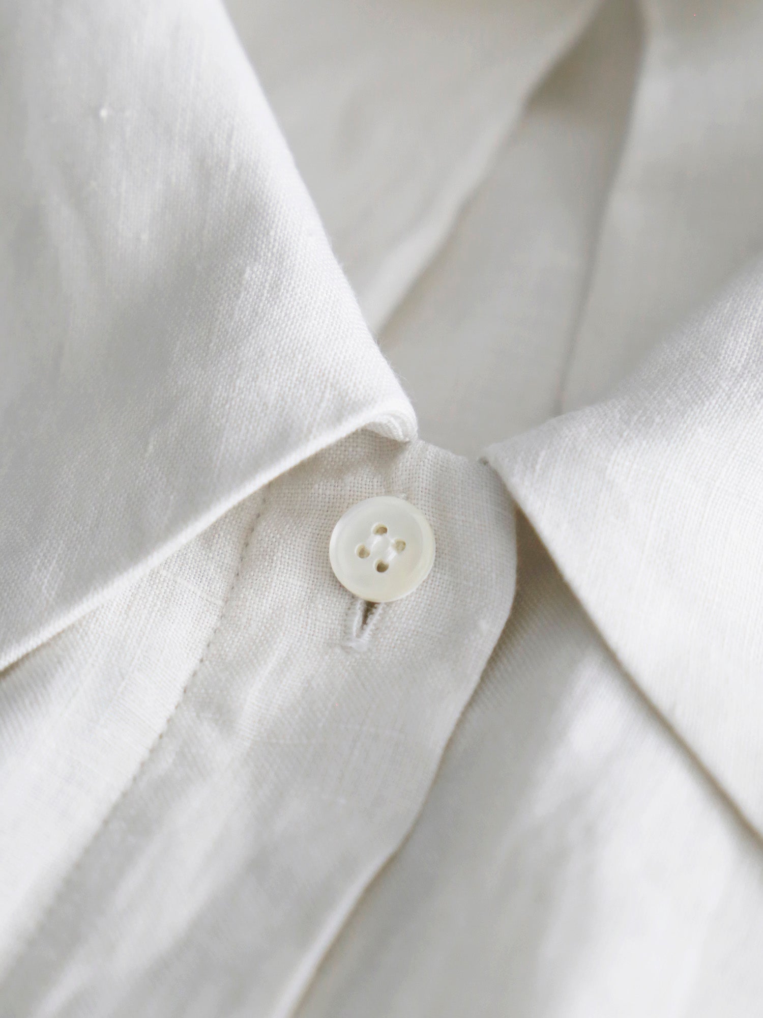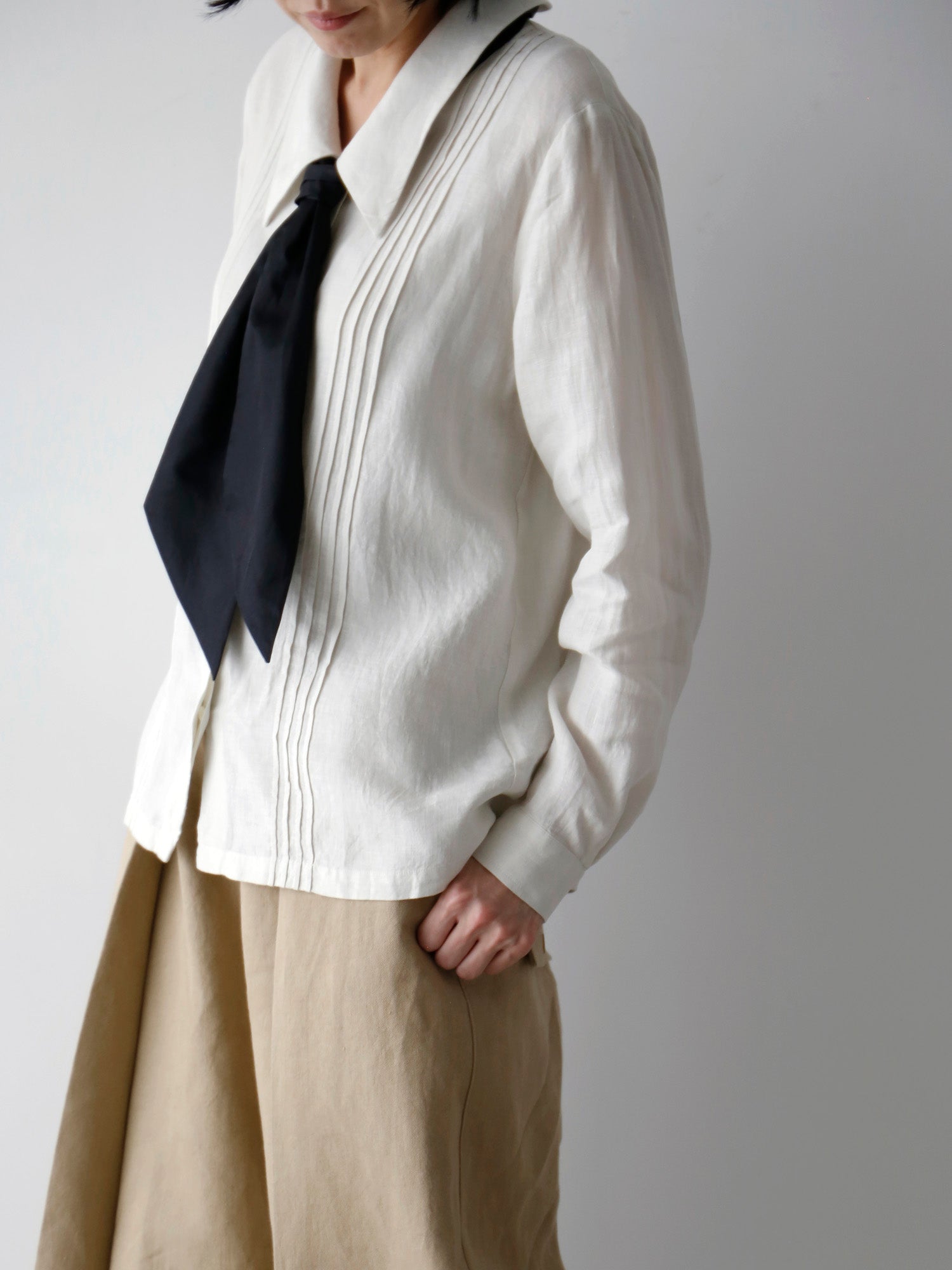取り外しのできるリボンタイ付きのリネンシャツ。