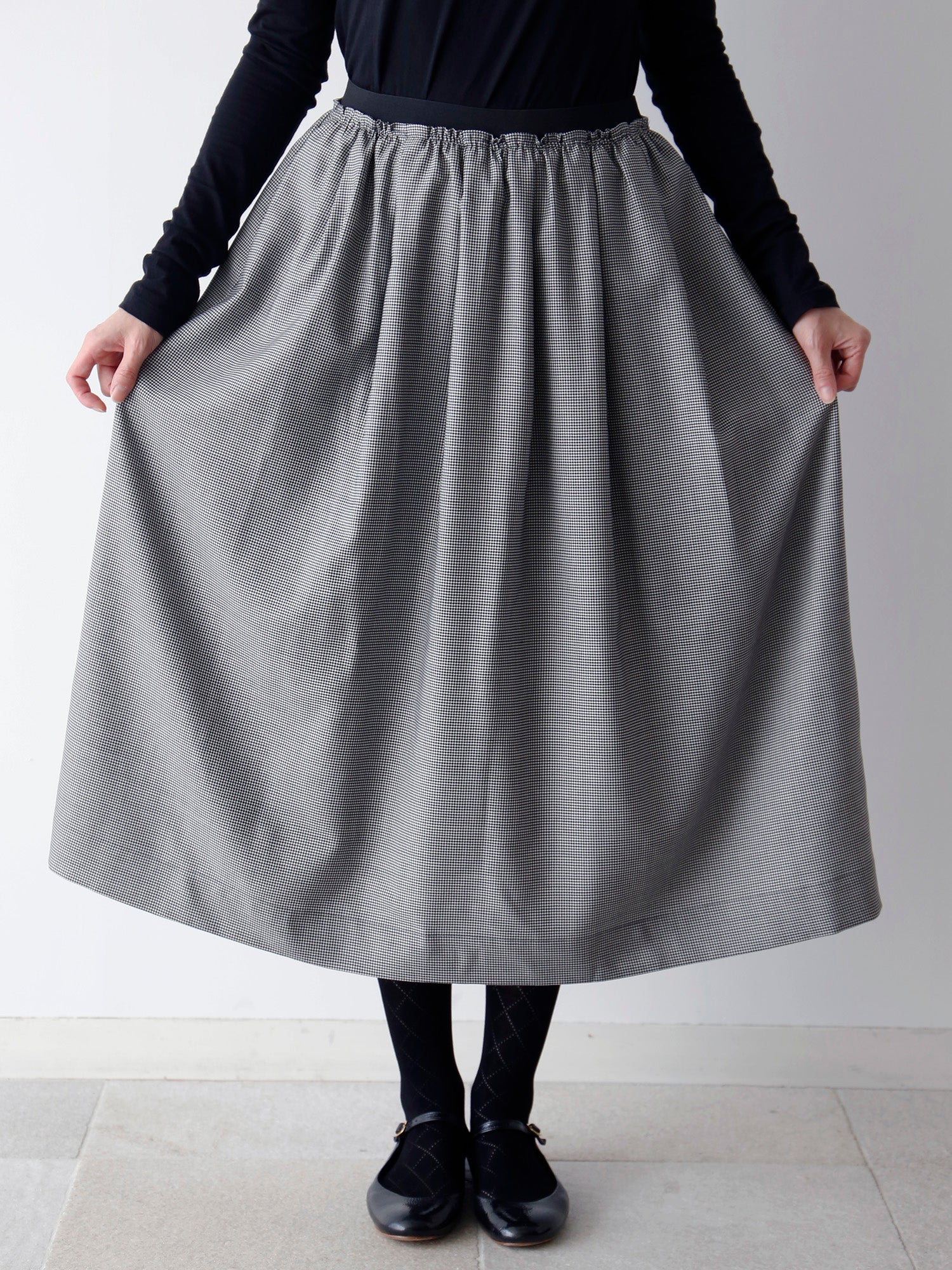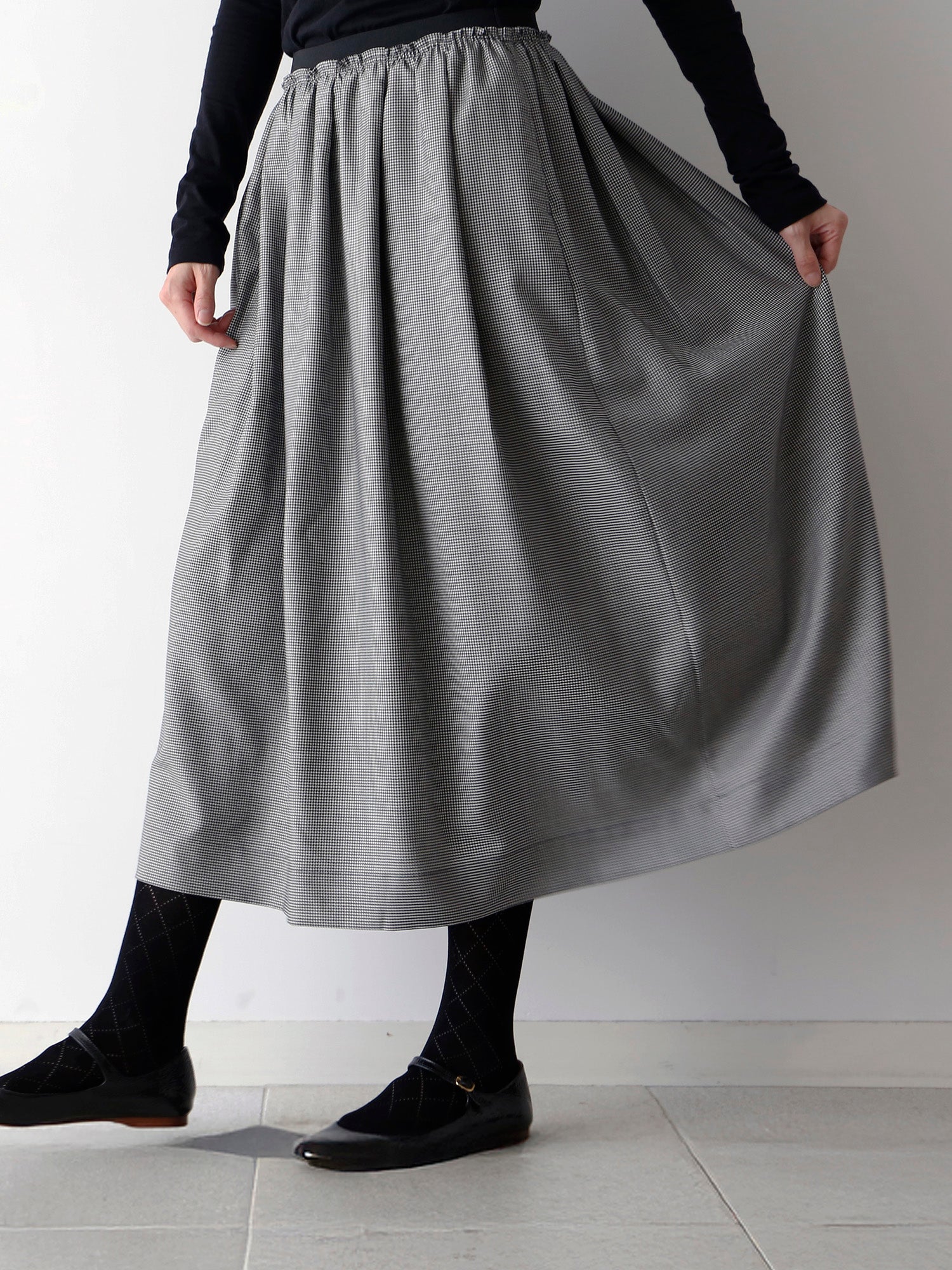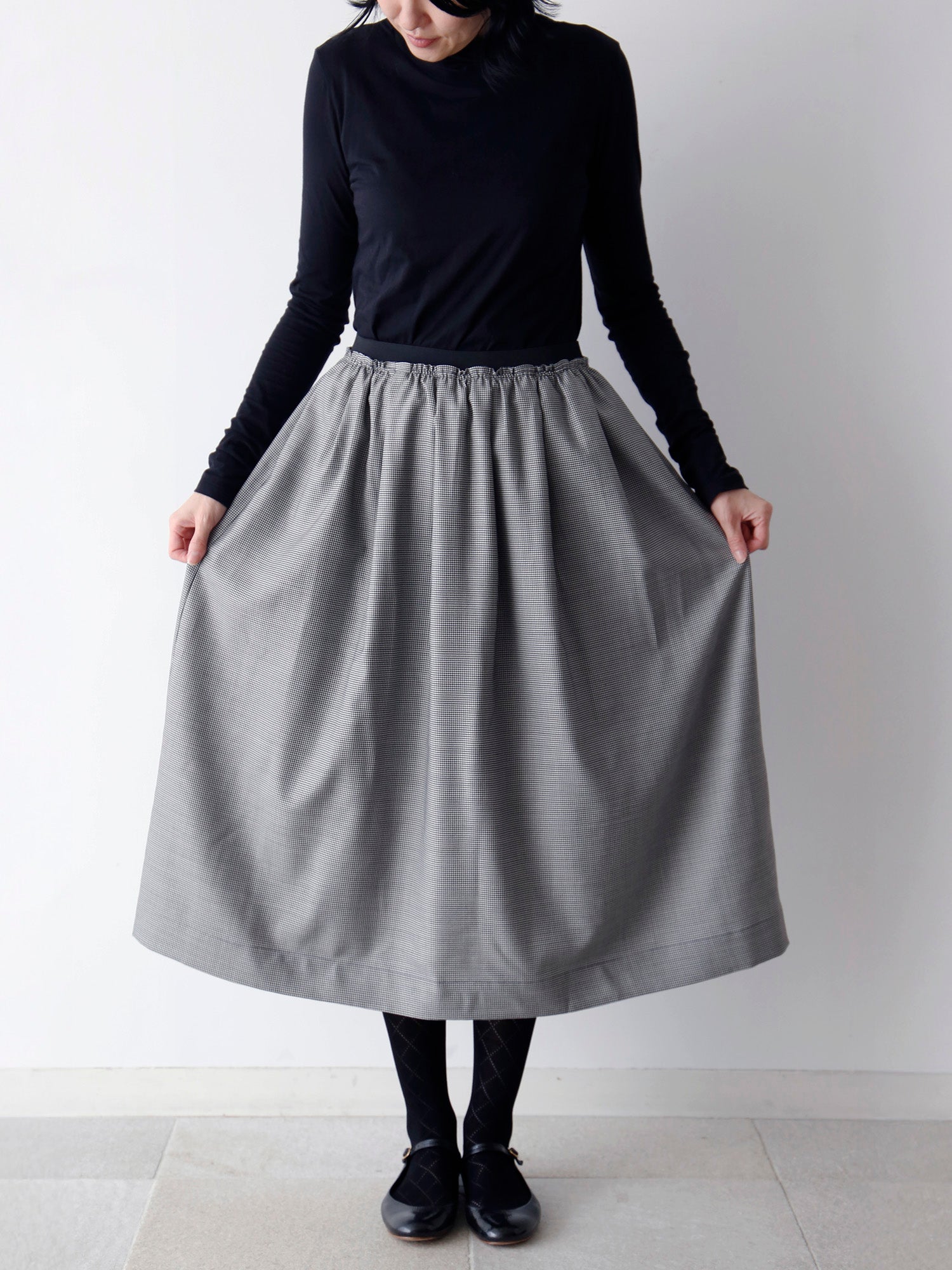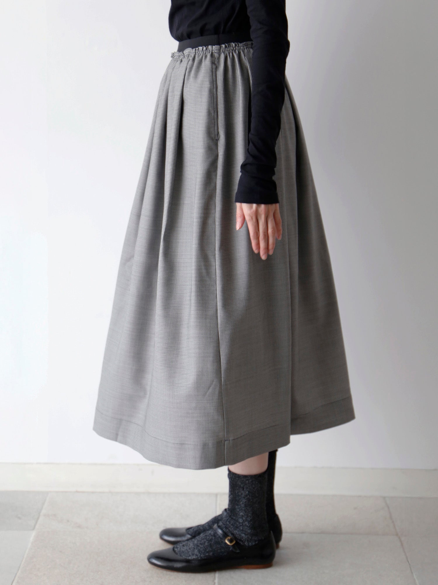 イタリア製ウールで仕立てた千鳥格子柄のスカート《エレノア》。細かな千鳥格子とタックギャザーが生み出す、やわらかなシルエットが魅力の一着です。