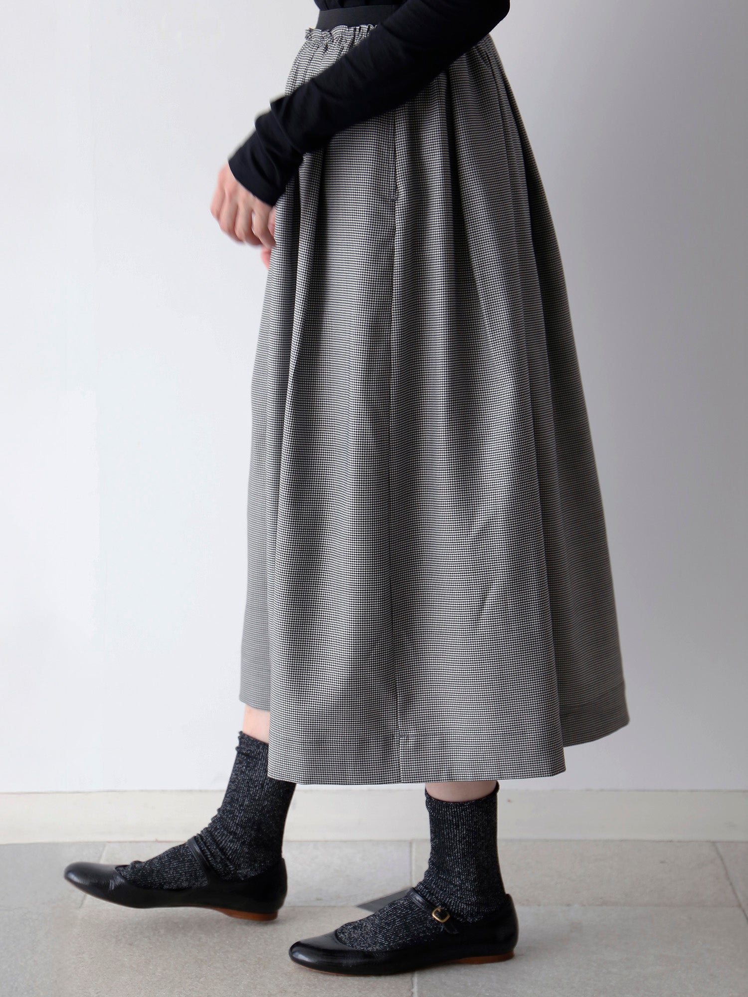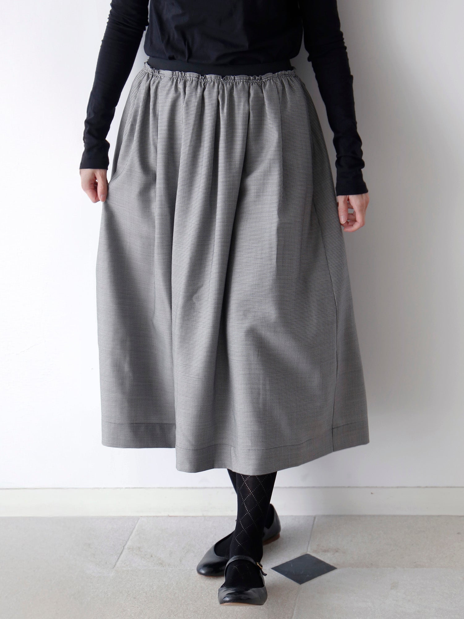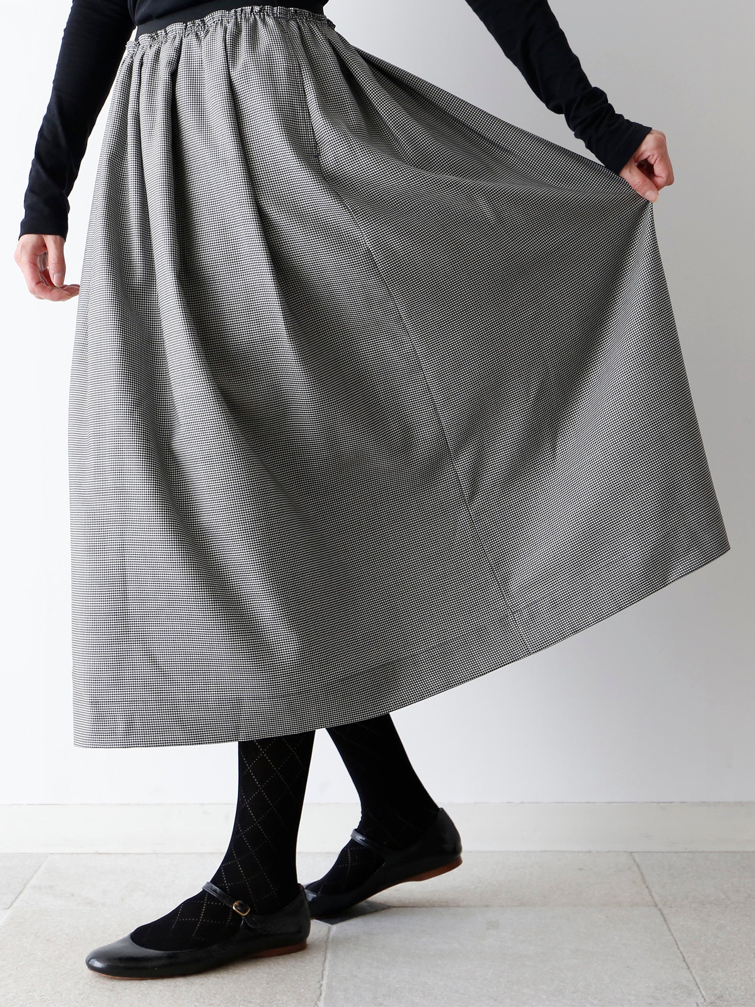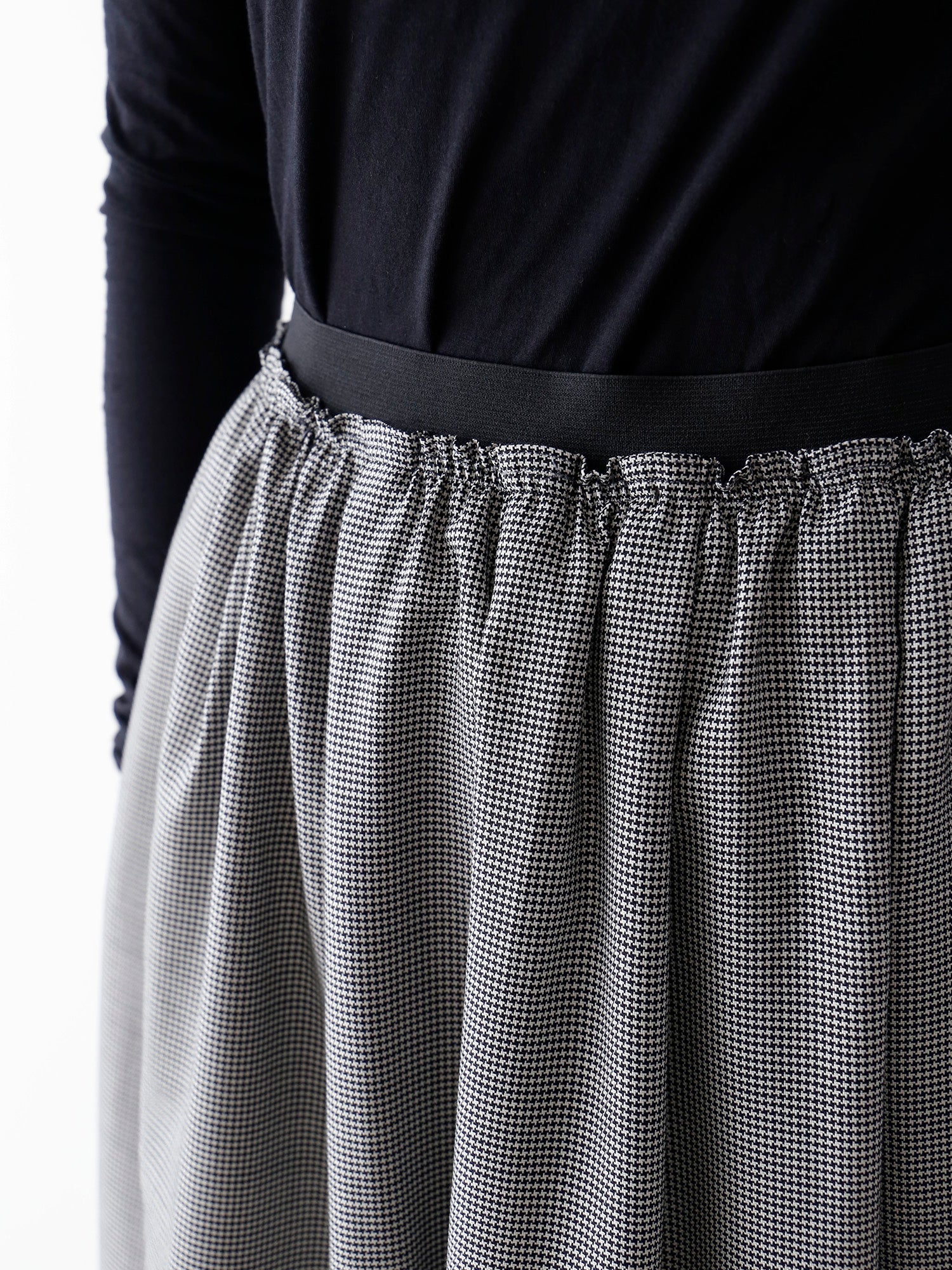 イタリア製ウールで仕立てた千鳥格子柄のスカート《エレノア》。細かな千鳥格子とタックギャザーが生み出す、やわらかなシルエットが魅力の一着です。